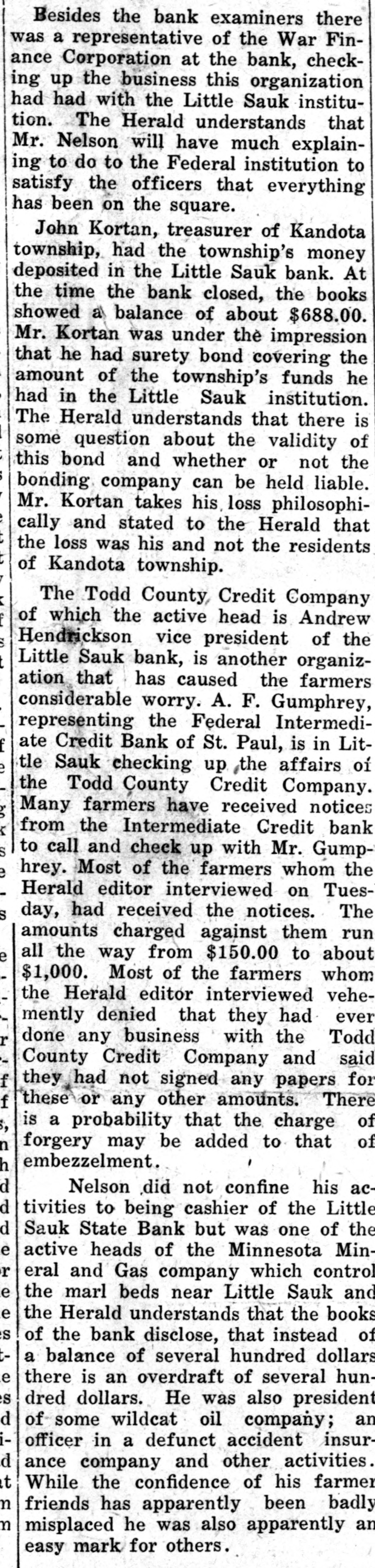 Besides the bank examiners there was a representative of the War Finance Corporation at the bank, checking up the business this organization had had with the Little Sauk institution. The Herald understands that Mr. Nelson will have much explaining to do to the Federal institution to satisfy the officers that everything has been on the square. John Kortan, treasurer of Kandota township, had the township's money deposited in the Little Sauk bank. At the time the bank closed, the books showed a balance of about $688.00. Mr. Kortan was under the impression that he had surety bond covering the amount of the township's funds he had in the Little Sauk institution. The Herald understands that there is some question about the validity of this bond and whether or not the bonding company can be held liable. Mr. Kortan takes his loss philosophically and stated to the Herald that the loss was his and not the residents of Kandota township. The Todd County Credit Company of which the active head is Andrew Hendrickson vice president of the Little Sauk bank, is another organization that has caused the farmers considerable worry. A. F. Gumphrey, representing the Federal Intermediate Credit Bank of St. Paul, is in Little Sauk checking up the affairs of the Todd County Credit Company. Many farmers have received notices from the Intermediate Credit bank to call and check up with Mr. Gumphrey. Most of the farmers whom the Herald editor interviewed on Tuesday, had received the notices. The amounts charged against them run all the way from $150.00 to about $1,000. Most of the farmers whom the Herald editor interviewed vehemently denied that they had ever r done any business with the Todd County Credit Company and said they had not signed any papers for f these or any other amounts. There is a probability that the charge of n forgery may be added to that of embezzelment. h d Nelson did not confine his acd tivities to being cashier of the Little d Sauk State Bank but was one of the e active heads of the Minnesota Minr eral and Gas company which control e the marl beds near Little Sauk and e the Herald understands that the books S of the bank disclose, that instead of : a balance of several hundred dollars e there is an overdraft of several hunS dred dollars. He was also president d of some wildcat oil company; an T officer in a defunct accident insurd ance company and other activities. t While the confidence of his farmer n friends has apparently been badly n misplaced he was also apparently an easy mark for others.