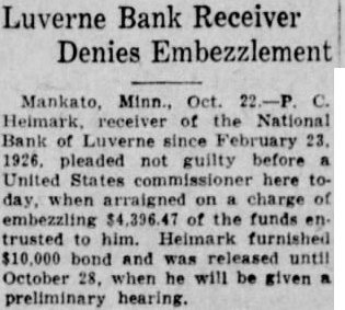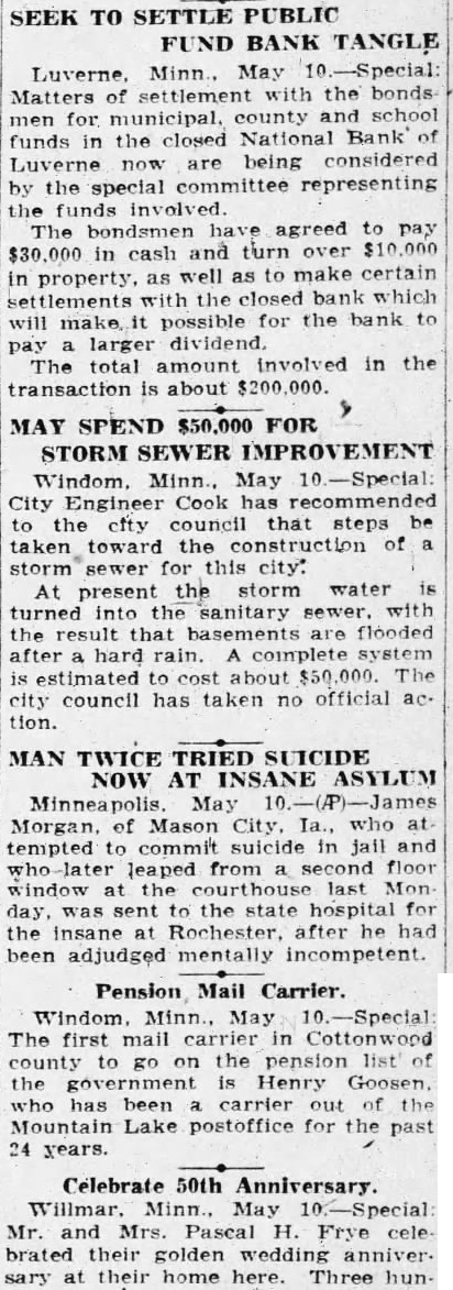 SEEK TO SETTLE PUBLIC FUND BANK TANGLE Matters of with the bonds for county and school men funds in the closed National Bank of Luverne now are being considered by the special committee representing the funds The agreed to $30,000 in cash and turn over $10,000 in property. as well as to make certain the bank which will make for the bank to pay larger The total amount involved in the transaction is about MAY SPEND $50,000 FOR STORM SEWER Windom. Minn., May City Engineer Cook has recommended the city council that steps be taken the of storm sewer this city: At present the storm water turned into the sanitary with the that basements flooded after hard complete system estimated cost about The city council has taken no official tion. MAN TWICE TRIED SUICIDE NOW AT INSANE ASYLUM Minneapolis. May Morgan. of Mason City, Ia., who at tempted to commit suicide in jall and leaped from second floor window the courthouse Mon day, was the state hospital the insane Rochester, after he had been adjudged mentally incompetent. Pension Mail Carrier. Windom. Minn. May The first carrier Cottonwood county to go on the pension list the Henry Goosen, been carrier out Mountain Lake postoffice for the past 24 years. Celebrate 50th Anniversary. Willmar. Minn., May Mr. Mrs. Pascal H. Frye brated their golden wedding anniverat their home here. Three