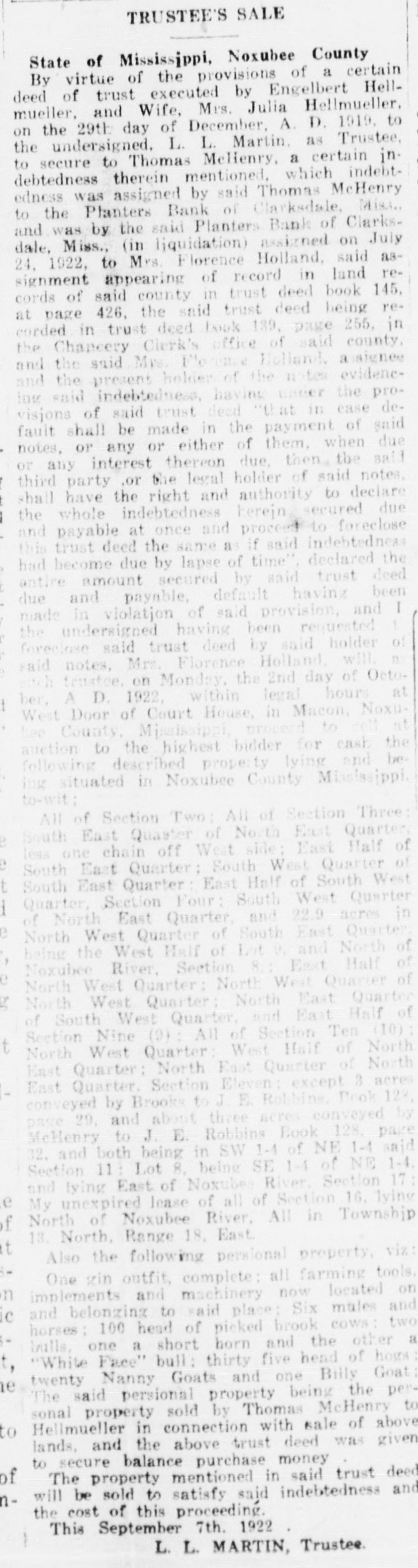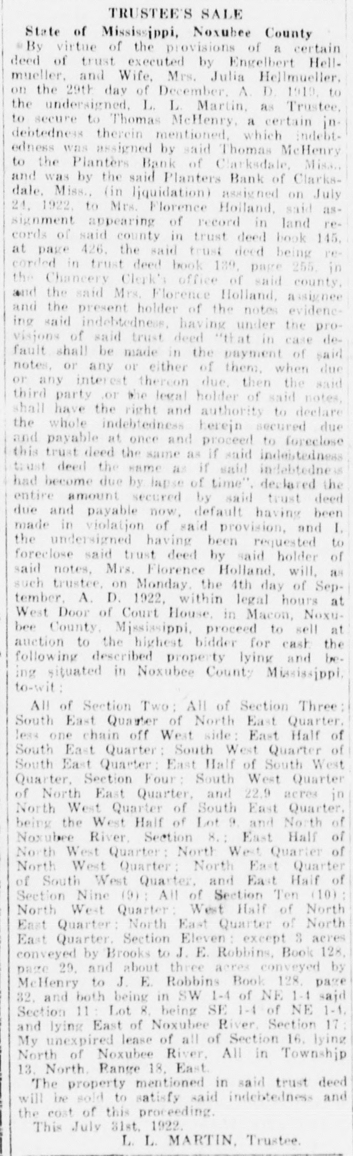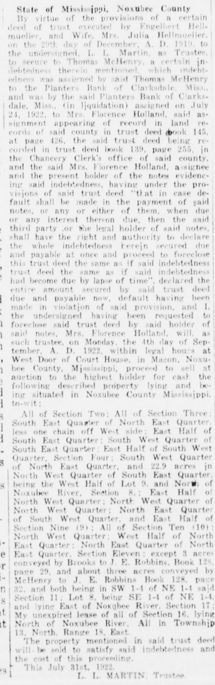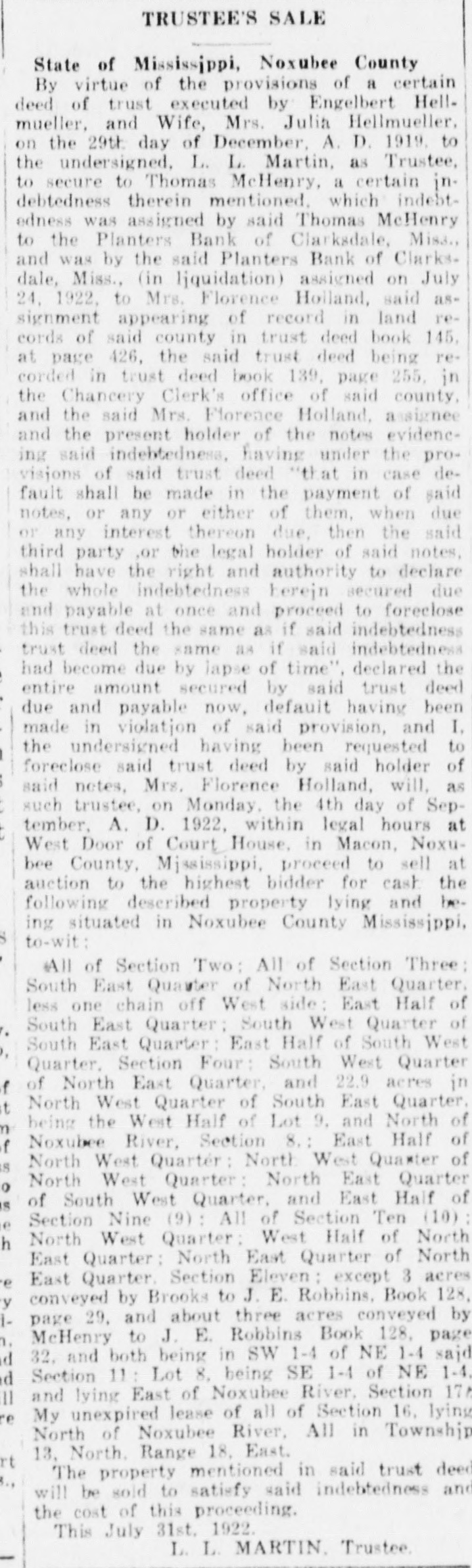 TRUSTEE'S SALE State of Mississippi, Noxubee County By virtue of the provisions of a certain deed of trust executed by Engelbert Hellmueller, and Wife, Mrs. Julia Hellmueller. on the 29th day of December. A. D. 1919. to the undersigned, L. L Martin, as Trustee, to secure to Thomas McHenry, a certain indebtedness therein mentioned, which indebtedness was assigned by said Thomas McHenry to the Plantèrs Bank of Clarksdale, Misa.. and was by the said Planters Bank of Clarksdale. Miss., (in liquidation) assigned on July 24, 1922. to Mrs. Florence Holland, said assignment appearing of record in land records of said county in trust deed book 145, at page 426, the said trust deed being recorded in trust deed book 139, page 255, in the Chancery Clerk's office of said county. and the said Mrs. Florence Holland, assignee and the present holder of the notes evidencing said indebtedness. having under the provisions of said trust deed "that in case default shall be made in the payment of said notes, or any or either of them. when due or any interest thereon due, then the said third party .or the legal holder of said notes, shall have the right and authority to declare the whole indebtedness herejn secured due and payable at once and proceed to foreclose this trust deed the same as if said indestedness trust deed the same as if said indebtedness had become due by lapse of time". declared the entire amount secured by said trust deed due and payable now, default having been made in violatjon of said provision, and I. the undersigned having been requested to foreclose said trust deed by said holder of said notes, Mrs. Florence Holland, will, as such trustee, on Monday. the 4th day of September, A. D. 1922, within legal hours at West Door of Court House, in Macon, Noxubee County. Mjssissippi, proceed to sell at auction to the highest bidder for cash the following described property lying and being situated in Noxubee County Mississippi, to-wit: All of Section Two: All of Section Three: South East Quaster of North East Quarter. less one chain off West side: East Half of South East Quarter: South West Quarter of South East Quarter: East Half of South West Quarter, Section Four: South West Quarter of North East Quarter, and 22.9 acres in North West Quarter of South East Quarter, being the West Half of Lot 9. and North of Noxubee River. Section 8.: East Half of North West Quarter: North West Quarter of North West Quarter: North East Quarter of South West Quarter, and East Half of Section Nine (9): All of Section Ten (10) : North West Quarter: West Half of North East Quarter: North East Quarter of North East Quarter. Section Eleven : except 3 acres conveyed by Brooks to J. E. Robbins, Book 128, page 29. and about three acres conveyed by McHenry to J. E. Robbins Book 128. page 32. and both being in SW 1-4 of NE 1-4 said Section 11 : Lot 8. being SE 1-4 of NE 1-1, and lying East of Noxubee River. Section 17: My unexpired lease of all of Section 16. lying North of Noxubee River, All in Township 13. North. Range 18, East. The property mentioned in said trust deed will be sold to satisfy said indebtedness and the cost of this proceeding. This July 31st. 1922. L. L. MARTIN, Trustee.