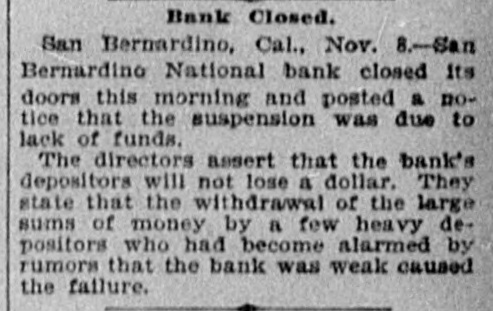 Bank Closed. San Bernardino, Cal., Nov. 8.-San Bernardino National bank closed Its doors this morning and posted a notice that the suspension was due to lack of funds. The directors assert that the bank's depositors will not lose a dollar. They state that the withdrawal of the large sums of money by a few heavy depositors who had become alarmed by rumors that the bank was weak caused the failure.