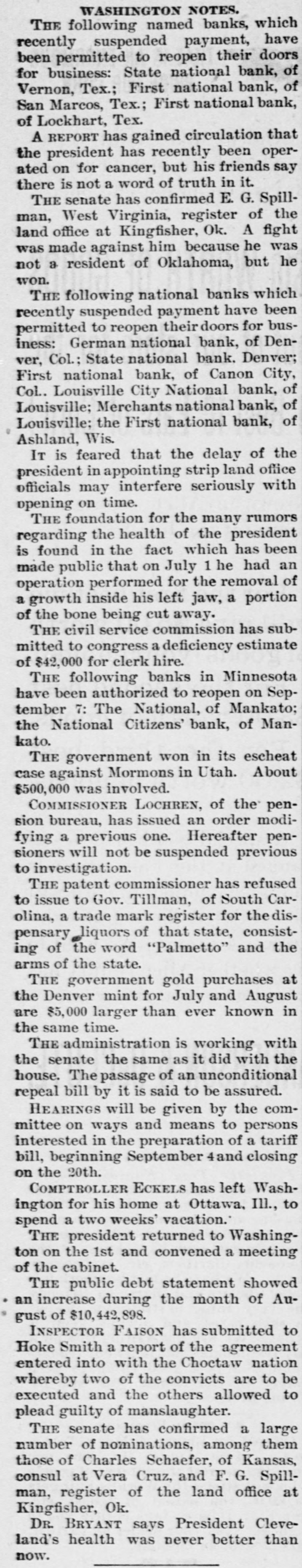 WASHINGTON NOTES. THE following named banks, which recently suspended payment, have been permitted to reopen their doors for business: State national bank, of Vernon, Tex.; First national bank, of San Marcos, Tex.; First national bank, of Lockhart, Tex. A REPORT has gained circulation that the president has recently been operated on for cancer, but his friends say there is not a word of truth in it. THE senate has confirmed E. G. Spillman, West Virginia, register of the land office at Kingfisher, Ok. A fight was made against him because he was not a resident of Oklahoma, but he won. THE following national banks which recently suspended payment have been permitted to reopen their doors for busIness: German national bank, of Denver, Col.; State national bank. Denver; First national bank, of Canon City, Col.. Louisville City National bank, of Louisville; Merchants national bank, of Louisville: the First national bank, of Ashland, Wis. IT is feared that the delay of the president in appointing strip land office officials may interfere seriously with opening on time. THE foundation for the many rumors regarding the health of the president is found in the fact which has been made public that on July 1 he had an operation performed for the removal of a growth inside his left jaw, a portion of the bone being cut away. THE civil service commission has submitted to congress a deficiency estimate of $42,000 for clerk hire. THE following banks in Minnesota have been authorized to reopen on September 7: The National, of Mankato; the National Citizens' bank, of Mankato. THE government won in its escheat case against Mormons in Utah. About $500,000 was involved. COMMISSIONER LOCHREN, of the pension bureau, has issued an order modifying a previous one. Hereafter pensioners will not be suspended previous to investigation. THE patent commissioner has refused to issue to Gov. Tillman, of South Carolina, a trade mark register for the dispensary liquors of that state, consisting of the word "Palmetto" and the arms of the state. THE government gold purchases at the Denver mint for July and August are $5,000 larger than ever known in the same time. THE administration is working with the senate the same as it did with the house. The passage of an unconditional repeal bill by it is said to be assured. HEARINGS will be given by the committee on ways and means to persons interested in the preparation of a tariff bill, beginning September 4and closing on the 20th. COMPTROLLER ECKELS has left Washington for his home at Ottawa, Ill., to spend a two weeks' vacation. THE president returned to Washington on the 1st and convened a meeting of the cabinet. THE public debt statement showed an increase during the month of August of $10,442,898. INSPECTOR FAISON has submitted to Hoke Smith a report of the agreement entered into with the Choctaw nation whereby two of the convicts are to be executed and the others allowed to plead guilty of manslaughter. THE senate has confirmed a large number of nominations, among them those of Charles Schaefer, of Kansas, consul at Vera Cruz, and F. G. Spillman, register of the land office at Kingfisher, Ok. DR. BRYANT says President Cleveland's health was never better than now.
