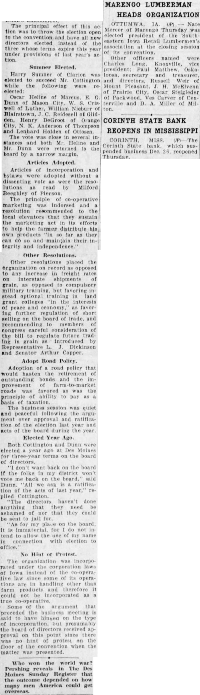 OTTUMWA. IA. (AP) Nate Mercer of Marengo Thursday was elected president of the Southeastern Iowa Retail Lumbermen's association at the closing session its convention. Other officers named were Charles Long. Knoxville, vice Summer Elected. Harry Summer of Clarion was loosa. secretary and treasurer, elected to succeed Mr. Cottington and directors. Russell Weir of while the following were re Mount Pleasant H. McElvenn elected: of Prairie City, Oscar Steigleder Oscar Heline of Marcus. E. G. of Packwood. Ves Carver of Cen Dunn of Mason City, W. S. Cris terville and D. A. Miller of Milwell of Luther, William Nieburr of ton. Blairstown. C. Reidesell of Glidden, Henry DeGroot of Orange CORINTH STATE BANK City, N. K. Anderson of Thompson and Lenhard Holden of Ottosen. REOPENS IN MISSISSIPPI The vote was close in several instances and both Mr. Heline and Corinth State bank. which Mr. Dunn were returned to the pended business Dec. 26, reopened board by narrow margin. Thursday