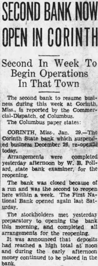 CORINTH, Jan. Corinth State bank which suspendbusiness December 26, today. Arrangements were completed yesterday afternoon by W. B. Pollard, state bank examiner, for the reopening. The bank was closed because of run and was the second to reopen here within week. The First National Bank opened again last Saturday. The stockholders met yesterday preparatory to opening bank this morning, and completed all arrangements for the reopening. was announced that deposits had reached high total at noon and during the early afternoon money continued to be placed in the bank.