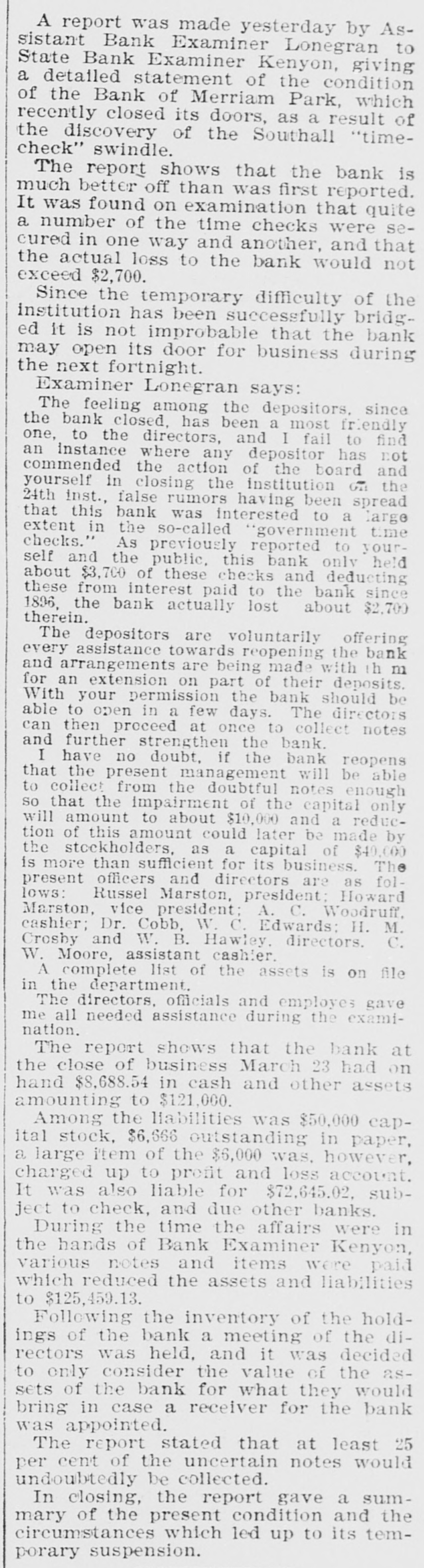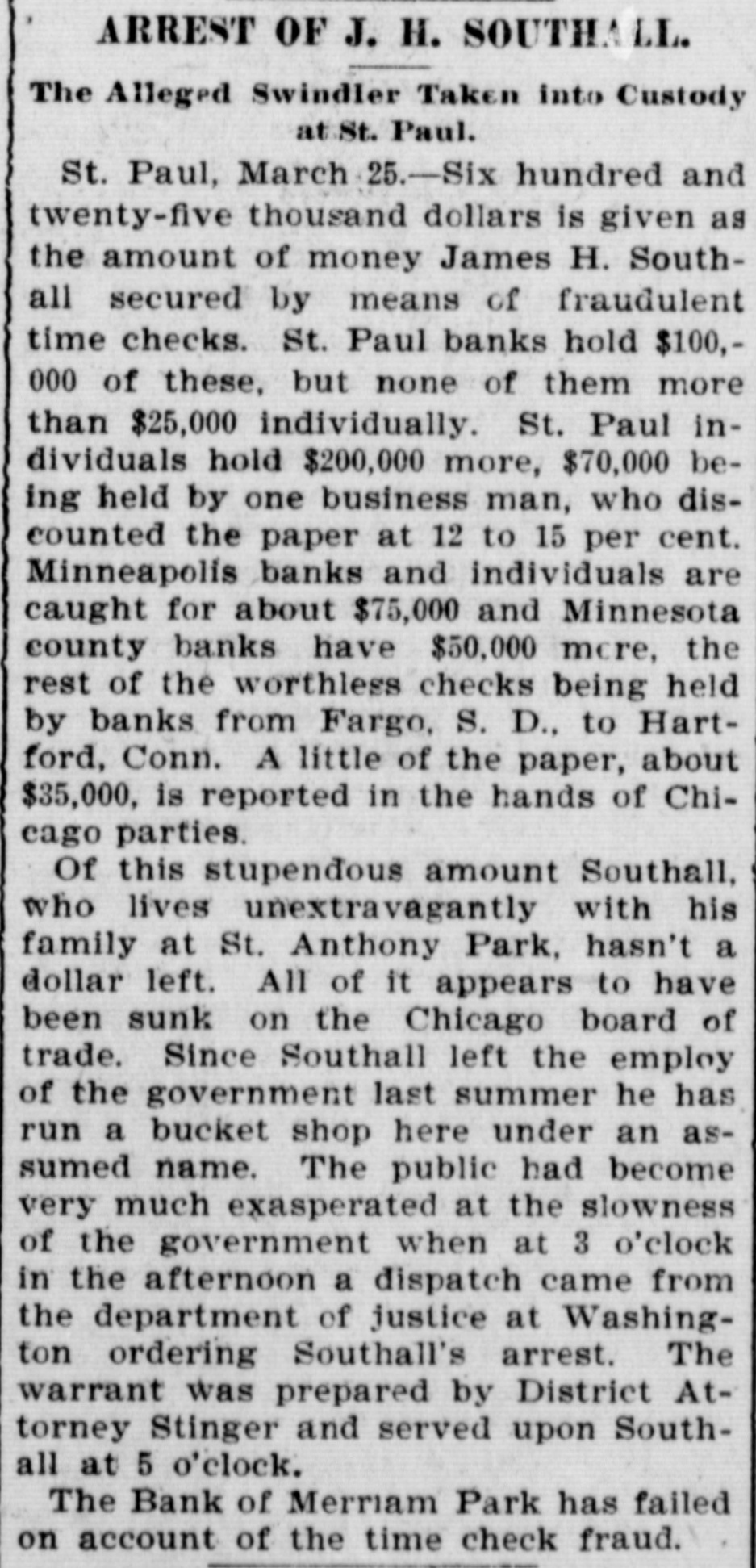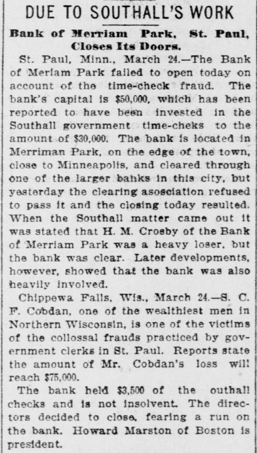 DUE TO SOUTHALL'S WORK Bank of Merriam Park, St. Paul, Closes Its Doors. St. Paul, Minn., March 24.-The Bank of Merlam Park failed to open today on account of the time-check fraud. The bank's capital is $50,000, which has been reported to have been invested in the Southall government time-cheks to the amount of $30,000. The bank is located in Merriman Park, on the edge of the town, close to Minneapolis, and cleared through one of the larger bahks in this city, but yesterday the clearing asosciation refused to pass it and the closing today resulted. When the Southall matter came out it was stated that H. M. Crosby of the Bank of Merriam Park was a heavy loser, but the bank was clear. Later developments, however, showed that the bank was also heavily involved. Chippewa Falls, Wis., March 24.-S. C. F. Cobdan, one of the wealthiest men in Northern Wisconsin, is one of the victims of the collossal frauds practiced by government clerks in St. Paul. Reports state the amount of Mr. Cobdan's loss will reach $75,000. The bank held $3,500 of the outhall checks and is not insolvent. The directors decided to close, fearing a run on the bank. Howard Marston of Boston is president.