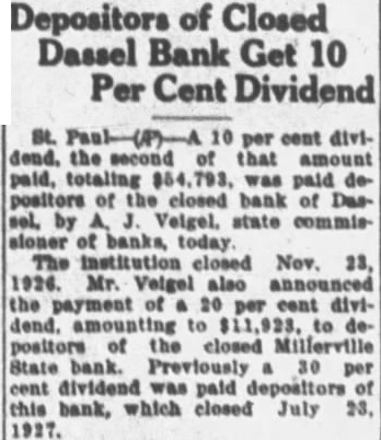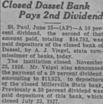Closed Dassel Bank Pays 2nd Dividend Paul, percent second that paid, paid of the closed bank Dassel, by Viegel, state comof banks, today. The closed November 1926. Mr. also payment percent dividend, to to depositors the Millerville State bank. percent dividend paid this bank, which closed July 1927.