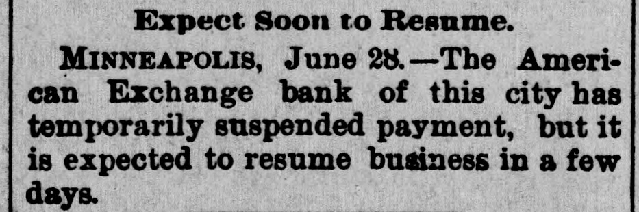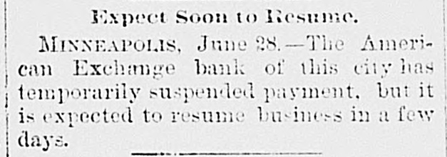 Expect Soon to Resume. MINNEAPOLIS, June 28.-The American Exchange bank of this city has temporarily suspended payment, but it is expected to resume business in a few days.