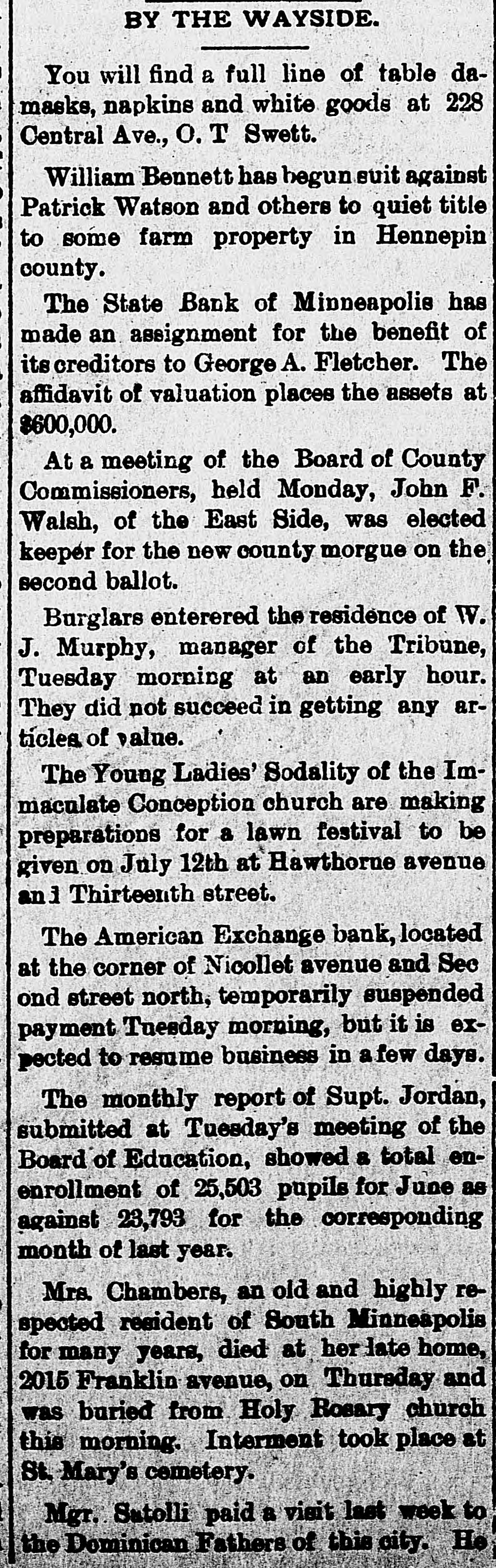 BY THE WAYSIDE. You will find a full line of table damasks, napkins and white goods at 228 Central Ave., O. T Swett. William Bennett has begun suit against Patrick Watson and others to quiet title to some farm property in Hennepin county. The State Bank of Minneapolie has made an assignment for the benefit of its creditors to George A. Fletcher. The affidavit of valuation places the assets at $600,000. At a meeting of the Board of County Commissioners, held Monday, John F. Walsh, of the East Side, was elected keeper for the new county morgue on the second ballot. Burglars enterered the residence of W. J. Murphy, manager of the Tribune, Tuesday morning at an early hour. They did not succeed in getting any articlea of value. The Young Ladies' Sodality of the Immaculate Conception church are making preparations for a lawn festival to be given on July 12th at Hawthorne avenue ani Thirteenth street. The American Exchange bank, located at the corner of Nicollet avenue and Sec ond street north, temporarily suspended payment Tuesday morning, but it is expected to resume business in afew days. The monthly report of Supt. Jordan, submitted at Tuesday's meeting of the Board of Education, showed a total enenrollment of 25,503 pupils for June as against 23,793 for the corresponding month of last year. Mrs. Chambers, an old and highly respected resident of South Minneapolis for many years, died at her late home, 2015 Franklin avenue, on Thursday and was buried from Holy Rosary church this morning. Interment took place at St. Mary's cemetery. Mgr. Satolli paid a visit last week to the Dominican Fathers of this city. He