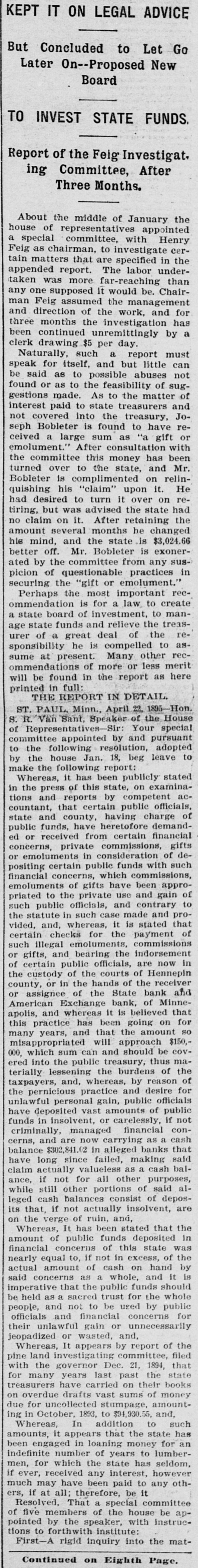 But Concluded to Let Go Later On--Proposed New Board TO INVEST STATE FUNDS. Report of the Feig Investigat. ing Committee, After Three Months. About the middle of January the of representatives appointed a committee, as chairman, to Feig house special investigate with Henry cer- the tain matters that are specified in report. The was more appended taken far-reaching labor under- than any one supposed it would be. Chairman Feig assumed the management and direction of the work, and for months the has a continued three been unremittingly investigation by clerk drawing $5 per day. such a report must for itself, and but can speak Naturally, abuses little be said as to possible not or as to the feasibility of sug- of made. As to the gestions interest found treasurers matter paid to state and Jonot covered into the treasury, reseph Bobleter is found to have ceived a large sum as "a gift or After consultation with committee this money emolument." the has and been Mr. turned over to the state, is complimented on relin- He his "claim' upon quishing Bobleter it. had desired to turn it over on rebut was advised the state had the on it. After no tiring, claim retaining changed amount several months he and the state is $3,024.66 off. Mr. Bobleter is his better mind, exonerated by the committee from any sus- in picion of questionable practices securing the "gift or emolument." Perhaps the most important recis for a law to create of investment, ommendation state board the to treas- mana state funds and relieve reage of a great deal of the assponsibility urer he is compelled to recsume at present. Many other merit ommendations of more or less here will be found in the report as printed THE in REPORT full: IN DETAIL. PAUL, Minn., April 22. 1895-Hon. House ST. R. Van Sant, Speaker of the special S. Representatives-S Your committee of appointed by and pursuant adopted following resolution, to to the the house Jan. 18, beg leave make by the following report: Whereas, it has been publicly examina- stated the press of this state, on acin and reports by competent countant, tions that certain public officials, of and county, having charge demandstate funds, have heretofore financial public received from certain gifts ed or private commissions, dein such or certain public funds positing concerns, emoluments consideration commissions, with of concerns, which of gifts have of to the private use to financial emoluments priated been and contrary gain appropublic officials, and in such case made pro- that whereas, it is of such vided, the statute and, payment stated and checks for the emoluments, and bearing the in such certain gifts, illegal commissions indorsement now or public officials, are of certain custody of the courts of Hennepin county, the or in the hands of the bank receiver and assignee of the State Minneor Exchange bank, of that and whereas it is for apolis, American going believed on practice has been so this years, and that the amount $150,many misappropriated will approach should be covwhich sum can and thus ma000, ered into the public treasury, of the terially lessening the burdens reason of taxpayers, and, whereas, by desire for pernicious practice and officials unlawful the personal gain, public public deposited vast amounts of if not have funds in insolvent, or carelessly, conmanaged cash and are now carrying as a that cerns, criminally, financial banks $302,841.02 in alleged said balance long since failed, making claim have actually valueless as a cash balif not for all other purposes, said alance, while still other portions of cash balances consist of depos- are its leged that, if not actually insolvent, on the verge of ruin, and, Whereas, It has been stated that the amount of public funds deposited was in financial concerns of this state the nearly equal to, if not in excess, hand of by actual amount of cash on it is as a whole, and that the public whole sacred trust for the imperative be said held concerns as funds should public and not to be used by for and financial unlawful gain or their people, officials and, unnecessarily concerns jeopadized or wasted, Whereas, It appears by report of filed the land investigatir committee, that pine with the governor Dec. 21, 1894, state years last past books have carried on treasurers for many their the of money overdue drafts vast sums due on for uncollected stumpage, amount- and, ing in October, 1893, to $94,930.55, Whereas, In addition to such it appears that the state has an engaged in loaning indefinite amounts, been money lumber- for number of years to seldom, for which the state has received any men, if ever, interest, however othmuch may have been paid to any ers, if at all; therefore, be it Resolved, That a special committee five members of the house instruc- be appointed of by the speaker, with tions to forthwith institute: First-A rigid inquiry into the matContinued on Eighth Page.
