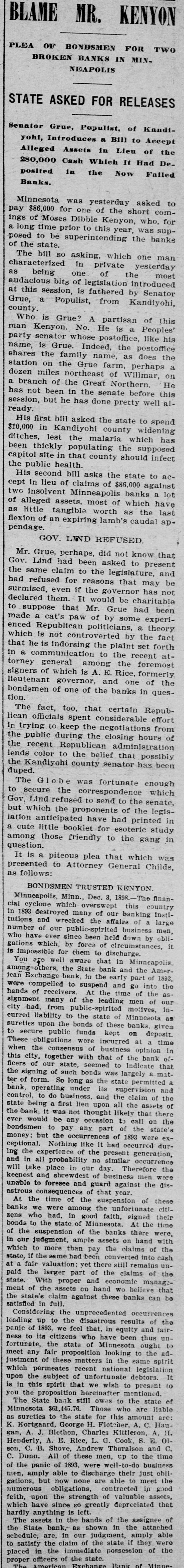 BLAME MR. PLEA OF BONDSMEN FOR TWO BROKEN BANKS IN MINNEAPOLIS STATE ASKED FOR RELEASES Senator Grue, Populist, of Kandiyohl, Introduces a Bill to Accept Alleged Assets in Lieu of the 280,000 Cash Which It Had Deposited in the Now Failed Banks. Minnesota was yesterday asked to pay $86,000 for one of the short comings of Moses Dibble Kenyon, who, for a long time prior to this year, was supposed to be superintending the banks of the state. The bill SO asking, which one man as characterized in private yesterday being one of the most audacious bits of legislation introduced at this session, is fathered by Senator Grue, a Populist, from Kandiyohi, county Who is Grue? A partisan of this man Kenyon. No. He is a Peoples' party senator whose postoffice, like his name, is Grue. Indeed, the postoffice shares the family name, as does the station on the Grue farm, perhaps a dozen miles northeast of Willmar, on a branch of the Great Northern He has not been in the senate before this session, but he has done pretty well already His first bill asked the state to spend $10,000 in Kandivohi county widening ditches, lest the malaria which has been thickly populating the supposed capitol site in that county should infect the public health. His second bill asks the state to accept in lieu of claims of $86,000 against two insolvent Minneapolis banks a lot of alleged assets, most of which have as little tangible worth as the last flexion of an expiring lamb's caudal appendage. GOV. LIND REFUSED Mr. Grue, perhaps, did not know that Gov. Lind had been asked to present the same claim to the legislature, and had refused for reasons that may be surmised, even if the governor has not declared them. It would be charitable to suppose that Mr. Grue had been made a cat's paw of by some experienced Republican politicians, a theory which is not controverted by the fact that he is indorsing the plaint set forth in a communication to the recent attorney general among the foremost signers of which is A. E. Rice, formerly lieutenant governor, and one of the bondsmen of one of the banks in question. The fact, too, that certain Republican officials spent considerable effort in trying to keep the negotiations from the public during the closing hours of the recent Republican administration lends color to the belief that possibly the Kandiyohi county senator has been duped. The G lobe was fortunate enough to secure the correspondence which Gov. Lind refused to send to the senate, but which the proponents of the legislation anticipated have had printed in a cute little booklet for esoteric study among those friendly to the gang in question. It is piteous plea that which was presented to Attorney General Childs, as follows: BONDSMEN TRUSTED KENYON Minneapolis Minn.. Dec. 3. 1898.-The financial cyclone which overswept this country in 1893 destroyed many of our banking institutions and wrecked the affairs large number of our public-spirited business men, who have ever since been held down by obliit gations which, by force of circumstances, is impossible for them to discharge You are well aware that in Minneapolis, among others, the State bank and the American Exchange bank. in the early part of 1893, were compelled to suspend and go into the hands of receivers. At the time of the assignment many of the leading men of our city had, from public-spirited motives, incurred liability to the state of Minnesota as sureties upon the bonds of these banks. given to secure public funds kept on deposit. These obligations were incurred at time when the consensus of business opinion in this city, together with that of the bank officers of our state, seemed to indicate that the signing of such bonds was largely mitter of form. So long as the state permitted a bank, operating under its supervision and control, do business, and the claim of the state being first lien upon all the assets of the bank was not thought likely that there ever would be any occasion to call on the bondsmen to pay any part of the state's money; but the occurrences of 1893 were exceptional. Nothing like it had occurred during the experience of the present generation, and in all probability no similar occurrence will take place in our day. Therefore the keenest and shrewdest of business men were unable to foresee and guard against the disastrous consequences of that year. At the time of the suspension of these banks we were among the unfortunate citizens who had, in good faith, signed their bonds to the state of At the time of the suspension of the banks there were, in our judgment, ample assets on hand with which to more than pay the claims of the state, if the same had been converted into cash fair valuation: yet there still remains unpaid the larger part of the claims of the state With proper and economic management of the assets on hand we believe that the state's claim against these banks can be satisfied in full. Considering the unprecedented leading up to the disastrous results of the panic of 1893 we feel that, in equity and fairness to its citizens who have been thus unfortunate, the state Minnesota ought to meet any fair proposition looking to the adjustment of these matters in the same spirit which permeates recent national legislation It upon the subject of unfortunate debtors. to is in this spirit that we wish to present you the proposition hereinafter mentioned The State bank still owes to the state of Minnesota $61,445.76. Those who are liable as sureties to the state for this amount are: K. Kortgaard, George H. Fletcher, C. Haugan, A. J. Blethen, Charles Kittleson, A. H. Henderly A. E. Rice, G. Cook, E. 01son C. B. Shove. Andrew Theralson and C. C. Dunn. All of these men, U:p to the time of the panic of 1893. were well-to-do business nien, amply able to discharge their just obligations, but now none are able to meet the numerous obligations, contracted in good faith, upon the strength of valuable assets, which have since so greatly depreciated that hardly anythin