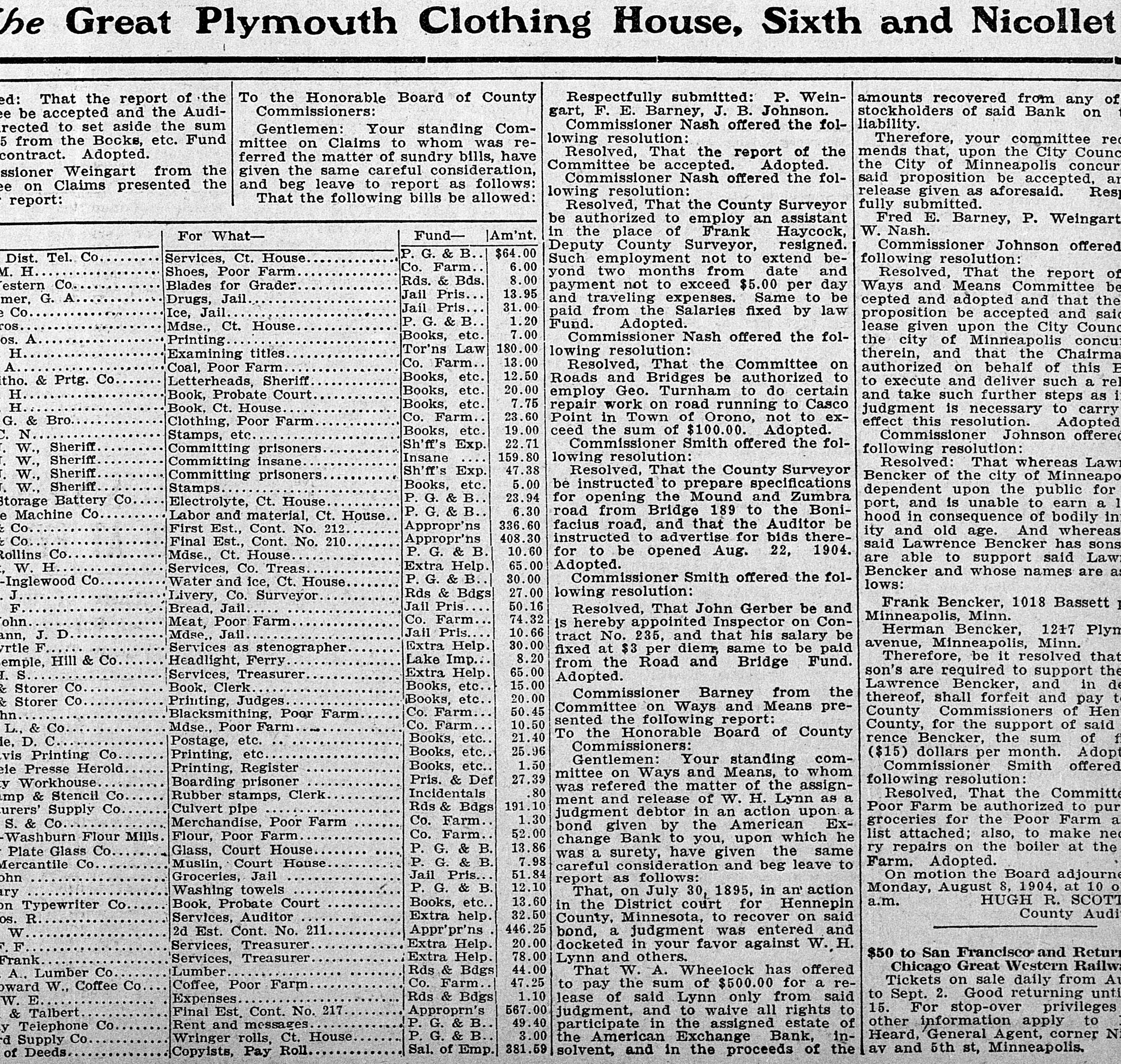 # The Great Plymouth Clothing House, Sixth and Nicollet ed: That the report of the Audi- ee be accepted and the Audi- rected to set aside the sum 5 from the Bocks, etc. Fund contract. Adopted. ssioner Weingart from the ee on Claims presented the - report: To the Honorable Board of County Commissioners: Gentlemen: Your standing Com- mittee on Claims to whom was re- ferred the matter of sundry bills, have given the same careful consideration, and beg leave to report as follows: That the following bills be allowed: Respectfully submitted: P. Weingart, F. E. Barney, J. B. Johnson. Commissioner Nash offered the fol- lowing resolution: Resolved, That the report of the Committee be accepted. Adopted. Commissioner Nash offered the fol- lowing resolution: Resolved, That the County Surveyor be authorized to employ an assistant in the place of Frank Haycock, Deputy County Surveyor, resigned. Such employment not to extend be- yond two months from date and payment not to exceed $5.00 per day and traveling expenses. Same to be paid from the Salaries fixed by law Fund. Adopted. Commissioner Nash offered the fol- lowing resolution: Resolved, That the Committee on Roads and Bridges be authorized to employ Geo. Turnham to do certain repair work on road running to Casco Point in Town of Orono, not to ex- ceed the sum of $100.00. Adopted. Commissioner Smith offered the fol- lowing resolution: Resolved, That the County Surveyor be instructed to prepare specifications for opening the Mound and Zumbra road from Bridge 189 to the Boni- facius road, and that the Auditor be instructed to advertise for bids there- for to be opened Aug. 22, 1904. Adopted. Commissioner Smith offered the fol- lowing resolution: Resolved, That John Gerber be and is hereby appointed Inspector on Con- tract No. 235, and that his salary be fixed at $3 per diem, same to be paid from the Road and Bridge Fund. Adopted. Commissioner Barney from the Committee on Ways and Means pre- sented the following report: To the Honorable Board of County Commissioners: Gentlemen: Your standing com- mittee on Ways and Means, to whom was refered the matter of the assign- ment and release of W. H. Lynn as a judgment debtor in an action upon a bond given by the American Ex- change Bank to you, upon which he was a surety, have given the same careful consideration and beg leave to report as follows: That, on July 30, 1895, in an action in the District court for Hennepin County, Minnesota, to recover on said bond, a judgment was entered and docketed in your favor against W., H. Lynn and others. That W. A. Wheelock has offered to pay the sum of $500.00 for a re- lease of said Lynn only from said judgment, and to waive all rights to participate in the assigned estate of the American Exchange Bank, in- solvent, and in the proceeds of the amounts recovered from any of stockholders of said Bank on liability. Therefore, your committee rec- mends that, upon the City Counc the City of Minneapolis concur said proposition be accepted, ar release given as aforesaid. Res fully submitted. Fred E. Barney, P. Weingart W. Nash. Commissioner Johnson offered following resolution: Resolved, That the report of Ways and Means Committee be cepted and adopted and that the proposition be accepted and said lease given upon the City Counc the city of Minneapolis concur therein, and that the Chairma authorized on behalf of this E to execute and deliver such a rel and take such further steps as i judgment is necessary to carry effect this resolution. Adopted Commissioner Johnson offered following resolution: Resolved: That whereas Lawr Bencker of the city of Minneapo dependent upon the public for port, and is unable to earn a l hood in consequence of bodily in ity and old age. And whereas said Lawrence Bencker has sons are able to support said Law Bencker and whose names are as lows: Frank Bencker, 1018 Bassett p Minneapolis, Minn. Herman Bencker, 1217 Plym avenue, Minneapolis, Minn. Therefore, be it resolved that son's are required to support the Lawrence Bencker, and in de thereof, shall forfeit and pay t County Commissioners of Hen County, for the support of said rence Bencker, the sum of f ($15) dollars per month. Adopt Commissioner Smith offered following resolution: Resolved, That the Committe Poor Farm be authorized to pur groceries for the Poor Farm a list attached; also, to make nec ry repairs on the boiler at the Farm. Adopted. On motion the Board adjourne Monday, August 8, 1904, at 10 o a.m. HUGH R. SCOTT County Audi $50 to San Francisco and Retur Chicago Great Western Railwa Tickets on sale daily from Au to Sept. 2. Good returning unti 15. For stop-over privileges other information apply to Heard, General Agent, corner N lav and 5th st, Minneapolis.