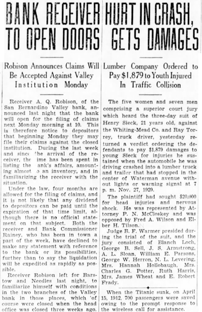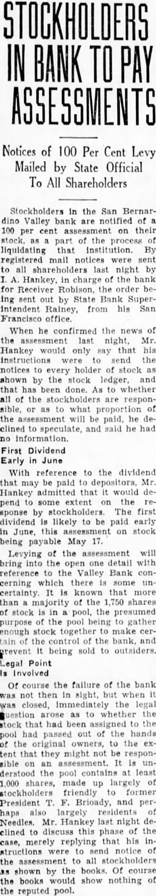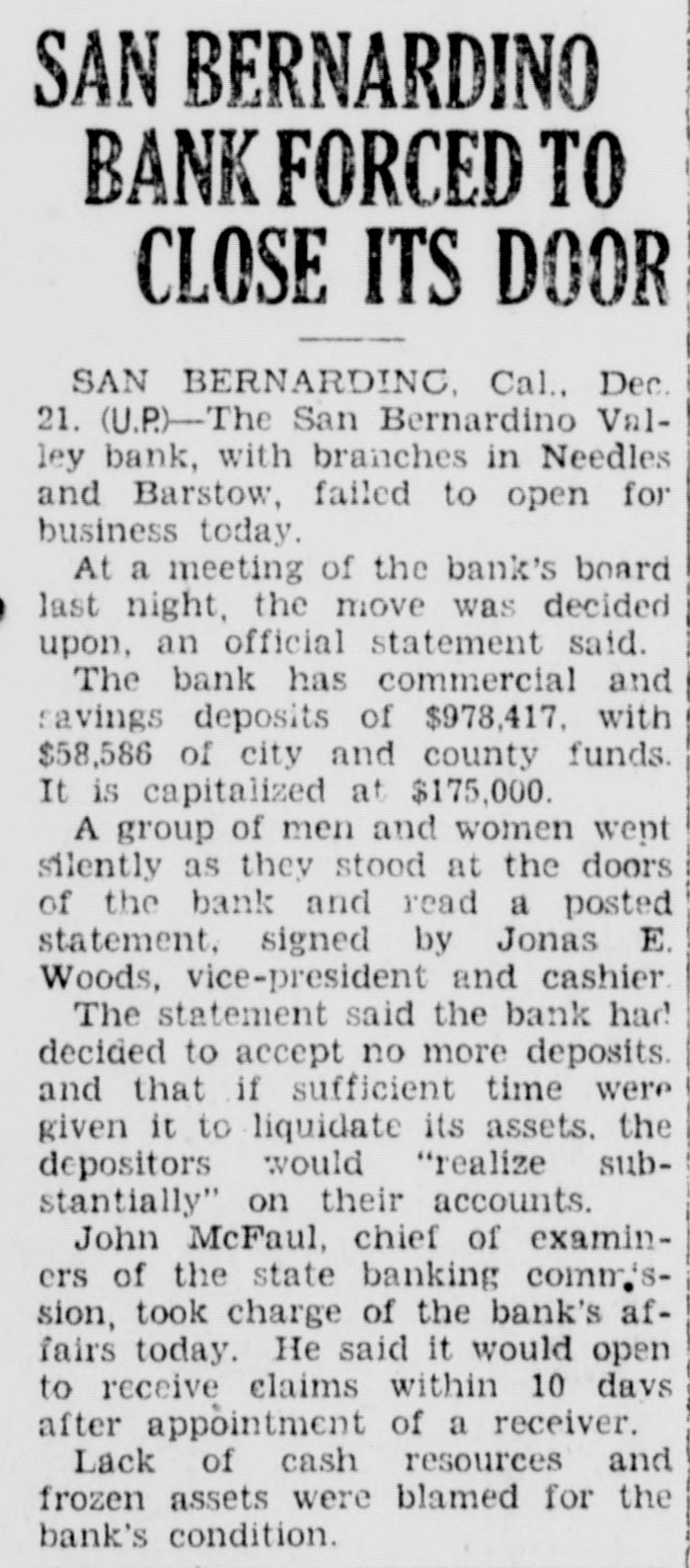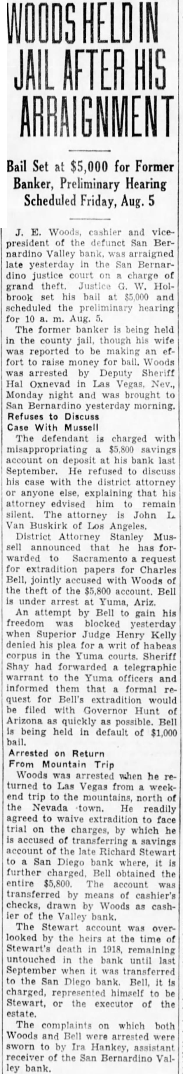 Woods, cashier and vicepresident of San Bernardino Valley bank, arraigned yesterday San Bernardino justice charge of theft Justice Holbrook his bail $5,000 and scheduled hearing for Aug. The former banker is being held in county jail, though reported to be making fort to raise money for bail. arrested by Deputy Sheriff Hal Oxnevad in Las Vegas, Nev., Monday night and brought Bernardino yesterday morning. Refuses Discuss Case Mussell defendant charged with savings account deposit his bank last September. He to discuss his case with the district attorney anyone else, explaining that attorney him remain silent. The attorney John Buskirk of Los Angeles. District Attorney Stanley Musannounced that he has warded Sacramento request for extradition papers for Charles Bell, jointly accused with Woods the theft the $5,800 account. Bell under arrest Yuma, Ariz. An attempt Bell his gain freedom blocked yesterday when Superior Judge Henry Kelly denied his plea for writ of habeas corpus the Yuma Sheriff Shay had forwarded telegraphic warrant the Yuma officers and informed them that formal quest for Bell's extradition would filed with Governor Arizona quickly possible. Bell being held in default of $1,000 bail. Arrested Return From Mountain Trip Woods was arrested when he turned Las Vegas from weekend trip to the mountains, north of the Nevada town. He readily agreed to waive face trial on the charges, by which he accused transferring savings account of the late Richard Stewart San Diego where, further charged. obtained the entire $5,800 The account transferred by means of cashier's checks, drawn by Woods as cashof the Valley bank. The Stewart account was overlooked by the heirs the time Stewart's death 1918, untouched bank until last September was transferred the Diego bank. Bell, charged, represented himself to be Stewart, or the executor the estate. The complaints which both Woods and Bell arrested sworn to Ira Hankey, assistant receiver the San Bernardino Valley bank.
