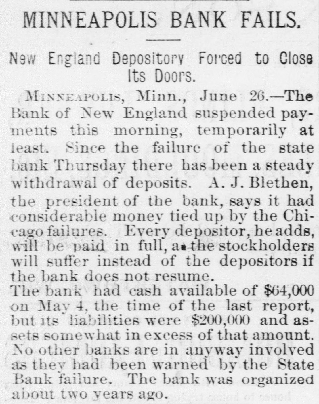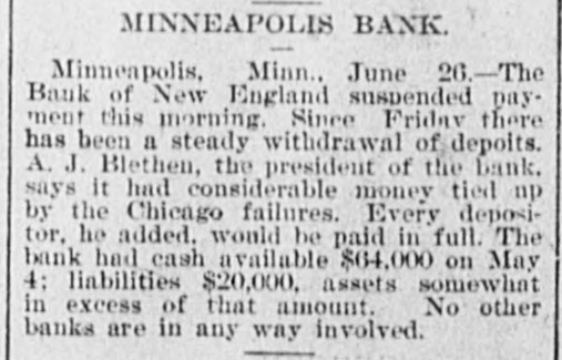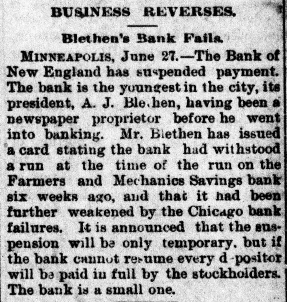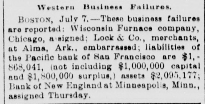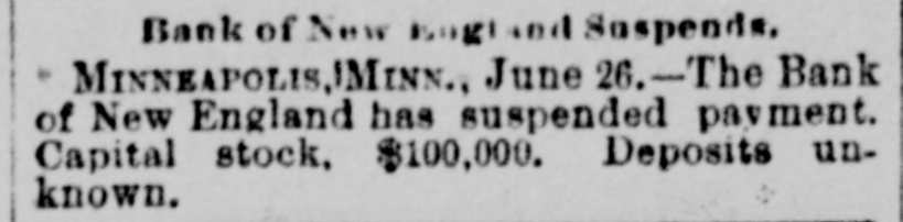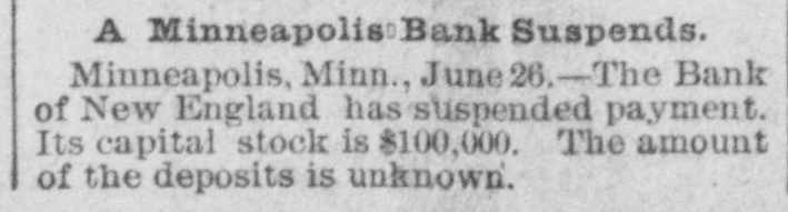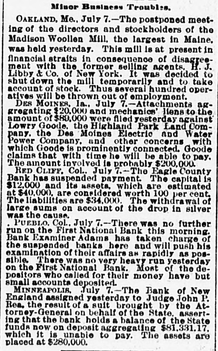 WEST AND SOUTH. THE firm of S. & G. Gump, dealers in art goods at Nan Francisco, made an assignment with liabilities of $140,000. THE death of Rev. W. W, Kone, aged 90 years, occurred at Denison, Tex. He was the oldest Baptist minister in the United States, having entered the ministry at the àge of 18, THE Bank of New England at Minneapolis, Minn, the Sabina (O.) bank and the bank of Ness City, Kan., closed their doors. The governor of Illinois has pardoned Michael Schwab, Samuel Fielden and Oscar Neebe, the anarchists sentenced to state's prison on the charge of complicity In the Haymarket massacre in Chicago May 4, 1886. Fielden and Schawb were sentenced to prison for life and Neebe for fifteen years. IN Detroit Frank Hayes, aged 20 years. was found guilty of murder and sentenced to imprisonment for life. THE Merchants' national bank at Moorhead, Minn., was entered by a masked man who covered the teller with a revolver and secured $2,600. T wo INDIANS, Kozine and Moneypenmy, were found guilty at Madison, Wis, of the murder of Boneash and his squaw last fall. At Lebanon, Ind., William Ransdell was bitten by a tarantula while handling bananas. In the bunch of bananas a bunch of 200 young tarantulas was found. Ransdell may recover, THE state liquor dispensary of South Carolina has begun business and all saloons would soon be closed. THE Savings bank at Fresno, Cal., and the Bank of Commerce at San Diego, Cal., which suspended recently, have resumed business. ON a bicycle H. H. Wyllie made the 1,000 miles from New York to Chicago in ten days and four hours. BERRY won the cowboy race to CHP began at Chadron, Neb., June 13. making the 1,040 miles in 13,days, 15 hours and 35 minutes-an average of 77 miles daily. Wine attempting to escape from the prison at Folsom, Cal., three convicts were shot dead by guards. AT Edinburg, Ill., G. P. Harrington, bankers failed for $200,000. American exchange bank of Minneapolis, Minn., and the Second national bank of Ashland, Ky., closed their doors. THE failure was reported of the Bedford (Ind.) Stone Quarries company, the largest producers of politic lime stone the world