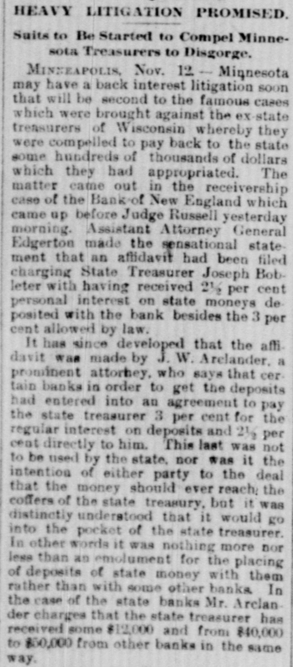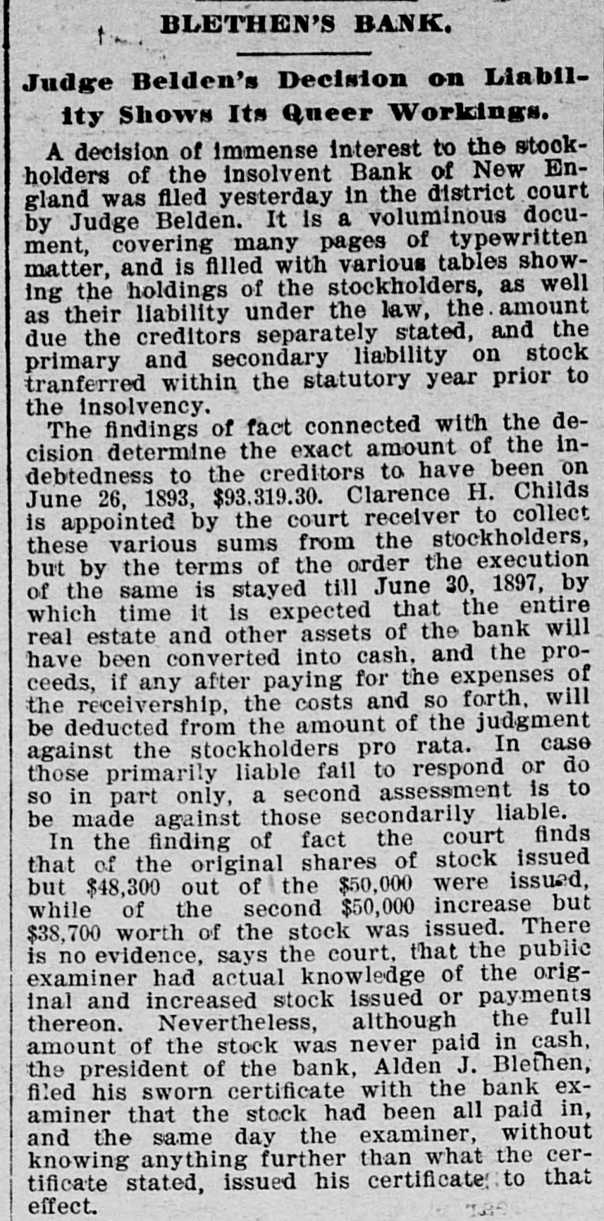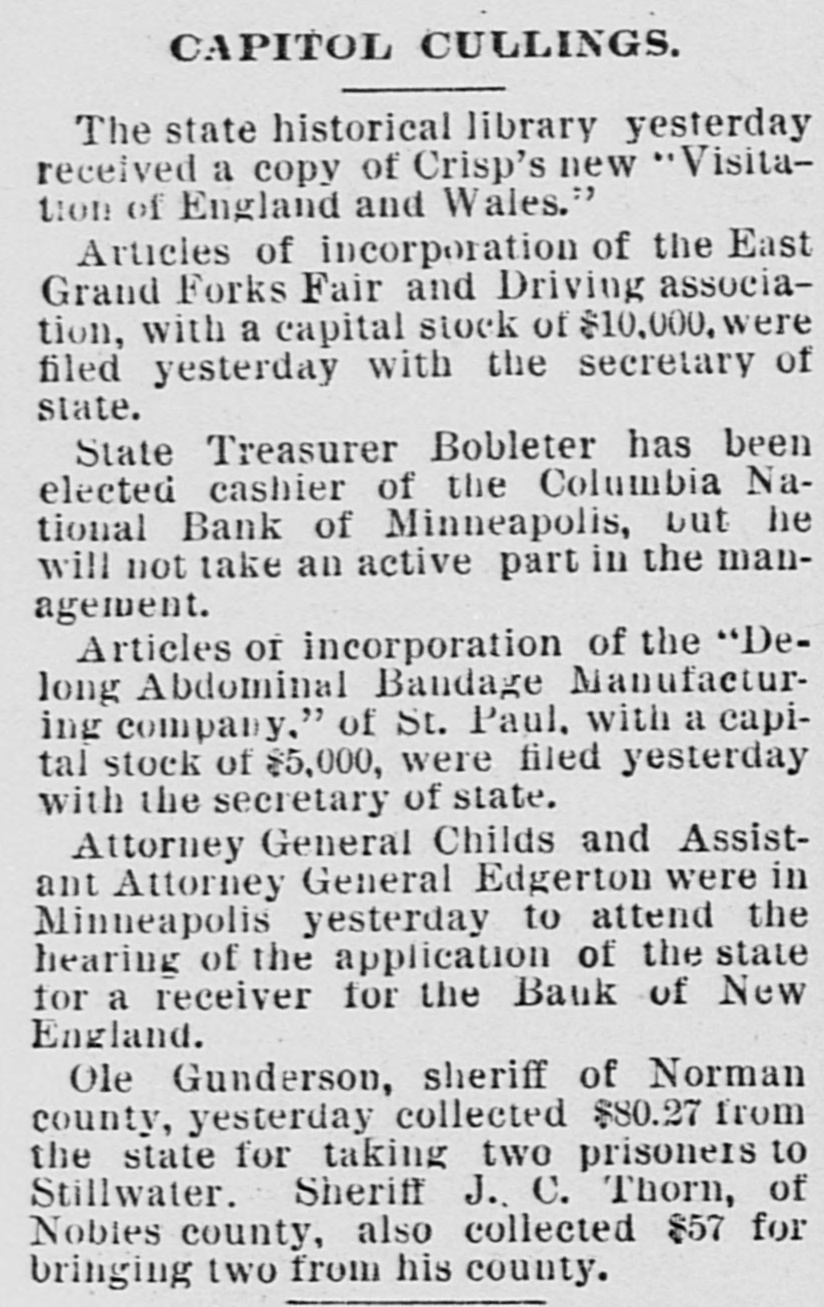 WEST AND SOUTH. THE firm of S. & G. Gump, dealers in art goods at Nan Francisco, made an assignment with liabilities of $140,000. THE death of Rev. W. W, Kone, aged 90 years, occurred at Denison, Tex. He was the oldest Baptist minister in the United States, having entered the ministry at the àge of 18, THE Bank of New England at Minneapolis, Minn, the Sabina (O.) bank and the bank of Ness City, Kan., closed their doors. The governor of Illinois has pardoned Michael Schwab, Samuel Fielden and Oscar Neebe, the anarchists sentenced to state's prison on the charge of complicity In the Haymarket massacre in Chicago May 4, 1886. Fielden and Schawb were sentenced to prison for life and Neebe for fifteen years. IN Detroit Frank Hayes, aged 20 years. was found guilty of murder and sentenced to imprisonment for life. THE Merchants' national bank at Moorhead, Minn., was entered by a masked man who covered the teller with a revolver and secured $2,600. T wo INDIANS, Kozine and Moneypenmy, were found guilty at Madison, Wis, of the murder of Boneash and his squaw last fall. At Lebanon, Ind., William Ransdell was bitten by a tarantula while handling bananas. In the bunch of bananas a bunch of 200 young tarantulas was found. Ransdell may recover, THE state liquor dispensary of South Carolina has begun business and all saloons would soon be closed. THE Savings bank at Fresno, Cal., and the Bank of Commerce at San Diego, Cal., which suspended recently, have resumed business. ON a bicycle H. H. Wyllie made the 1,000 miles from New York to Chicago in ten days and four hours. BERRY won the cowboy race to CHP began at Chadron, Neb., June 13. making the 1,040 miles in 13,days, 15 hours and 35 minutes-an average of 77 miles daily. Wine attempting to escape from the prison at Folsom, Cal., three convicts were shot dead by guards. AT Edinburg, Ill., G. P. Harrington, bankers failed for $200,000. American exchange bank of Minneapolis, Minn., and the Second national bank of Ashland, Ky., closed their doors. THE failure was reported of the Bedford (Ind.) Stone Quarries company, the largest producers of politic lime stone the world