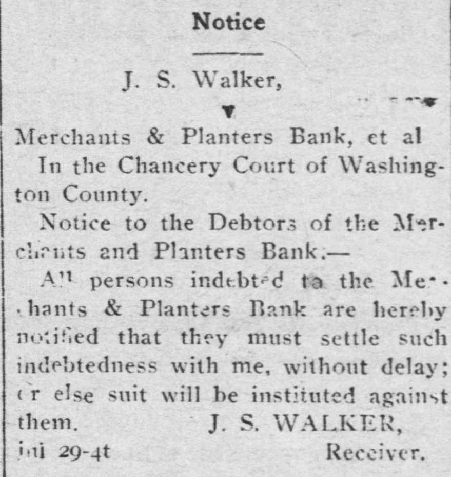 chains to the point of beginning, containing 20 acres more or less, and being the same parcel of land conveyed by D. D. Jackson to Chas. and Jas. Jordan by deed recorded in the office of the clerk of said county in deed book P 3, page 662. And that parcel of land in lot 8, section II, township 18, range 9, west, bounded as follows: commencing at what is known as the back corner of sections II and 12, township 18, range 9, W, thence along the back line of said sec tion, north 52 degrees east 6.60 chains to the corner of lots 7 and 8 of said section, thence along said lot line, north 55 degrees west between lots 7 and 8, 15.06 chains to the south boundary line of said section II, thence south 50 degrees east 15.25 chains to the point of beginning, con taining IO acres more or less. Five acres, more or less, of the N W corner of N W 1/4 section 10, township 18, range 9, county of Washington, State of Mississippi, more particularly described as follows: commencing at a sassafras post established by Harry K. Johnson at the southeast corner of lot II of the Holmes Addition to the city of Greenville, thence running south 33 degrees 50 minutes west along the west side of Theobold avenue of said city 630 feet to the north bank of a bayou, thence 915 feet to the northeast corner of Jordan lot, making a total of 1545 feet to the point of beginning, thence north 23 degrees 10 minutes west 847 feet to a stake at the northwest corner, thence south 55 degrees 15 minutes west 262.07 feet to a stake at the southwest corner, thence south 23 degrees IO minutes east 847 feet to the southeast corner, thence north 55 degrees 15 minutes east 262.07 feet to the point of beginning. The variation used being north 6 degrees 45 minutes west. east 847 feet to the southeast corner, thence 55 degrees 15 minutes east 262.07 feet to the point of beginning. The variation used being north 6 degrees 45 minutes west. W. P. KRETSCHMAR, Receiver for the Merchants and Planters Bank.