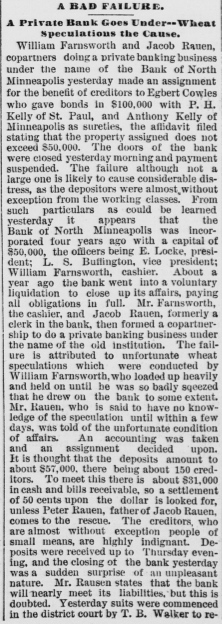 NORTHWESTERN NEWS. The First National Bank of Wapheton closed its doors on March 27th. The difficulty is said to have resulted from advances made the Wahpeton Mill and Elevator company. On the morning of the 27th cashier Hayward declined to accept deposits which were offered, saying the bank could not meet its obligations. He says that in time all creditors and depositors can be paid. but to do SO they will have to realize on all their securities and assess the stockholders $20,000 besides. Dunham & Johnson, of Minneapolis, have had Hayward arrested for failing to remit a $500 collection he had made. As the result of the bank failure,Keller & Goodhue,general store closed and the Wapheton Mill and Elevator property being attached also suspended business. Among the confirmations by the Senate on the 25th were the following: Registers of Land Offices-George W. Warter, Tracy, Minn.: William Smith, Crookston, Minn.: Ralph N. Marble, Duluth, Minu. Receivers of Public Moneys-August Peterson, Worthington, Minn: Philip K. Wiser, Tracy, Minn. Surveyor generai of Nebraska and Iowa, Jonathan F. Gardner. Agent for the Indians of the Omaha and Winnebago agencies, Charles H. Potter. Postmasters -R. C. West, Terry, Iowa; William T. Smith, Oscaloosa, Iowa: James F. Vogt, Lemars, Iowa; S. W. Hobbs, Storm Lake, Iowa; David W. Bossert, Jefferson, Iowa; A. K. Weber, Albia, Iowa. The Grand Army of Dakota held its annual meeting at Watertown on the 24th and 25th. A resolution was adapted asking the legislature to make an appropriation for a soldier's home. The following committee was appointed to look after the matter: First district, S. M. Booth; second, D. M. Gross Yankton; third, C. T. Cement, Fargo; Fourth, B. F. Campbell, Sioux Falls; fifth, A. C. Mellette, Watertown; sixth, W. E. Bentley, Bismarck. Committee at large on home: J. E. Bennett, chairman; B. F. Payne, Gen. J. B. Dennis. Jamestown was selected as the place for the next annual meeting, but another meeting will be held at Mitchell in June when the soldiers and sailor's reunion occurs. At 4 o'clock on the morning of March 28th, fire was discovered in the Northern Pacific railroad shops at Brainerd, Minn. The shops are very large and in two sections, one section being wooden and erected by Jay Cooke when the road first began and the other brick and stone erected by Villard at a cost of a million dollars. The latter were the buildings chiefly used and they were unharmed. The frame buildings were destroyed. The loss is about $100,000 and covered by insurance. No men are thrown out of work by the fire. The Bank of North Minneapolis closed its doors on the 26th. It was organized about four years ago under the Statelaw and was owned at the time of the failure by Wm. Farnsworth and Jacob Rauen. The capital stock was $50,000 and the failure was due to Farnsworth's speculations in wheat. Depositors are not likely to receive much. Jacob Hoffman, owner of the flouring mill at Elba, Winona county, Minn., was drowned with his son, aged 18 years. on March 27th. The wheel of the mill became clogged and they went down into the pit to repair the difficulty, when the gate opened and the water rushed in and drowned them. George Pownall a teamster at South Stillwater was found in a dying condition in his barn on the morning of March 28th from a shot in his head. He died a few hours later. The murder theory is raised but the indications point to suicide. Miss Clara A. Root, a teacher in the public schools at Valley City, D. T., committed suicide on the 26th, by taking carbolic acid. She was sister of Herbert Root, President of the Farmer's Merchants National bank at that place. The court martial to try Capt. Garvey will convene of St. Paul April 6. Lieut. Hinton. Eighteenth infantry, and Sergeant Casey, Company I, of that regiment, have been ordered to St. Paul from Fort Gibson as witnesses. The daily Argus at Fargo, D. T., burned out at 5 A. M., on the 26th. But very little was saved from the building. The loss was $40,000 and insurance $8,000. The paper continued without missing a publication. The gross receipts of the marshal's office in Minnesota for ten years have been $86,000, and net earnings $45,000. The district attorney's office has earned in the past ten years $40,000 gross or $36,000 net. The flood at Elk Point D. T., had not abated on the 24th many miles of farms and homes are under water and the damage cannot be estimated until the waters recede, but it will be large and serious. The largest part of the business houses in Glendive, Mont., were destroyed by fire on the 24th of March. The loss was $35,000 and insurance about $10,000. The fire was incendiary. The bill to permit the First National bank of Shakopee, Minn., to increase its capital
