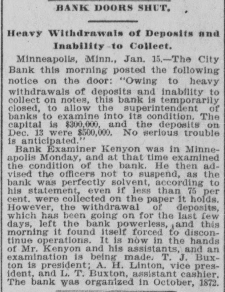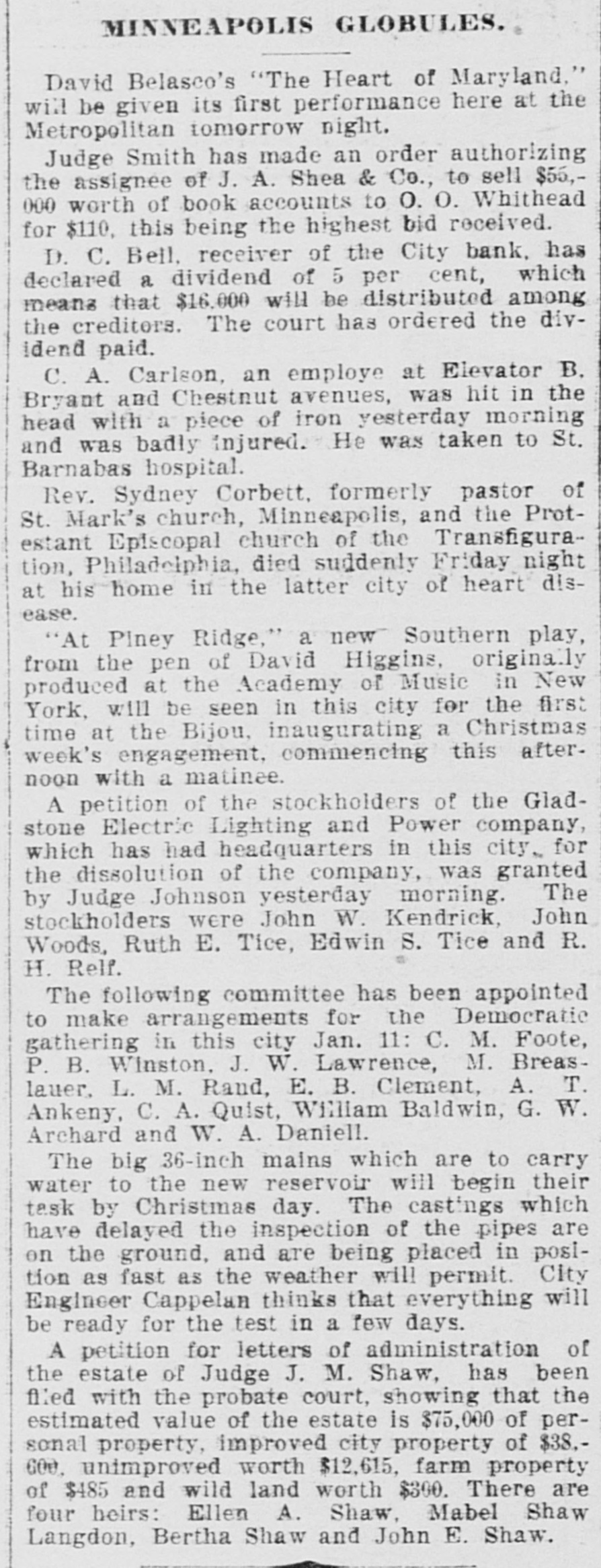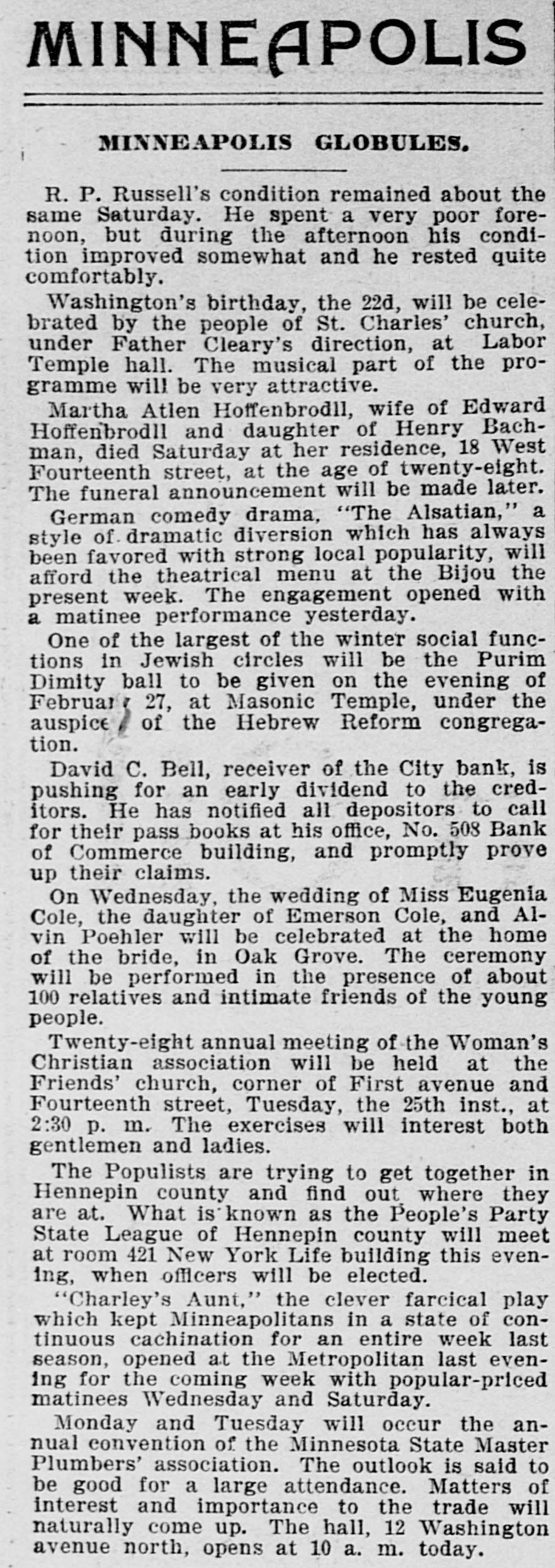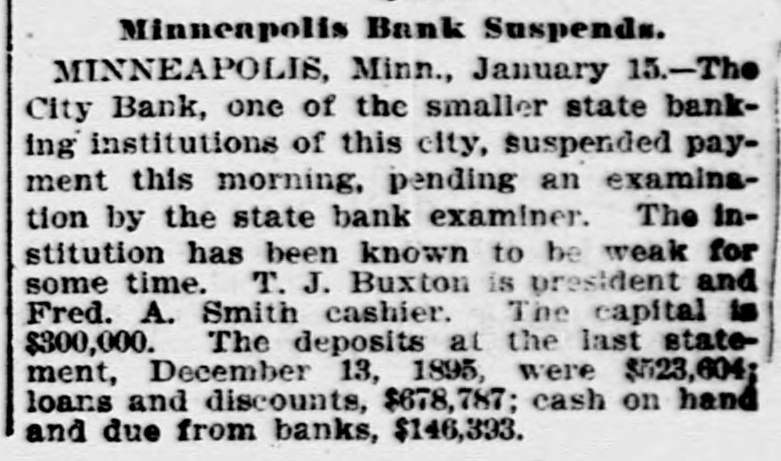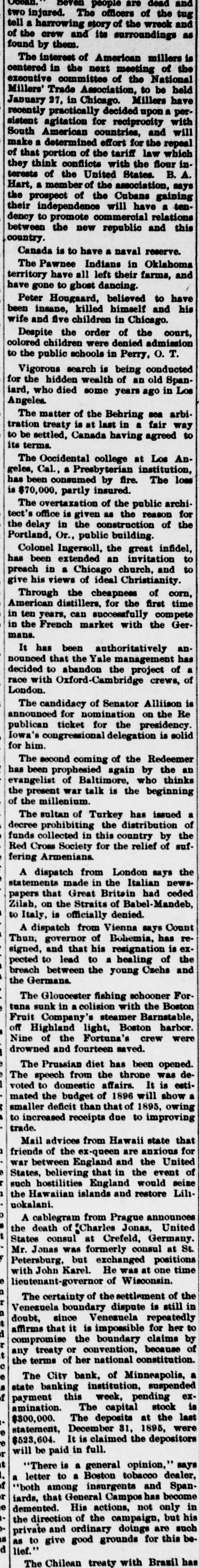 DOMESTIC. The banks at Blue Springs and Stratton, Neb., closed their doors. The Ketcham Lumber company in Chicago made an assignment with liabilities of $275,000. Gov. Upham issued a call for a special session of the Wisconsin legislature to meet February 14 to reapportion the state. A call was issued for all the Christian organizations in the United States to send delegates to a national Christian convention at Washington, D. C., to meet on Saturday, February 22, 1896, to consider the deplorable condition of Armenia. Commander Ballington Booth. who for nine years has been in supreme command of the Salvation Army in the United States, was ordered by his father to return to England. The American Savings and Loan association went into the hands of a receiver at Minneapolis with heavy liabilities. The superintendent of public schools at Perry, O. T., as a last resort to prevent mixed schools ordered every school closed. A new counterfeit $20 bill on the South Bend (Ind.) national bank was in circulation in that city. Charles W. Landell, manufacturer of glazed kid and morocco leather in Philadelphia, failed for $150,000. Brig. Gen. Charles A. Heckman. a veteran of the Mexican war and the rebellion, died at his home in Germantown, Pa., aged 73 years. The business portion of Pleasant Green, Mo., was destroyed by fire. In a family quarrel at their home near Jonesboro, Tenn., Joseph P. Dove and one of his sons and a daughter were killed. The government bond syndicate organized in New York by J. P. Morgan & Co., was dissolved. The failure of Keen, Sutterlee & Co., leather dealers in Philadelphia, for $4,000,000, carried down four other dealcrs, with aggregate liabilities of $400,000. The Bank of Wauneta, Neb., failed to open its doors. After a cataleptic sleep of seven years, William Depue, a prominent citizen of Bushkill, Pa., suddenly returned to consciousness and good health. C. T. Eberts, a dentist at Holt, Mo., kissed the wife of a business man while filling her teeth, and was chased out of town by indignant citizens. W. L. Moody, brother of Dwight L. Moody, the evangelist, died in Kansas City, Mo., the result of injuries received in a railroad accident. He was a stockman and lived at Gardner, Kan. Near Fort Holmes, O. T., four outlaws met death at the hands of a vigilance committee composed of ranchers. The City bank in Minneapolis, Minn., suspended payment with liabilities of $150,000. Seidenberg, Stieffel & Co., cigar manufacturers in New York, failed for $275,000. At the meeting in Washington of the democratic national committee it was decided to hold the national convention in Chicago on July 7. The Irish-American bank closed its doors at Minneapolis, Minn. Gen. Ballington Booth has purchased a farm in Bergen county, N. J., to be used as a home for worn-out Salvation Army officers.