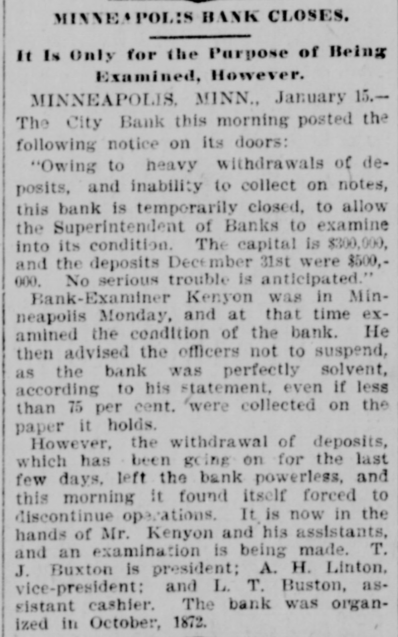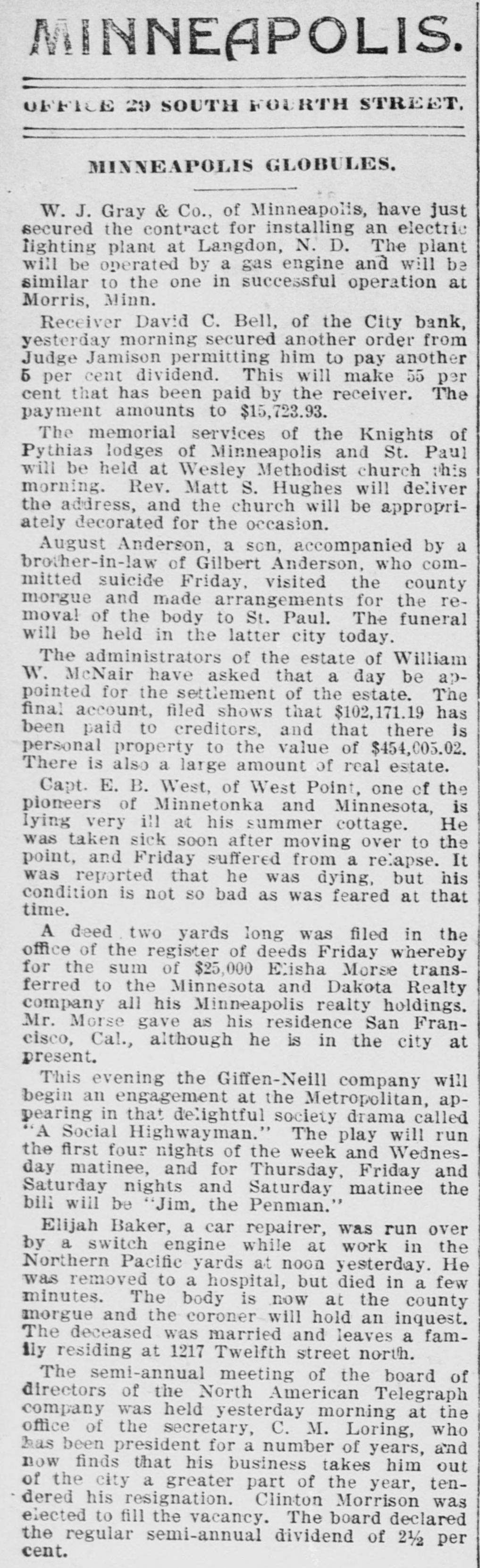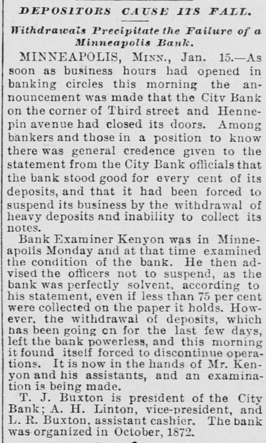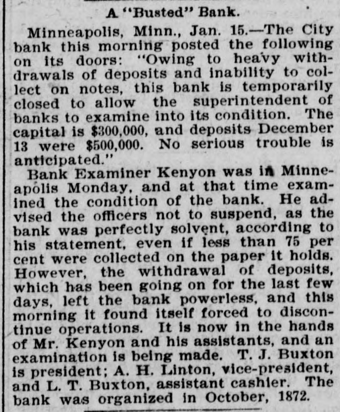 DOMESTIC. The banks at Blue Springs and Stratton, Neb., closed their doors. The Ketcham Lumber company in Chicago made an assignment with liabilities of $275,000. Gov. Upham issued a call for a special session of the Wisconsin legislature to meet February 14 to reapportion the state. A call was issued for all the Christian organizations in the United States to send delegates to a national Christian convention at Washington, D. C., to meet on Saturday, February 22, 1896, to consider the deplorable condition of Armenia. Commander Ballington Booth. who for nine years has been in supreme command of the Salvation Army in the United States, was ordered by his father to return to England. The American Savings and Loan association went into the hands of a receiver at Minneapolis with heavy liabilities. The superintendent of public schools at Perry, O. T., as a last resort to prevent mixed schools ordered every school closed. A new counterfeit $20 bill on the South Bend (Ind.) national bank was in circulation in that city. Charles W. Landell, manufacturer of glazed kid and morocco leather in Philadelphia, failed for $150,000. Brig. Gen. Charles A. Heckman. a veteran of the Mexican war and the rebellion, died at his home in Germantown, Pa., aged 73 years. The business portion of Pleasant Green, Mo., was destroyed by fire. In a family quarrel at their home near Jonesboro, Tenn., Joseph P. Dove and one of his sons and a daughter were killed. The government bond syndicate organized in New York by J. P. Morgan & Co., was dissolved. The failure of Keen, Sutterlee & Co., leather dealers in Philadelphia, for $4,000,000, carried down four other dealcrs, with aggregate liabilities of $400,000. The Bank of Wauneta, Neb., failed to open its doors. After a cataleptic sleep of seven years, William Depue, a prominent citizen of Bushkill, Pa., suddenly returned to consciousness and good health. C. T. Eberts, a dentist at Holt, Mo., kissed the wife of a business man while filling her teeth, and was chased out of town by indignant citizens. W. L. Moody, brother of Dwight L. Moody, the evangelist, died in Kansas City, Mo., the result of injuries received in a railroad accident. He was a stockman and lived at Gardner, Kan. Near Fort Holmes, O. T., four outlaws met death at the hands of a vigilance committee composed of ranchers. The City bank in Minneapolis, Minn., suspended payment with liabilities of $150,000. Seidenberg, Stieffel & Co., cigar manufacturers in New York, failed for $275,000. At the meeting in Washington of the democratic national committee it was decided to hold the national convention in Chicago on July 7. The Irish-American bank closed its doors at Minneapolis, Minn. Gen. Ballington Booth has purchased a farm in Bergen county, N. J., to be used as a home for worn-out Salvation Army officers.