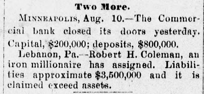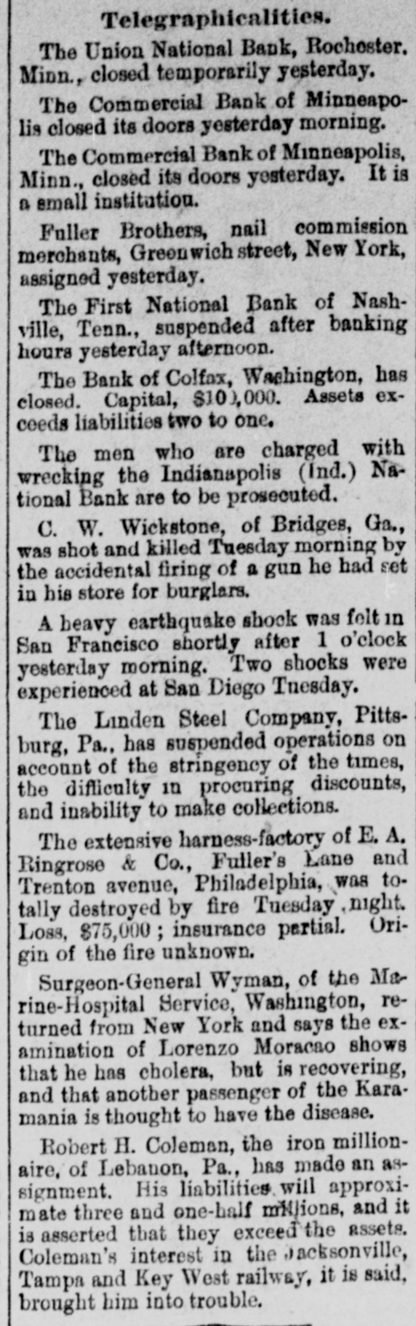 NEW YORK, Aug. 9.-Wall street morn- rea disagreeable surprise this the asceived in the shape of a notice from had sociated ing national banks that they rates unanimously decided to increase the 12 per loans of a recent date to on those of long standing to for this is so many say laid down on them for Brothers have ers necessary cent call have the and reason self-protection. been advised that 10. borrow- They it by is Ellinger that the report from San Francisco San cable the 4th, giving mail advices from on de Costa Rica, stating a disastrous that Jose of affairs prevailed there and financial state de la Union was in and its notes no longer rein commercial circles, is, as as to the bank. utterly of the Banco de difficulties the lates The Banco capital false. far la accepted Union it fund surplus $500,000. reserve June is dividend was July 10. The cash on 30 Ellinger is was the circulation of the $250,000. $1,200,000, and that $1,510,000. paid A Brothers declared bank and further hand its say by the Government notes accepted by every body legal tender for taxes. F. R. Mills has been of the Hamilton Loan and guaranteed receiver William are duties. etc. W. appointed and Popple Trust are at 150 Broadway. F. at Denver. Colo., a was of the property ago the Northwest, it having and Kearney, pany Company Omaha receiver appointed in Nebr.. of the branches company few Denver, com- days at Tacoma, Wash. The organized in March. to on farm mortgages and The company has on Western loans them. Colo., was $2,000,000 and loaned, farms 1887, guarantee it and the is make office said, had over paid-up capital of $358,000. At had a it was said to-day that the receivers protection been appointed as a matter of claimed to save the assets, as it is liaand there is a large surplus of assets over bilities. Fuller Bros. & Co., commission merto-day assigned to C. B. Mulligan. Bradchants. Fuller Bros. & Co. were rated by and streets at from $300,000 to $400,000 firm their credit was reported A1. The the transacted a heavy business all over, country. No statement has been fried yet. The finance committee of the General afterElectric Company announced this that arrangements had been comnoon pleted for discharging the Hoating debt, amounting to $4,000,000. large crowd of small depositors assem- which A before the St. Nicholas Bank, bled refused to clear for the Madison-square Bank to-day. and a run was started. the Later, however, Henry Goldstein. give millionaire coat-dealer, agreed to bond in $300,000 to pay all depositors. INDIANAPOL16. Ind., Aug. 9.-It has decided to institute legal proceedings against been the men charged with wrecking the Indianapolis National Bank. WHEELING. W. Va., Aug. 9.-A. the W. has been appointed receiver There for is Nail Paull City Stamping Company. assets statement beyond one that the are no three to one greater than the liabilities. CHICAGO, Aug. 9.-The investigation far into the condition of Lazarus of Silverman's thus Bank shows total liabilities $1,691,079 and assets $2,521,244. Nothing disof a suspicious nature has yet been covered. LEBANON, Pa.. Aug. 9. - Robert have H. iron millionaire, and wife, The liaexecuted Coleman, a deed of assignment. it is are about $3,500,000 and. Coleman's bilities exceed the assets. claimed, was wrecked in the Jacksonville, His esfortune and Key West Railway. for a tate Tampa has been in the hands of trustees year. PITTSBURG. Aug. 9.-Judgments against aggre$60,000 have been entered of the gating Steel Company, one the Linden concerns in the city, with a large Government largest contract for the manufacture armor-plate. It will ask an extension, will and of it is believed the embarrassment only ROCHESTER. be temporary. Minn., 9.-The Union this Bank closed temporarily the morning. National It will resume without appointment of a receiver. MINNEAPOLIS, Aug. 9.-The Commercial dehas failed. Capital, $200,000: Bank $400,000; time deposits, statement, $222,000; posits, and discounts at last depositors loans $642,000. The officers say the will be paid in full. WASHINGTON, Aug. 9. - Comptroller Jr. to-day appointed E. W. Knight National receiver Eckels of the Stock-growers' Bank at Miles City, Mont. NASHVILLE, Tenn., Aug. 9.-The oldest First naBank of this city, the River. National institution south of the Ohio The capitional its doors this afternoon. surclosed $1,000,000: deposits, $1,000,000; $100,000. tal is and undivided profits, Bank plus fund of the Fourth National Directors other capitalists, representing a several guarand of property, have signed their inmillions pledging themselves and all deantee dividual estates to the payment of