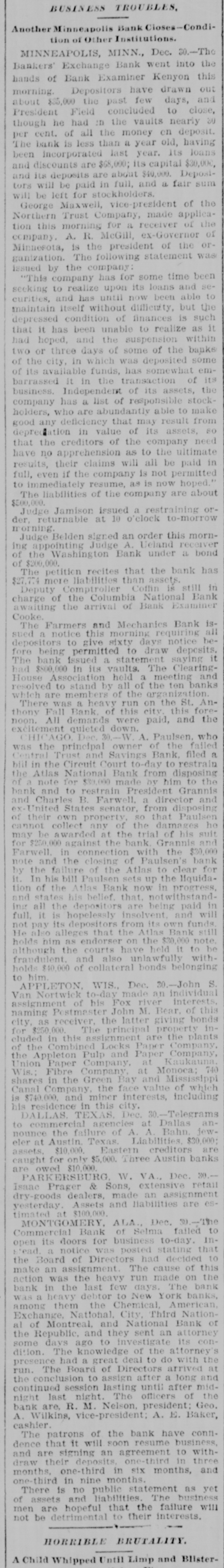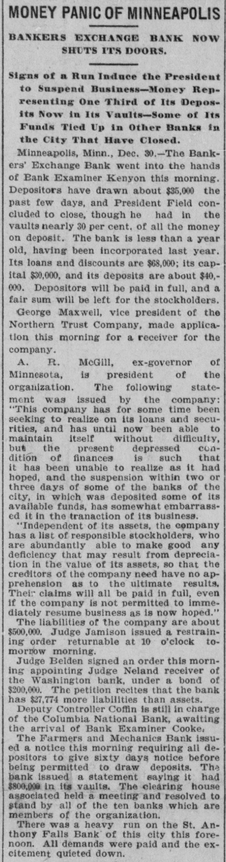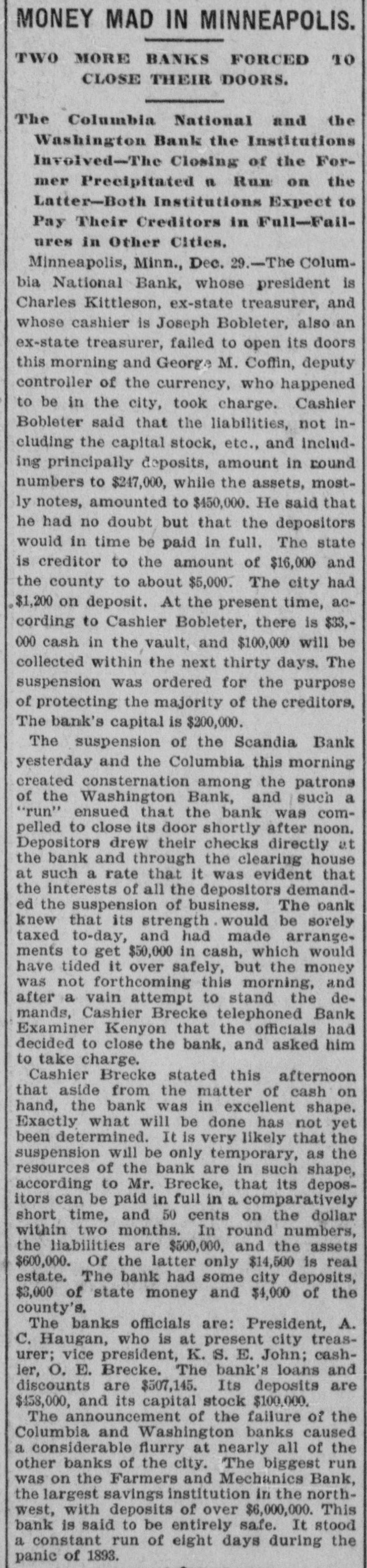 MONEY MAD IN MINNEAPOLIS. TWO MORE BANKS FORCED TO CLOSE THEIR DOORS. The Columbia National and the Washington Bank the Institutions Involved-The Closing of the Former Precipitated n Run on the Latter-Both Institutions Expect to Pay Their Creditors in Full-Failures in Other Cities. Minneapolis, Minn., Dec. 29.-The Columbia National Bank, whose president is Charles Kittleson, ex-state treasurer, and whose cashier is Joseph Bobleter, also an ex-state treasurer, failed to open its doors this morning and George M. Coffin, deputy controller of the currency, who happened to be in the city, took charge. Cashier Bobleter said that the liabilities, not including the capital stock, etc., and including principally deposits, amount in round numbers to $247,000, while the assets, mostly notes, amounted to $450,000. He said that he had no doubt but that the depositors would in time be paid in full. The state is creditor to the amount of $16,000 and the county to about $5,000. The city had $1,200 on deposit. At the present time, according to Cashier Bobleter, there is $33,000 cash in the vault, and $100,000 will be collected within the next thirty days. The suspension was ordered for the purpose of protecting the majority of the creditors, The bank's capital is $200,000. The suspension of the Scandia Bank yesterday and the Columbia this morning created consternation among the patrons of the Washington Bank, and I such a "run" ensued that the bank was compelled to close its door shortly after noon. Depositors drew their checks directly at the bank and through the clearing house at such a rate that it was evident that the interests of all the depositors demanded the suspension of business. The bank knew that its strength would be sorely taxed to-day, and had made arrangements to get $50,000 in cash, which would have tided it over safely, but the money was not forthcoming this morning, and after a vain attempt to stand the demands, Cashier Brecke telephoned Bank Examiner Kenyon that the officials had decided to close the bank, and asked him to take charge. Cashier Brecke stated this afternoon that aside from the matter of cash on hand, the bank was in excellent shape. Exactly what will be done has not yet been determined. It is very likely that the suspension will be only temporary, as the resources of the bank are in such shape, according to Mr. Brecke, that its depositors can be paid in full in a comparatively short time, and 50 cents on the dollar within two months. In round numbers, the liabilities are $500,000, and the assets $600,000. Of the latter only $14,500 is real estate. The bank had some city deposits, $3,000 of state money and $4,000 of the county's. The banks officials are: President, A. C. Haugan, who is at present city treasurer; vice president, K. S. E. John; cashler, O. E. Brecke. The bank's loans and discounts are $507,145. Its deposits are $458,000, and its capital stock $100,000. The announcement of the failure of the Columbia and Washington banks caused a considerable flurry at nearly all of the other banks of the city. The biggest run was on the Farmers and Mechanics Bank, the largest savings institution in the northwest, with deposits of over $6,000,000. This bank is said to be entirely safe. It stood a constant run of eight days during the panic of 1893.