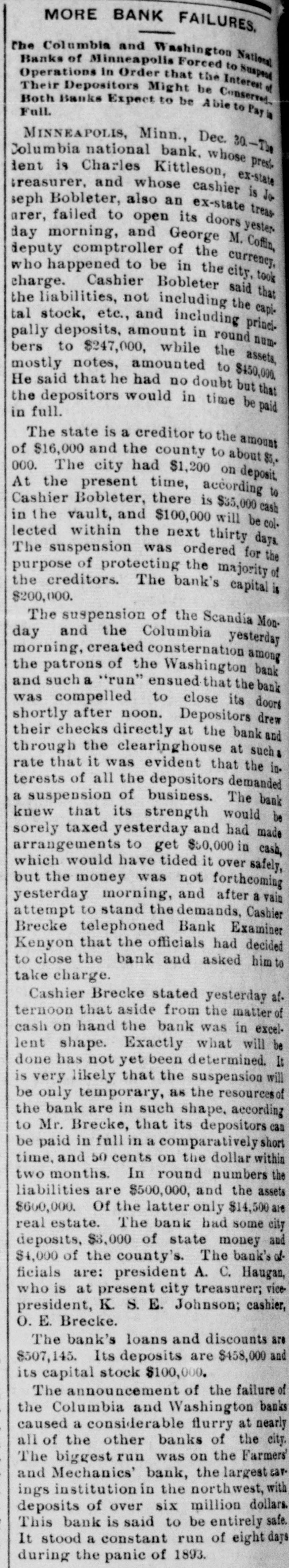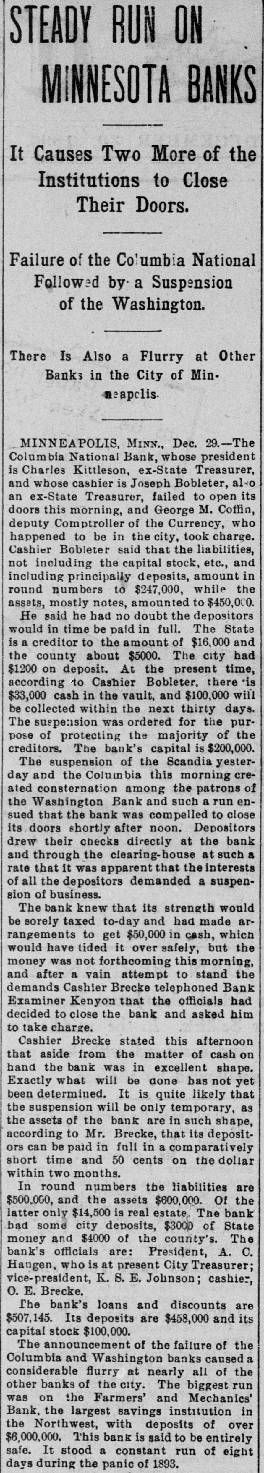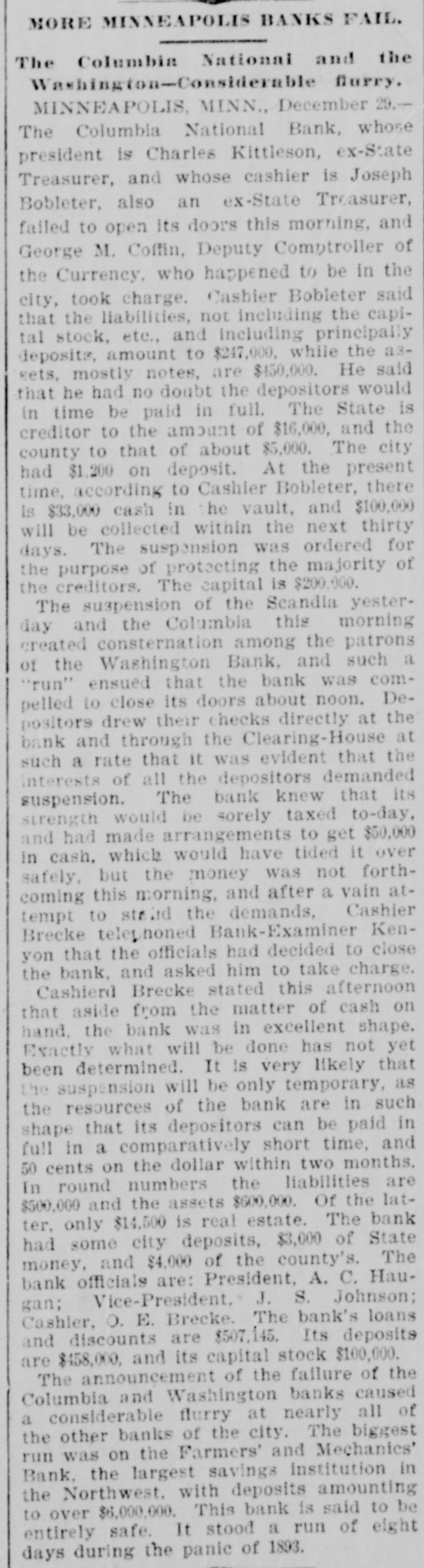 MORE MINNEAPOLIS BANKS FAIL. The Columbia National and the Washington-Considerable Burry. MINNEAPOLIS, MINN.. December 29.The Columbia National Bank, whose president is Charles Kittleson, ex-State Treasurer, and whose cashier is Joseph Bobleter, also an ex-State Treasurer, failed to open its doors this morning, and George M. Coffin, Deputy Comptroller of the Currency, who happened to be in the city, took charge. Cashier Bobleter said that the liabilities, not including the capital stock, etc., and including principally deposits, amount to $247,000. while the assets, mostly notes, are $450,000. He said that he had no doubt the depositors would in time be paid in full. The State is creditor to the amount of $16,000. and the county to that of about $5,000. The city had $1,200 on deposit. At the present time, according to Cashier Bobleter, there Is $33,000 cash in he vault, and $100,000 will be collected within the next thirty days. The suspension was ordered for the purpose of protecting the majority of the creditors. The capital is $200,000. The suppension of the Scandia yesterday and the Columbia this morning created consternation among the patrons of the Washington Bank, and such a "run" ensued that the bank was compelled to close its doors about noon. Depositors drew their checks directly at the bank and through the Clearing-House at such a rate that it was evident that the interests of all the depositors demanded suspension. The bank knew that its strength would be sorely taxed to-day, and had made arrangements to get $50,000 in cash. which would have tided it over safely, but the money was not forthcoming this morning, and after a vain attempt to stand the demands, Cashier Brecke telephoned Bank-Examiner Kenyon that the officials had decided to close the bank, and asked him to take charge. Cashierd Brecke stated this afternoon that aside from the matter of cash on hand, the bank was in excellent shape. Exactly what will be done has not yet been determined. It is very likely that the suspension will be only temporary, as the resources of the bank are in such shape that its depositors can be paid in full in a comparatively short time, and 50 cents on the dollar within two months. In round numbers the liabilities are $500,000 and the assets $600,000. Of the latter, only $14,500 is real estate. The bank had some city deposits, $3,000 of State money, and $4,000 of the county's. The bank officials are: President, A. C. Haugan; Vice-President. J. S. Johnson: Cashier, O. E. Brecke. The bank's loans and discounts are $507,145. Its deposits are $458,000, and its capital stock $100,000. The announcement of the failure of the Columbia and Washington banks caused a considerable flurry at nearly all of the other banks of the city. The biggest run was on the Farmers' and Mechanics' Bank. the largest savings institution in the Northwest, with deposits amounting to over $6,000,000. This bank is said to be entirely safe. It stood a run of eight days during the panic of 1893.