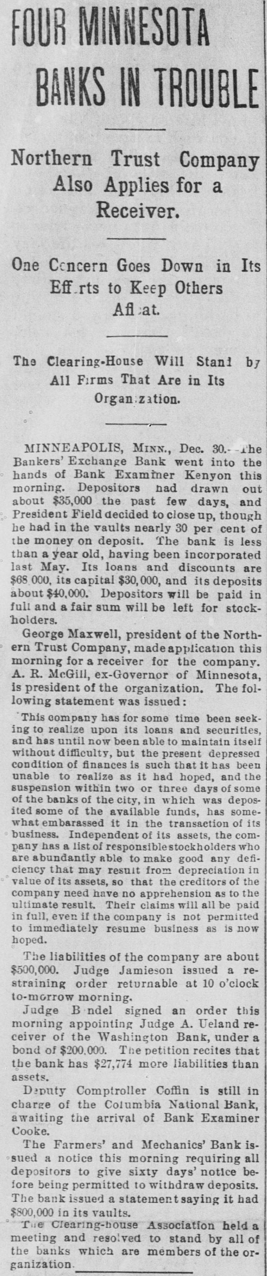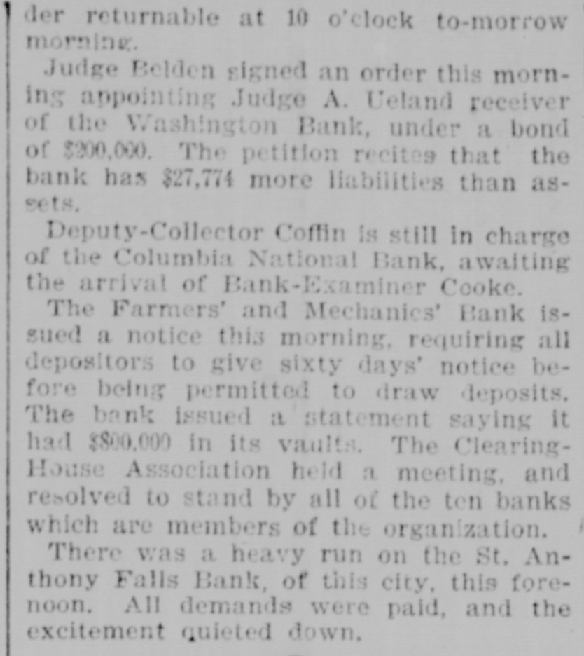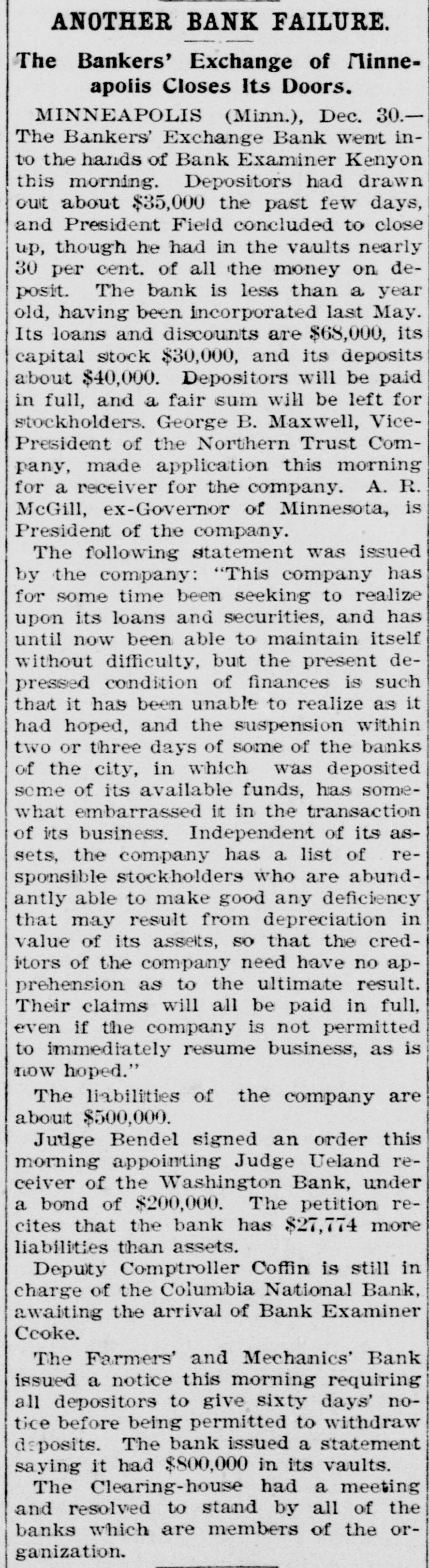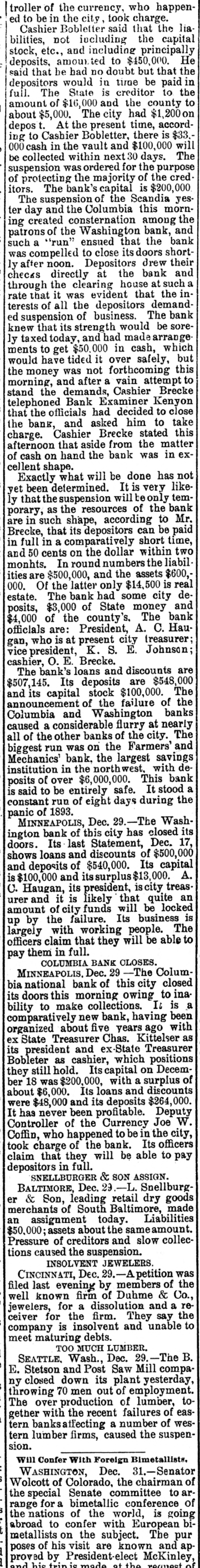 MORE MINNEAPOLIS BANKS FAIL. The Columbia National and the Washington-Considerable Burry. MINNEAPOLIS, MINN.. December 29.The Columbia National Bank, whose president is Charles Kittleson, ex-State Treasurer, and whose cashier is Joseph Bobleter, also an ex-State Treasurer, failed to open its doors this morning, and George M. Coffin, Deputy Comptroller of the Currency, who happened to be in the city, took charge. Cashier Bobleter said that the liabilities, not including the capital stock, etc., and including principally deposits, amount to $247,000. while the assets, mostly notes, are $450,000. He said that he had no doubt the depositors would in time be paid in full. The State is creditor to the amount of $16,000. and the county to that of about $5,000. The city had $1,200 on deposit. At the present time, according to Cashier Bobleter, there Is $33,000 cash in he vault, and $100,000 will be collected within the next thirty days. The suspension was ordered for the purpose of protecting the majority of the creditors. The capital is $200,000. The suppension of the Scandia yesterday and the Columbia this morning created consternation among the patrons of the Washington Bank, and such a "run" ensued that the bank was compelled to close its doors about noon. Depositors drew their checks directly at the bank and through the Clearing-House at such a rate that it was evident that the interests of all the depositors demanded suspension. The bank knew that its strength would be sorely taxed to-day, and had made arrangements to get $50,000 in cash. which would have tided it over safely, but the money was not forthcoming this morning, and after a vain attempt to stand the demands, Cashier Brecke telephoned Bank-Examiner Kenyon that the officials had decided to close the bank, and asked him to take charge. Cashierd Brecke stated this afternoon that aside from the matter of cash on hand, the bank was in excellent shape. Exactly what will be done has not yet been determined. It is very likely that the suspension will be only temporary, as the resources of the bank are in such shape that its depositors can be paid in full in a comparatively short time, and 50 cents on the dollar within two months. In round numbers the liabilities are $500,000 and the assets $600,000. Of the latter, only $14,500 is real estate. The bank had some city deposits, $3,000 of State money, and $4,000 of the county's. The bank officials are: President, A. C. Haugan; Vice-President. J. S. Johnson: Cashier, O. E. Brecke. The bank's loans and discounts are $507,145. Its deposits are $458,000, and its capital stock $100,000. The announcement of the failure of the Columbia and Washington banks caused a considerable flurry at nearly all of the other banks of the city. The biggest run was on the Farmers' and Mechanics' Bank. the largest savings institution in the Northwest, with deposits amounting to over $6,000,000. This bank is said to be entirely safe. It stood a run of eight days during the panic of 1893.