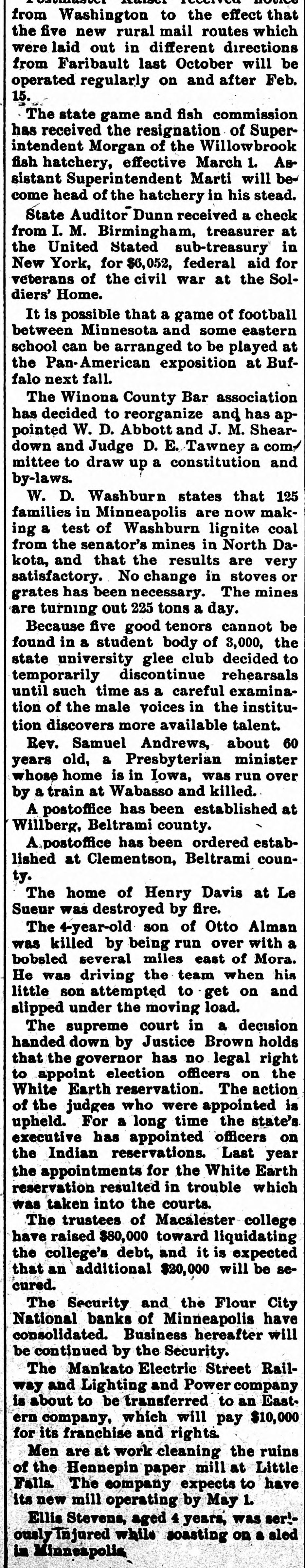from Washington to the effect that the five new rural mail routes which were laid out in different directions from Faribault last October will be operated regularly on and after Feb. 15. The state game and fish commission has received the resignation of Superintendent Morgan of the Willowbrook fish hatchery, effective March 1. Assistant Superintendent Marti will become head of the hatchery in his stead. State Auditor Dunn received a check from I. M. Birmingham, treasurer at the United Stated sub-treasury in New York, for $6,052, federal aid for veterans of the civil war at the Soldiers' Home. It is possible that a game of football between Minnesota and some eastern school can be arranged to be played at the Pan-American exposition at Buffalo next fall. The Winona County Bar association has decided to reorganize and has appointed W. D. Abbott and J. M. Sheardown and Judge D. E. Tawney a committee to draw up a constitution and by-laws. W. D. Washburn states that 125 families in Minneapolis are now making a test of Washburn lignite coal from the senator's mines in North Dakota, and that the results are very satisfactory. No change in stoves or grates has been necessary. The mines are turning out 225 tons a day. Because five good tenors cannot be found in a student body of 3,000, the state university glee club decided to temporarily discontinue rehearsals until such time as a careful examination of the male voices in the institution discovers more available talent. Rev. Samuel Andrews, about 60 years old, a Presbyterian minister whose home is in Iowa, was run over by a train at Wabasso and killed. A postoffice has been established at Willberg, Beltrami county. postoffice has been ordered established at Clementson, Beltrami county. The home of Henry Davis at Le Sueur was destroyed by fire. The 4-year-old son of Otto Alman was killed by being run over with a bobsled several miles east of Mora. He was driving the team when his little son attempted to get on and slipped under the moving load. The supreme court in a decision handed down by Justice Brown holds that the governor has no legal right to appoint election officers on the White Earth reservation. The action of the judges who were appointed is upheld. For a long time the state's executive has appointed officers on the Indian reservations. Last year the appointments for the White Earth reservation resulted in trouble which was taken into the courts. The trustees of Macalester college have raised $80,000 toward liquidating the college's debt, and it is expected that an additional $20,000 will be secured. The Security and the Flour City National banks of Minneapolis have consolidated. Business hereafter will be continued by the Security. The Mankato Electric Street Railway and Lighting and Power company is about to be transferred to an Eastern company, which will pay $10,000 for its franchise and rights. Men are at work cleaning the ruins of the Hennepin paper mill at Little Falls. The company expects to have its new mill operating by May 1. Ellis Stevens, aged 4 years, was ser:ously Injured while soasting on a sled in Minneapolia