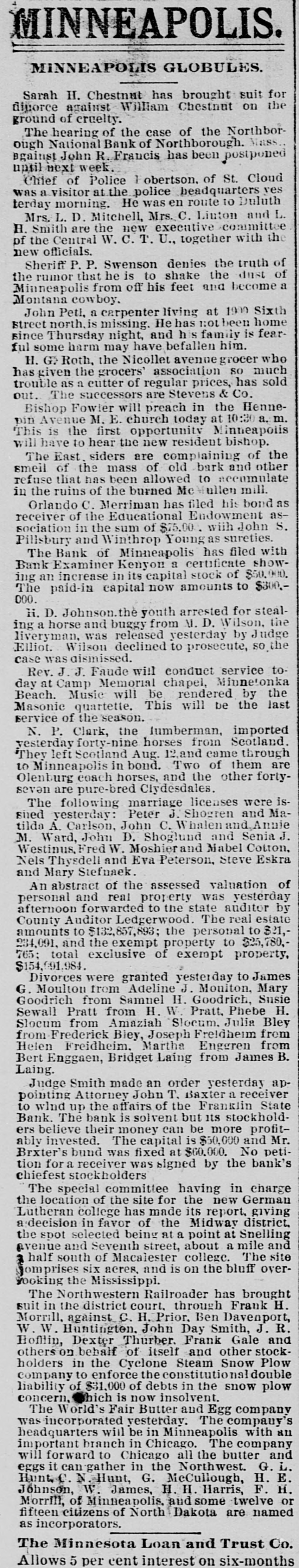 # MINNEAPOLIS. # MINNEAPOLIS GLOBULES. Sarah H. Chestnut has brought suit for divorce against William Chestnut on the ground of cruelty. The hearing of the case of the Northborough National Bank of Northborough, Mass., against John R. Francis has been postponed until next week. Chief of Police Fobertson, of St. Cloud was a visitor at the police headquarters yesterday morning. He was en route to Duluth. Mrs. L. D. Mitchell, Mrs. C. Liuton and L. H. Smith are the new executive committee of the Central W. C. T. U., together with the new officials. Sheriff P. P. Swenson denies the truth of the rumor that he is to shake the dust of Minneapolis from off his feet and become a Montana cowboy. John Peti, a carpenter living at 1900 Sixth street north, is missing. He has not been home since Thursday night, and his family is fearful some harm may have befallen him. H. G. Roth, the Nicollet avenue grocer who has given the grocers' association so much trouble as a cutter of regular prices, has sold out.. The successors are Stevens & Co. Bishop Fowler will preach in the Hennepin Avenue M. E. church today at 10:30 a. m. This is the first opportunity Minneapolis will have to hear the new resident bishop. The East, siders are complaining of the smell of the mass of old bark and other refuse that has been allowed to accumulate in the ruins of the burned McMullen mill. Orlando C. Merriman has filed his bond as receiver of the Educational Endowment association in the sum of $75.00, with John S. Pillsbury and Winthrop Young as sureties. The Bank of Minneapolis has filed with Bank Examiner Kenyon a certificate showing an increase in its capital stock of $50,000. The paid-in capital now amounts to $300.-000. ii. D. Johnson. the youth arrested for stealing a horse and buggy from M. D. Wilson, the liveryman, was released yesterday by Judge Elliot. Wilson declined to prosecute, so the case was dismissed. Rev. J. J. Faude will conduct service today at Camp Memorial chapel, Minnetonka Beach. Music will be rendered by the Masonic quartette. This will be the last service of the season. N. P. Clark, the lumberman, imported yesterday forty-nine horses from Scotland. They left Scotland Aug. 12, and came through to Minneapolis in bond. Two of them are Olenburg coach horses, and the other forty-seven are pure-bred Clydesdales. The following marriage licenses were issued yesterday: Peter J. Shogren and Matilda A. Carlson, John C. Whalen and Annie M. Ward, John D. Shoglund and Senia J. Westinus, Fred W. Moshier and Mabel Cotton, Nels Thysdell and Eva Peterson, Steve Eskra and Mary Stefnaek. An abstract of the assessed valuation of personal and real property was yesterday afternoon forwarded to the state auditor by County Auditor Ledgerwood. The real estate amounts to $132,857,893; the personal to $21,234,091, and the exempt property to $25,780,765; total exclusive of exempt property, $154,091.984. Divorces were granted yesterday to James G. Moulton from Adeline J. Moniton, Mary Goodrich from Samnel H. Goodrich, Susie Sewall Pratt from H. W. Pratt, Phebe H. Slocum from Amaziah Slocum, Julia Bley from Frederick Bley, Joseph Freldheim from Helen Freidheim. Martha Enggren from Bert Enggaen, Bridget Laing from James B. Laing. Judge Smith made an order yesterday appointing Attorney John T. Baxter a receiver to wind up the affairs of the Franklin State Bank. The bank is solvent but its stockholders believe their money can be more profitably invested. The capital is $50,000 and Mr. Brxter's bund was fixed at $60.000. No petition for a receiver was signed by the bank's chiefest stockholders The special committee having in charge the location of the site for the new German Lutheran college has made its report, giving a decision in favor of the Midway district, the spot selected being at a point at Snelling avenue and Seventh street, about a mile and half south of Macalester college. The site comprises six acres, and is on the bluff overlooking the Mississippi. The Northwestern Railroader has brought suit in the district court, through Frank H. Morrill, against C. H. Prior, Ben Davenport, W. W. Huntington, John Day Smith, J. R. Hofflin, Dexter Thurber. Frank Gale and others on behalf of itself and other stockholders in the Cyclone Steam Snow Plow company to enforce the constitutional double liability of $31,000 of debts in the snow plow concern, hich is now insolvent. The World's Fair Butter and Egg company was incorporated yesterday. The company's headquarters will be in Minneapolis with an important branch in Chicago. The company will forward to Chicago all the butter and eggs it can gather in the Northwest. G. L. Hunt, C. N. Hunt, G. McCullough, Н. Е. Johnson, W. James, H. H. Harris, F. H. Morrill, of Minneapolis, and some twelve or fifteen citizens of North Dakota are named as incorporators. The Minnesota Loan and Trust Co. Allows 5 per cent interest on six-months