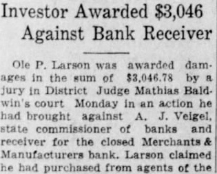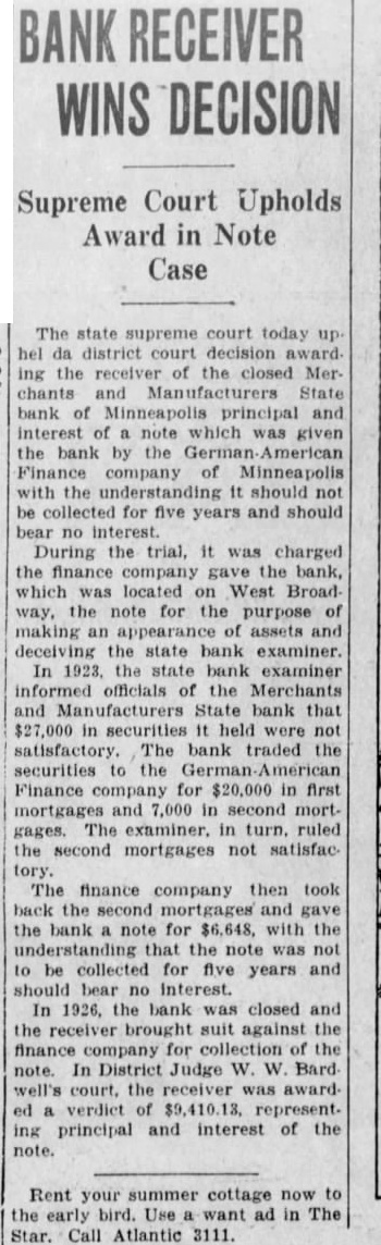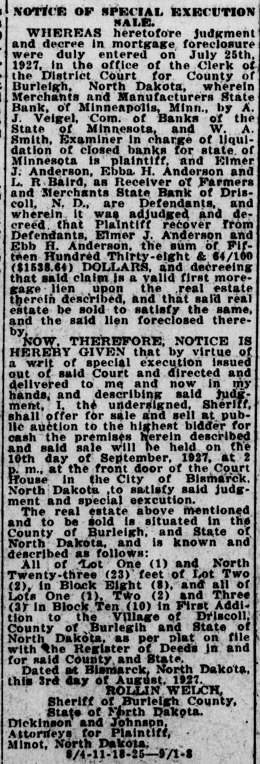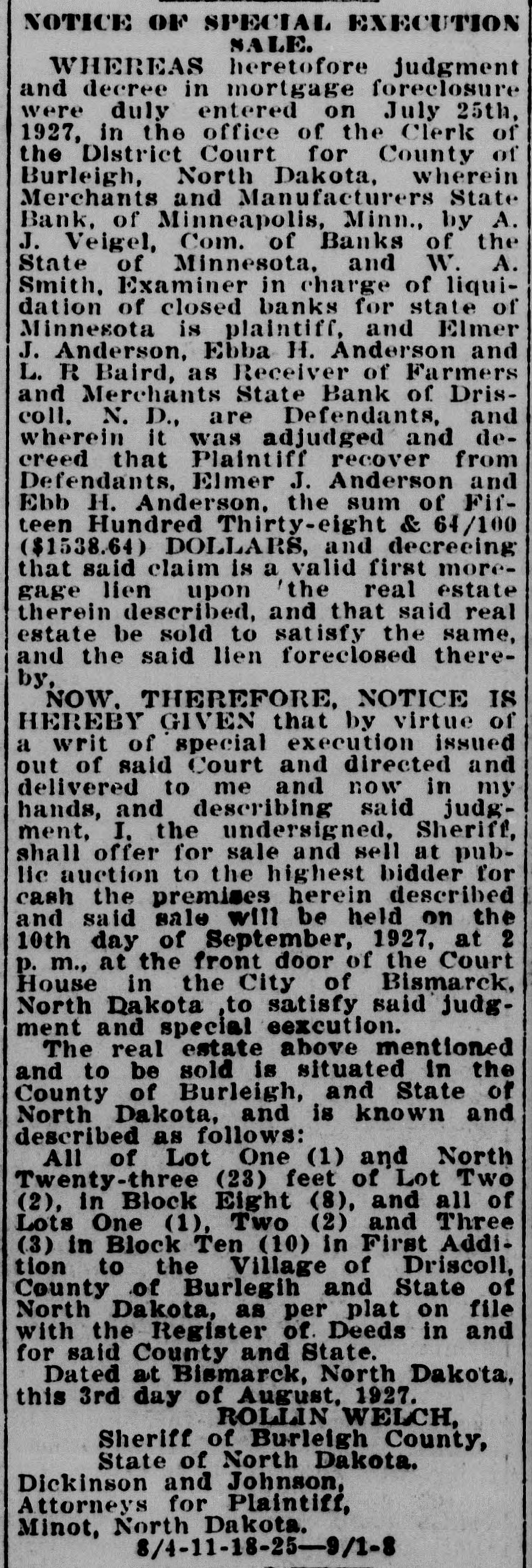 # NOTICE OF SPECIAL EXECUTION SALE. WHEREAS heretofore judgment and decree in mortgage foreclosure were duly entered on July 25th, 1927, in the office of the Clerk of the District Court for County of Burleigh, North Dakota, wherein Merchants and Manufacturers State Bank, of Minneapolis, Minn., by A. J. Veigel, Com. of Banks of the State of Minnesota, and W. A. Smith, Examiner in charge of liquidation of closed banks for state of Minnesota is plaintiff, and Elmer J. Anderson, Ebba H. Anderson and L. R Baird, as Receiver of Farmers and Merchants State Bank of Driscoll, N. D., are Defendants, and wherein it was adjudged and decreed, that Plaintiff recover from Defendants, Elmer J. Anderson and Ebb H. Anderson, the sum of Fifteen Hundred Thirty-eight & 64/100 ($1538.64) DOLLARS, and decreeing that said claim is a valid first mortgage lien upon the real estate therein described, and that said real estate be sold to satisfy the same, and the said lien foreclosed thereby, NOW, THEREFORE, NOTICE IS HEREBY GIVEN that by virtue of a writ of special execution issued out of said Court and directed and delivered to me and now in my hands, and describing said judgment, I, the undersigned, Sheriff, shall offer for sale and sell at public auction to the highest bidder for cash the premises herein described and said sale will be held on the 10th day of September, 1927, at 2 p. m., at the front door of the Court House in the City of Bismarck, North Dakota, to satisfy said judgment and special execution. The real estate above mentioned and to be sold is situated in the County of Burleigh, and State of North Dakota, and is known and described as follows: All of Lot One (1) and North Twenty-three (23) feet of Lot Two (2), in Block Eight (8), and all of Lots One (1), Two (2) and Three (3) in Block Ten (10) in First Addition to the Village of Driscoll, County of Burlegih and State of North Dakota, as per plat on file with the Register of Deeds in and for said County and State. Dated at Bismarck, North Dakota, this 3rd day of August, 1927. ROLLIN WELCH, Sheriff of Burleigh County, State of North Dakota. Dickinson and Johnson, Attorneys for Plaintiff, Minot, North Dakota. 8/4-11-18-25-9/1-8