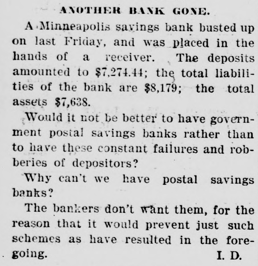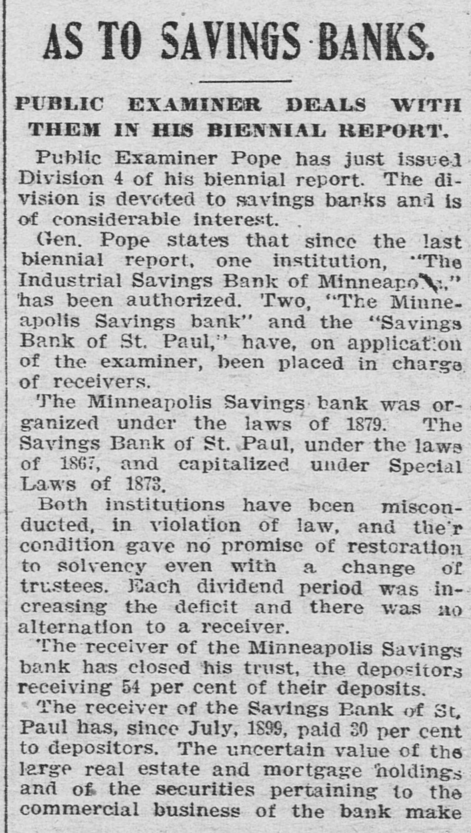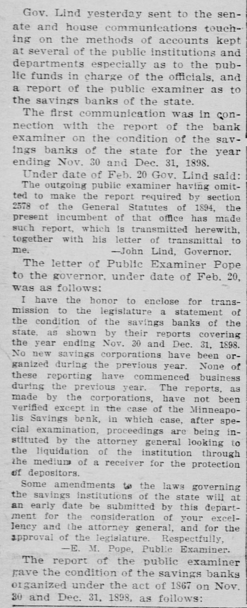 Gov. Lind yesterday sent to the senate and house communications touching on the methods of accounts kept at several of the public institutions and departments especially as to the public funds in charge of the officials, and a report of the public examiner as to the savings banks of the state. The first communication was in connection with the report of the bank examiner on the condition of the savings banks of the state for the year ending Nov. 30 and Dec. 31, 1898. Under date of Feb. 20 Gov. Lind said: The outgoing public examiner having omitted to make the report required by section 2578 of the General Statutes of 1894, the present incumbent of that office has made such report, which is transmitted herewith, together with his letter of transmittal to me. -John Lind, Governor. The letter of Public Examiner Pope to the governor, under date of Feb. 20, was as follows: I have the honor to enclose for transmission to the legislature a statement of the condition of the savings banks of the state, as shown by their reports covering the year ending Nov. 30 and Dec. 31, 1898. No new savings corporations have been organized during the previous year. None of these reporting have commenced business during the previous year. The reports, as made by the corporations, have not been verified except in the case of the Minneapolis Savings bank, in which case, after special examination, proceedings are being instituted by the attorney general looking to the liquidation of the institution through the medium of a receiver for the protection of depositors. Some amendments to the laws governing the savings institutions of the state will at an early date be submitted by this department for the consideration of your excellency and the attorney general, and for the approval of the legislature. Respectfully, -E. M. Pope, Public Examiner. The report of the public examiner gave the condition of the savings banks organized under the act of 1867 on Nov. 30 and Dec. 31, 1898, as follows: