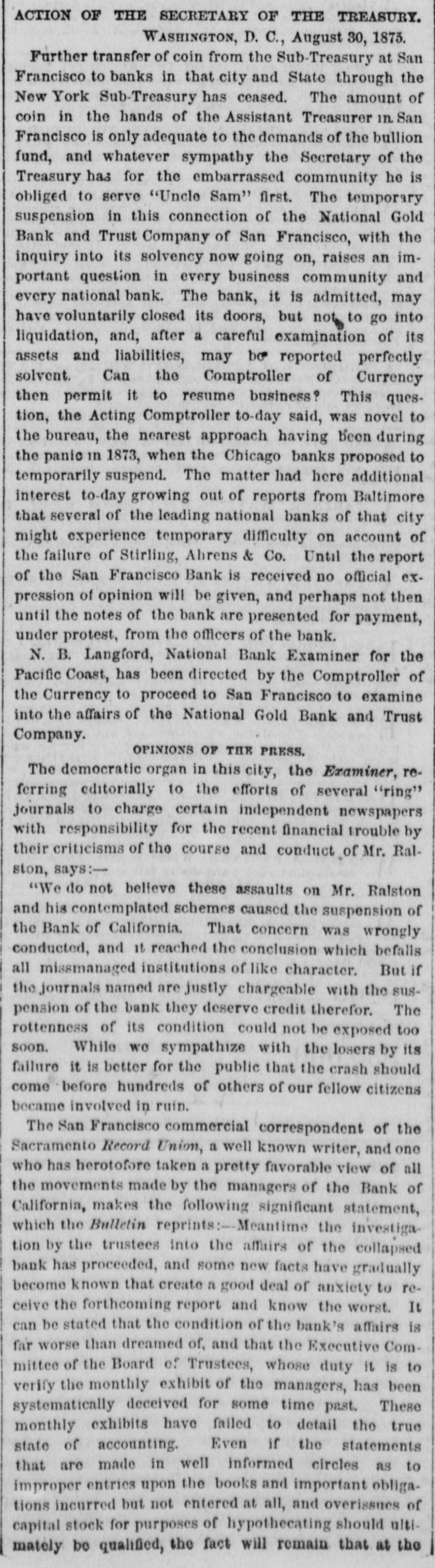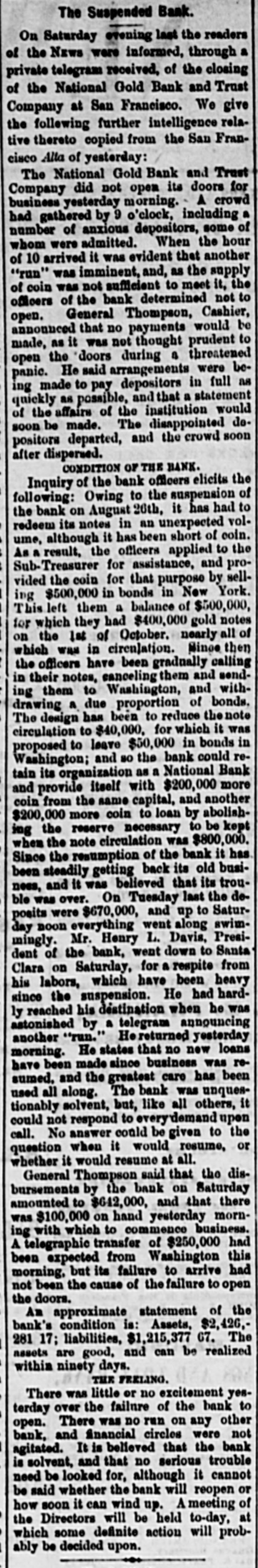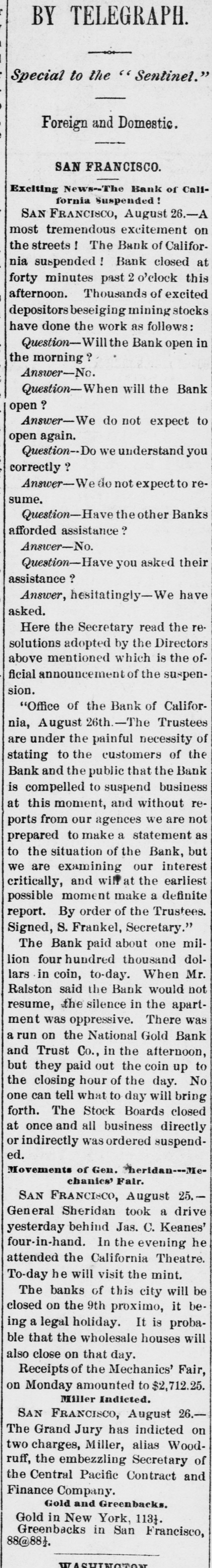 TELEGRAPHIC. SAN FRANCISCO, November 2. The Directors of the National Gold Bank Trust Company are holding a meeting to-night to determine upon A a course of action for the bank. lively discussion is going on but no conclusion has yet been arrived at. It is stated as an explanation of the recent run upon the bank, that it originated in a misunderstanding; that some unfortunate investment had been made of a portion of the Insurance Fund of the Board of Brokers by the custodian of the fund -Mr. Winans-who made the loss good from his own pocket. At the closing of the Board the President announced that the "Trust Fund was all right." This was understood by some, by mistake, to refer to the "Trust Company," and the statement that it was all right at once aroused the suspicion that it might be all wrong, and hence the run on the bank. Weather clear and bright and the rain apparently over. Among the malcontents with the awards of premiums at the Mechanics' Fair is v. S. W. Parkhurst, who brought suit to day in the Third District Court against the Mechanics' Institute to compel the delivery of the gold medal awarded by the Judges of the late exhibition for Howe's patent weighing scales, for which plaintiff is sole agent in this city and county. The San Francisco Presbytery, at a meeting yesterday, deposed Rev. Dr. Woodbridge from the pastorage of Cavalry Church, on account of dissensions in the congregation. This action in no wise effects the character of the reverend gentleman. Colonel John McComb, of the Alta, arrived from the East this evening, and is now being escorted to Armory Hall by the Second Regiment, N. G. C., where there will be a reception and reunion. The Committee appointed to revise the Constitution of the Bank of California-consisting of Judge Hagar, George H. Howard, William Sharon, H. W. Carpenter and Charles Mayne-met the stockhold. ers to-day and reported that in view of the fact that the bank would probably be recognized at an early date, with a new Constitution and ByLaws, they deemed it inexpedient to make any change until then. It is intimated that the new organization will go into effect in about three months. WASHINGTON November 1. Several pastors of this city, of dif ferent denominations, who were apprehensive that the Government was about to abandon the peace policy toward the Indians, called on the President to day to express their conviction that such a course would greatly disappoint Christian people all over the country and be a blow to the cause of Christianity through out the world. The President, with great promptness and propriety, replied that he did not regard the peace policy as a failure, and it not only would not be abandoned while he occupied that place, but it was his hope that during his administra tion it would be so firmly established as to become the necessary policy of his successor. WASHINGTON, Nov 2. The following statement of the total coinage for the month of October has been prepared at the office of the Director of the Mint Goldnumber of pieces, 215,251 double eagle, value, $4,305,020. Trade dollais-number of pieces, 860,000; value, $860,020. Subsidiary silver -number of pieces, 532,000 halfdollars, value, $268,000; quarterdollars, value, $248,000 dimes, value, $90,000 total, $604,000. Minor coins-1,620,000 pieces, onecent bronze, value, $16,200. Total number of pieces, 5,119,241; total value, $5,785,220. The proceedings of the Third District Court of Utah ordering the imprisonment of Brigham Young until $9,500 be paid by him to Anna Eliza Young, have been broug ht to the attention of the Attorney General, and will be made the subject of Cabinet consideration with the view of determining the axact status of the case. The question presented is, whether the arrest of Brigham Young could be made on the grounds claimed by the woman for the reason that her marriage with Young was illegal, being contrary to the laws of the United States, and that she cannot take advantage of her own wrong. LONDON, November 2. The Bank of England rate will probably be lowered by Thursday. There has been another heavy withdrawal of bullion from the Bank of England to-day. The amount on balance aggregates Β£534,000, mostly for Germany. The King and Queen of Denmark, and their daughter Princess Thyra, accompanied by Prince John, of Sehleswig-Holstein, Sanderburg and Glucksburg, arrived in England today. The royal party was met at Dover by the Princess of Wales and escorted to London. The distinguished visitors will remain till the beginning of December. Notwithstanding the regular Mich. aelmas term has been abolished, Lord Cairn, the Lord Chancellor, extended the customary reception to