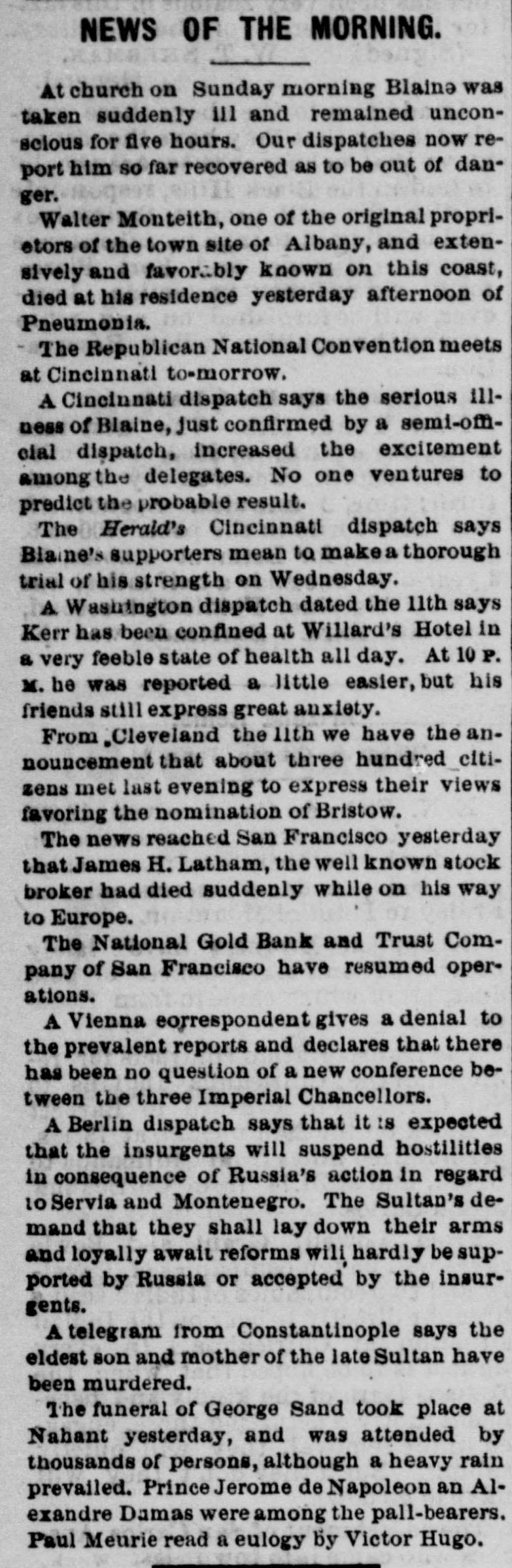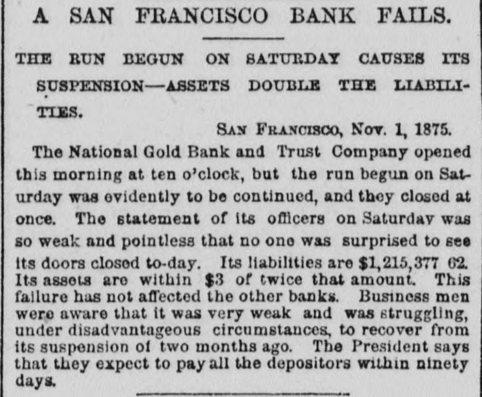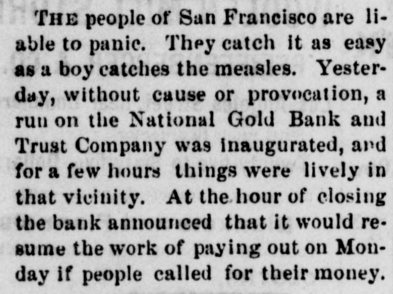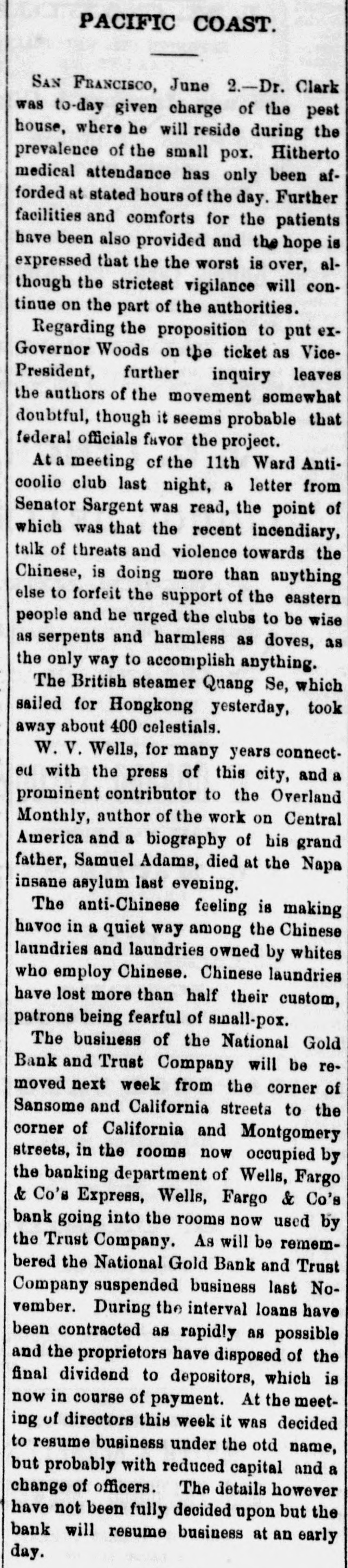TELEGRAPHIC. SAN FRANCISCO, November 2. The Directors of the National Gold Bank Trust Company are holding a meeting to-night to determine upon A a course of action for the bank. lively discussion is going on but no conclusion has yet been arrived at. It is stated as an explanation of the recent run upon the bank, that it originated in a misunderstanding; that some unfortunate investment had been made of a portion of the Insurance Fund of the Board of Brokers by the custodian of the fund -Mr. Winans-who made the loss good from his own pocket. At the closing of the Board the President announced that the "Trust Fund was all right." This was understood by some, by mistake, to refer to the "Trust Company," and the statement that it was all right at once aroused the suspicion that it might be all wrong, and hence the run on the bank. Weather clear and bright and the rain apparently over. Among the malcontents with the awards of premiums at the Mechanics' Fair is v. S. W. Parkhurst, who brought suit to day in the Third District Court against the Mechanics' Institute to compel the delivery of the gold medal awarded by the Judges of the late exhibition for Howe's patent weighing scales, for which plaintiff is sole agent in this city and county. The San Francisco Presbytery, at a meeting yesterday, deposed Rev. Dr. Woodbridge from the pastorage of Cavalry Church, on account of dissensions in the congregation. This action in no wise effects the character of the reverend gentleman. Colonel John McComb, of the Alta, arrived from the East this evening, and is now being escorted to Armory Hall by the Second Regiment, N. G. C., where there will be a reception and reunion. The Committee appointed to revise the Constitution of the Bank of California-consisting of Judge Hagar, George H. Howard, William Sharon, H. W. Carpenter and Charles Mayne-met the stockhold. ers to-day and reported that in view of the fact that the bank would probably be recognized at an early date, with a new Constitution and ByLaws, they deemed it inexpedient to make any change until then. It is intimated that the new organization will go into effect in about three months. WASHINGTON November 1. Several pastors of this city, of dif ferent denominations, who were apprehensive that the Government was about to abandon the peace policy toward the Indians, called on the President to day to express their conviction that such a course would greatly disappoint Christian people all over the country and be a blow to the cause of Christianity through out the world. The President, with great promptness and propriety, replied that he did not regard the peace policy as a failure, and it not only would not be abandoned while he occupied that place, but it was his hope that during his administra tion it would be so firmly established as to become the necessary policy of his successor. WASHINGTON, Nov 2. The following statement of the total coinage for the month of October has been prepared at the office of the Director of the Mint Goldnumber of pieces, 215,251 double eagle, value, $4,305,020. Trade dollais-number of pieces, 860,000; value, $860,020. Subsidiary silver -number of pieces, 532,000 halfdollars, value, $268,000; quarterdollars, value, $248,000 dimes, value, $90,000 total, $604,000. Minor coins-1,620,000 pieces, onecent bronze, value, $16,200. Total number of pieces, 5,119,241; total value, $5,785,220. The proceedings of the Third District Court of Utah ordering the imprisonment of Brigham Young until $9,500 be paid by him to Anna Eliza Young, have been broug ht to the attention of the Attorney General, and will be made the subject of Cabinet consideration with the view of determining the axact status of the case. The question presented is, whether the arrest of Brigham Young could be made on the grounds claimed by the woman for the reason that her marriage with Young was illegal, being contrary to the laws of the United States, and that she cannot take advantage of her own wrong. LONDON, November 2. The Bank of England rate will probably be lowered by Thursday. There has been another heavy withdrawal of bullion from the Bank of England to-day. The amount on balance aggregates Β£534,000, mostly for Germany. The King and Queen of Denmark, and their daughter Princess Thyra, accompanied by Prince John, of Sehleswig-Holstein, Sanderburg and Glucksburg, arrived in England today. The royal party was met at Dover by the Princess of Wales and escorted to London. The distinguished visitors will remain till the beginning of December. Notwithstanding the regular Mich. aelmas term has been abolished, Lord Cairn, the Lord Chancellor, extended the customary reception to