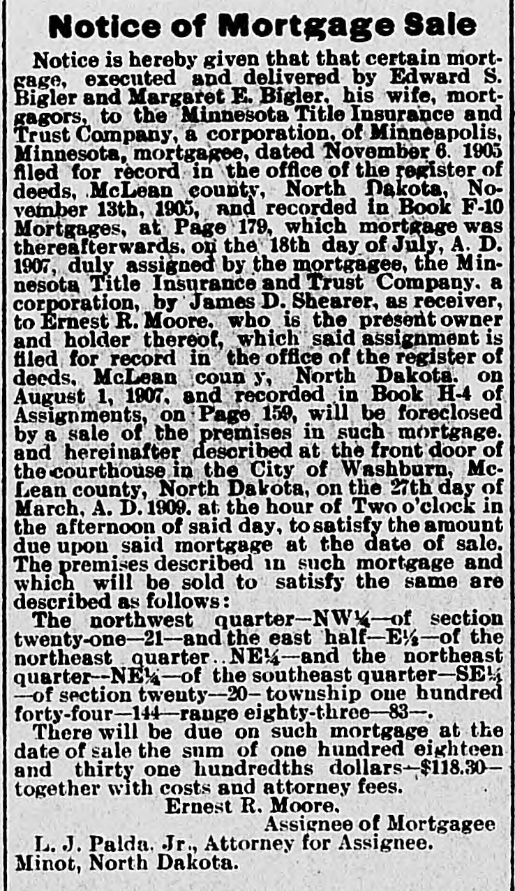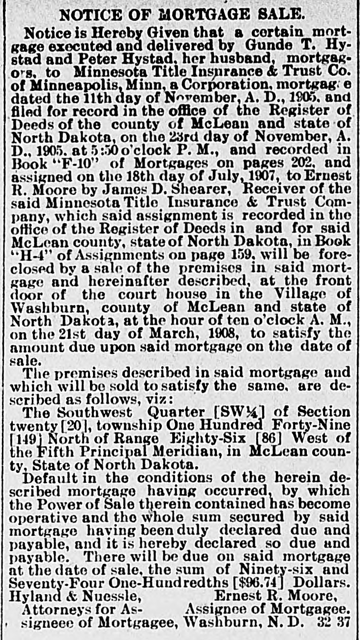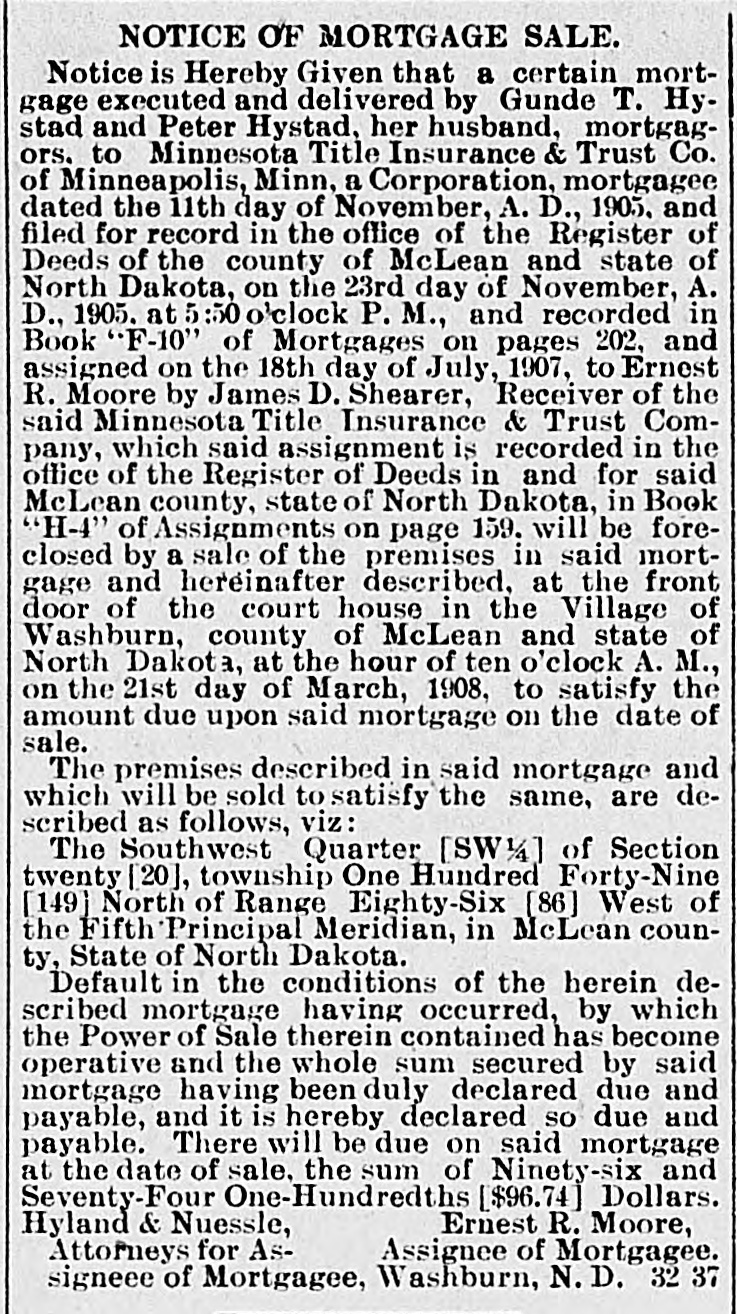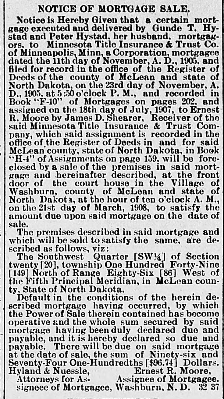 NOTICE OF MORTGAGE SALE. Notice is Hereby Given that a certain mortgage executed and delivered by Gunde T. Hystad and Peter Hystad, her husband, mortgagors. to Minnesota Title Insurance & Trust Co. of Minneapolis, Minn, a Corporation, mortgag: e dated the 11th day of November, A. D., 1905. and filed for record in the office of the Register of Deeds of the county of McLean and state of North Dakota, on the 23rd day of November, A. D., 1905. at 5 :50 o'clock P. M., and recorded in Book "F-10" of Mortgages on pages 202, and assigned on the 18th day of July, 1907, to Ernest R. Moore by James D. Shearer, Receiver of the said Minnesota Title Insurance & Trust Company, which said assignment is recorded in the office of the Register of Deeds in and for said McLean county, state of North Dakota, in Book "H-4" of Assignments on page 159. will be foreclosed by a sale of the premises in said mortgage and hereinafter described, at the front door of the court house in the Village of Washburn, county of McLean and state of North Dakota, at the hour of ten o'clock A. M., on the 21st day of March, 1908, to satisfy the amount due upon said mortgage on the date of sale. The premises described in said mortgage and which will be sold to satisfy the same. are described as follows, viz: The Southwest Quarter [SW14] of Section twenty [20], township One Hundred Forty-Nine [149] North of Range Eighty-Six [86] West of the Fifth Principal Meridian, in McLean county, State of North Dakota. Default in the conditions of the herein described mortgage having occurred, by which the Power of Sale therein contained has become operative and the whole sum secured by said mortgage having been duly declared due and payable, and it is hereby declared so due and payable. There will be due on said mortgage at the date of sale, the sum of Ninety-six and Seventy-Four One-Hundredths [$96.74] Dollars. Ernest R. Moore, Hyland & Nuessle, Assignee of Mortgagee. Attorneys for Assigneee of Mortgagee, Washburn, N.D. 32 37
