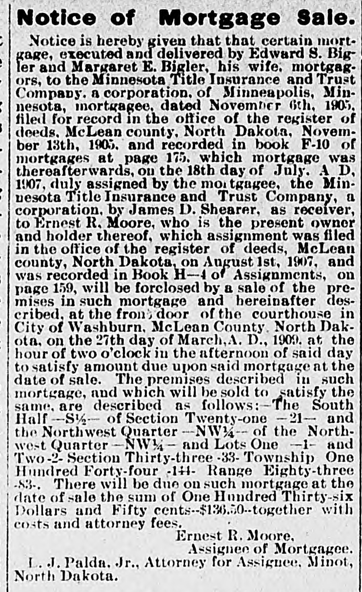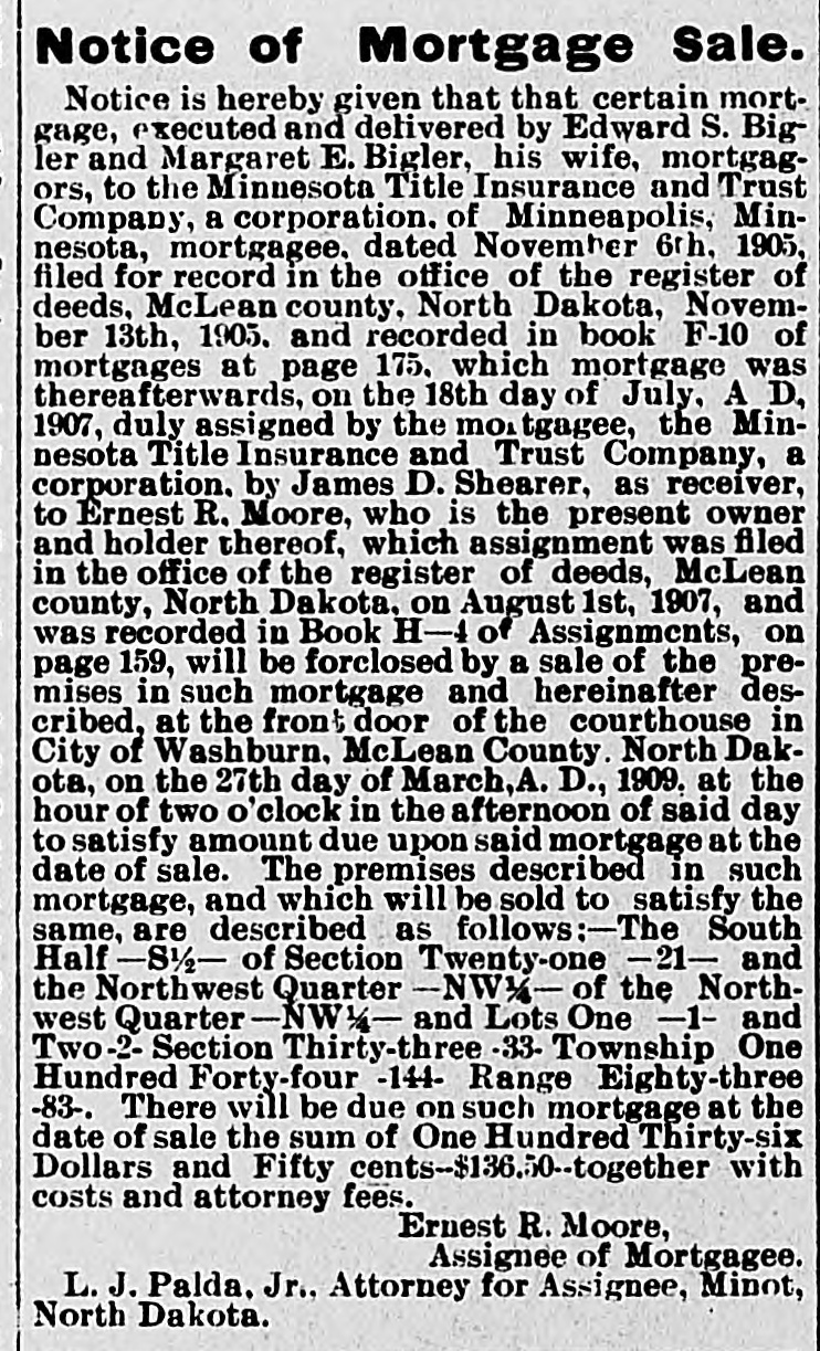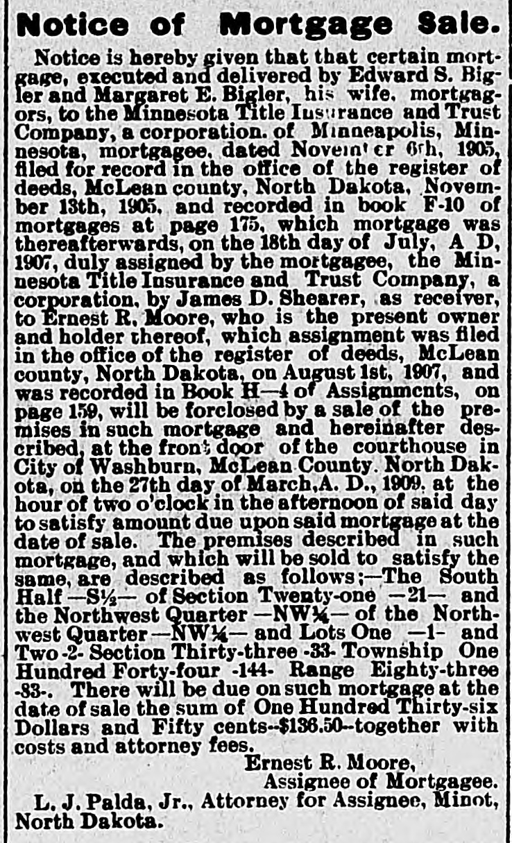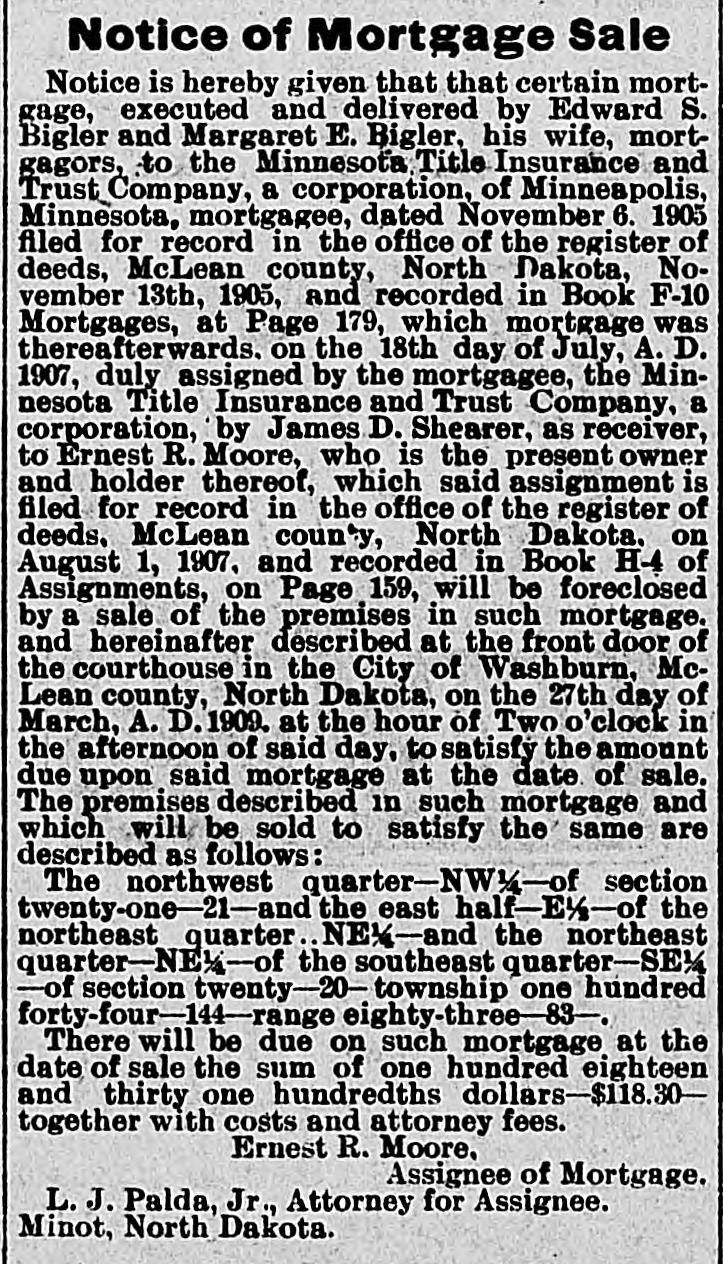 NOTICE OF MORTGAGE SALE. Notice is Hereby Given that a certain mortgage executed and delivered by Gunde T. Hystad and Peter Hystad, her husband, mortgagors. to Minnesota Title Insurance & Trust Co. of Minneapolis, Minn, a Corporation, mortgag: e dated the 11th day of November, A. D., 1905. and filed for record in the office of the Register of Deeds of the county of McLean and state of North Dakota, on the 23rd day of November, A. D., 1905. at 5 :50 o'clock P. M., and recorded in Book "F-10" of Mortgages on pages 202, and assigned on the 18th day of July, 1907, to Ernest R. Moore by James D. Shearer, Receiver of the said Minnesota Title Insurance & Trust Company, which said assignment is recorded in the office of the Register of Deeds in and for said McLean county, state of North Dakota, in Book "H-4" of Assignments on page 159. will be foreclosed by a sale of the premises in said mortgage and hereinafter described, at the front door of the court house in the Village of Washburn, county of McLean and state of North Dakota, at the hour of ten o'clock A. M., on the 21st day of March, 1908, to satisfy the amount due upon said mortgage on the date of sale. The premises described in said mortgage and which will be sold to satisfy the same. are described as follows, viz: The Southwest Quarter [SW14] of Section twenty [20], township One Hundred Forty-Nine [149] North of Range Eighty-Six [86] West of the Fifth Principal Meridian, in McLean county, State of North Dakota. Default in the conditions of the herein described mortgage having occurred, by which the Power of Sale therein contained has become operative and the whole sum secured by said mortgage having been duly declared due and payable, and it is hereby declared so due and payable. There will be due on said mortgage at the date of sale, the sum of Ninety-six and Seventy-Four One-Hundredths [$96.74] Dollars. Ernest R. Moore, Hyland & Nuessle, Assignee of Mortgagee. Attorneys for Assigneee of Mortgagee, Washburn, N.D. 32 37
