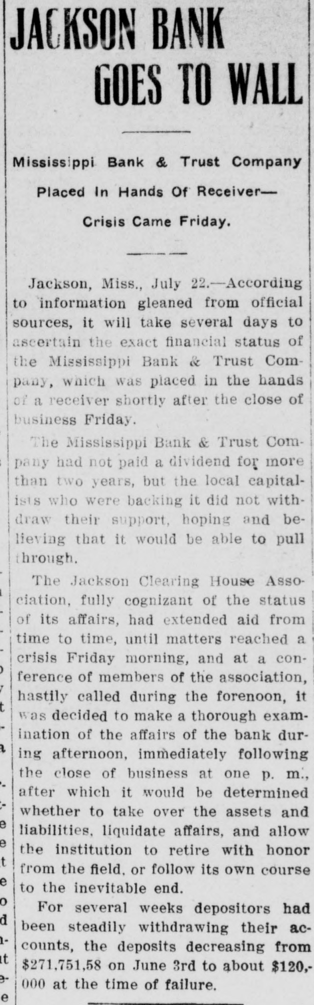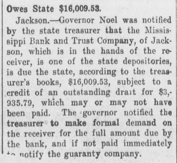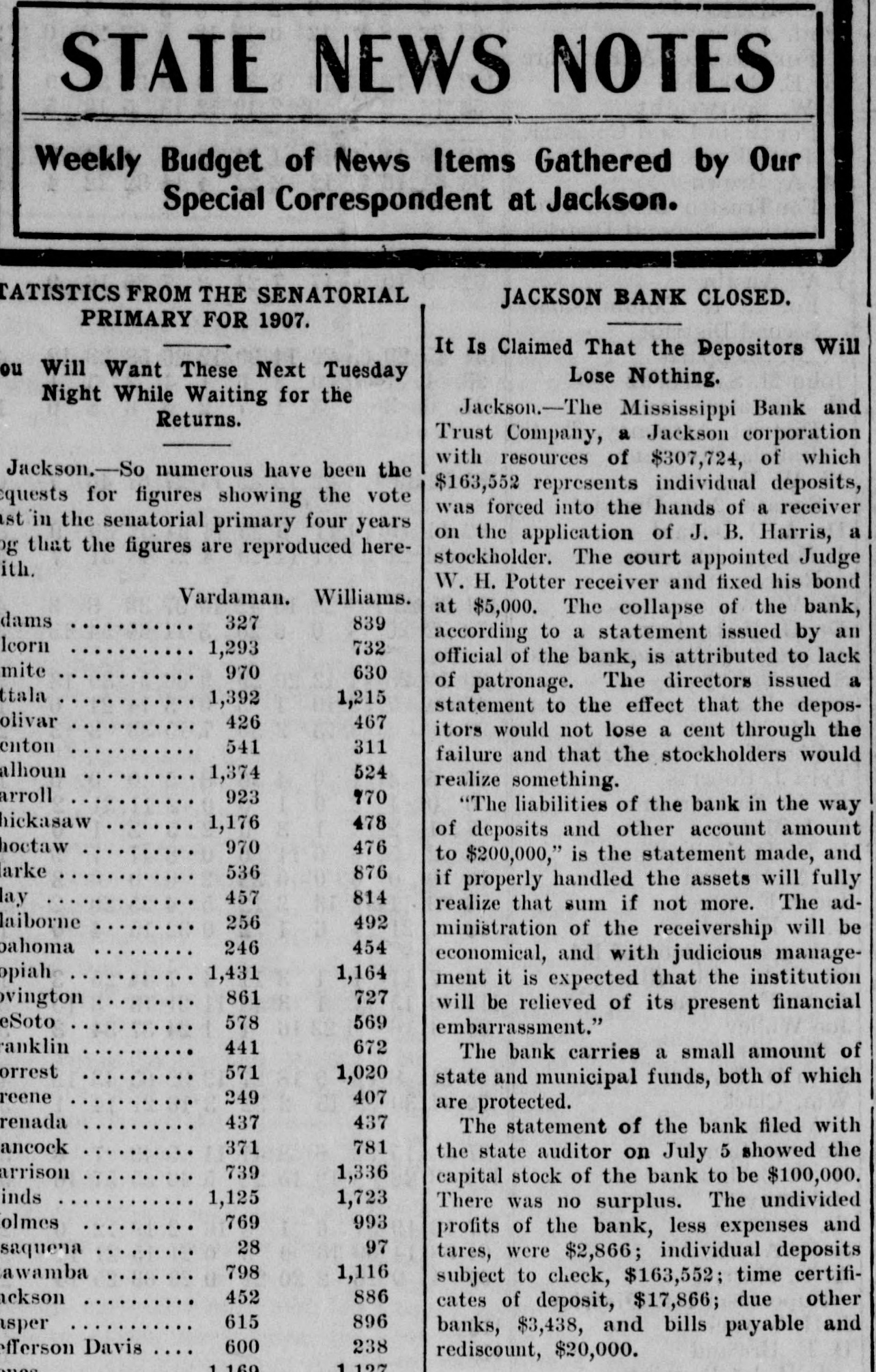 STATE NEWS NOTES Weekly Budget of News Items Gathered by Our Special Correspondent at Jackson. TATISTICS FROM THE SENATORIAL JACKSON BANK CLOSED. PRIMARY FOR 1907. It Is Claimed That the Depositors Will ou Will Want These Next Tuesday Lose Nothing. Night While Waiting for the Jackson.-The Mississippi Bank and Returns. Trust Company, a Jackson corporation with resources of $307,724, of which Jackson.-So numerous have been the $163,552 represents individual deposits, quests for figures showing the vote was forced into the hands of a receiver st in the senatorial primary four years on the application of J. B. Harris, a pg that the figures are reproduced herestockholder. The court appointed Judge ith. W. H. Potter receiver and fixed his bond Williams. Vardaman. at $5,000. The collapse of the bank, dams 327 839 according to a statement issued by an leorn 732 1,293 official of the bank, is attributed to lack mite 970 630 of patronage. The directors issued a ttala 1,392 1,215 statement to the effect that the deposolivar 467 426 itors would not lose a cent through the enton 311 541 failure and that the stockholders would alhoun 524 1,374 realize something. arroll 923 970 "The liabilities of the bank in the way hickasaw 478 1,176 of deposits and other account amount hoctaw 970 476 to $200,000," is the statement made, and arke 536 876 if properly handled the assets will fully 457 814 lay realize that sum if not more. The adlaiborne 256 492 ministration of the receivership will be bahoma 246 454 economical, and with judicious manage1,431 opiah 1,164 ment it is expected that the institution 727 861 vington will be relieved of its present financial eSoto 569 578 embarrassment." ranklin 672 441 The bank carries a small amount of orrest 571 1,020 state and municipal funds, both of which reene 407 249 are protected. renada 437 437 The statement of the bank filed with ancock 371 781 the state auditor on July 5 showed the 739 arrison 1,336 capital stock of the bank to be $100,000. inds 1,125 1,723 There was no surplus. The undivided 993 769 olmes profits of the bank, less expenses and 97 28 saquena tares, were $2,866; individual deposits 798 awamba 1,116 subject to check, $163,552; time certifi886 452 ckson cates of deposit, $17,866; due other 896 615 sper banks, $3,438, and bills payable and 600 238 efferson Davis rediscount, $20,000. 1 160 1197