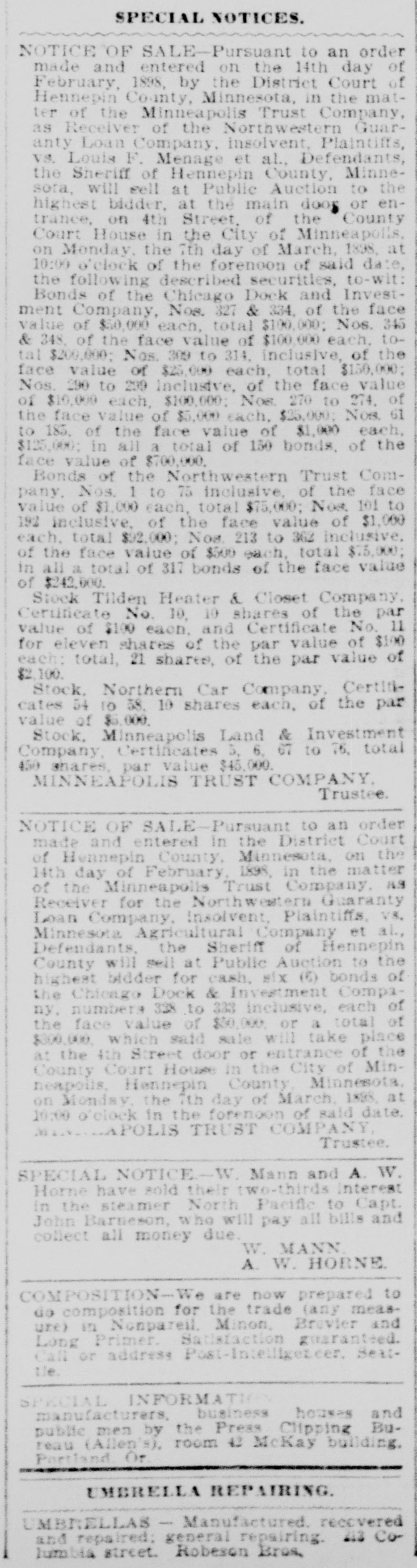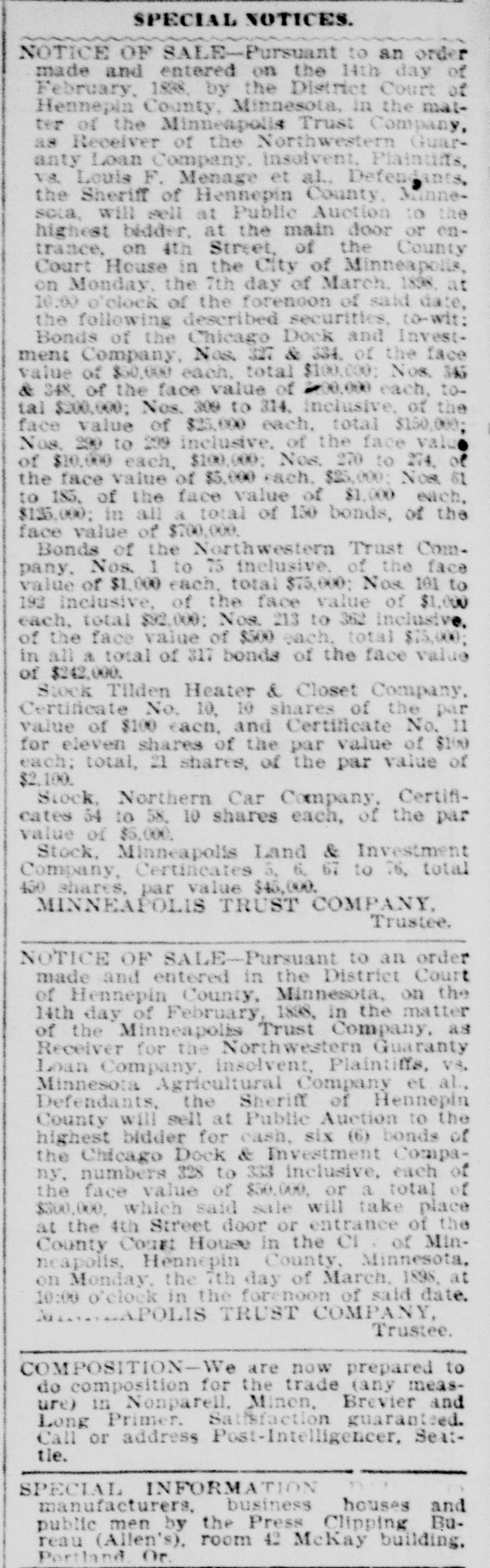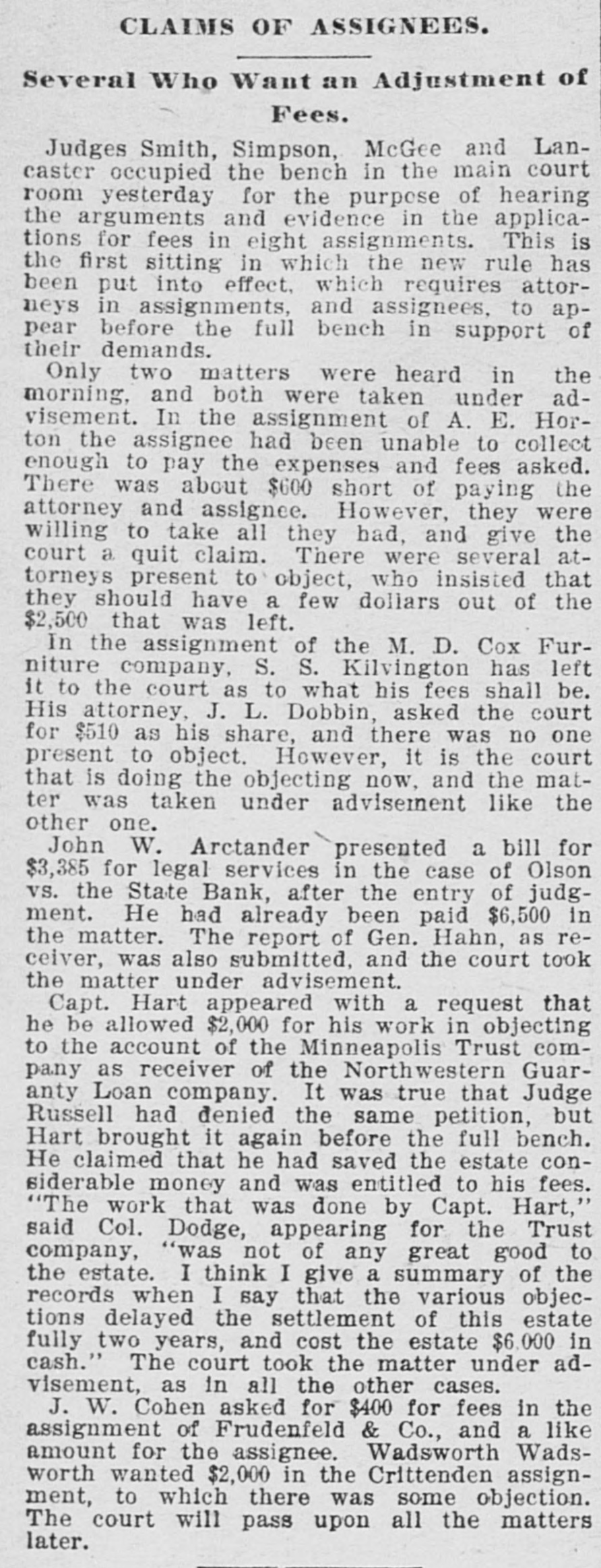 CLAIMS OF ASSIGNEES. Several Who Want an Adjustment of Fees. Judges Smith, Simpson, McGee and Lancaster occupied the bench in the main court room yesterday for the purpose of hearing the arguments and evidence in the applications for fees in eight assignments. This is the first sitting in which the new rule has been put into effect, which requires attorneys in assignments, and assignees, to appear before the full bench in support of their demands. Only two matters were heard in the morning, and both were taken under advisement. In the assignment of A. E. Horton the assignee had been unable to collect enough to pay the expenses and fees asked. There was about $600 short of paying the attorney and assignee. However, they were willing to take all they had, and give the court a quit claim. There were several attorneys present to object, who insisted that they should have a few dollars out of the $2,500 that was left. In the assignment of the M. D. Cox Furniture company, S. S. Kilvington has left it to the court as to what his fees shall be. His attorney, J. L. Dobbin, asked the court for $510 as his share, and there was no one present to object. However, it is the court that is doing the objecting now, and the matter was taken under advisement like the other one. John W. Arctander presented a bill for $3,385 for legal services in the case of Olson vs. the State Bank, after the entry of judgment. He had already been paid $6,500 in the matter. The report of Gen. Hahn, as receiver, was also submitted, and the court took the matter under advisement. Capt. Hart appeared with a request that he be allowed $2,000 for his work in objecting to the account of the Minneapolis Trust company as receiver of the Northwestern Guaranty Loan company. It was true that Judge Russell had denied the same petition, but Hart brought it again before the full bench. He claimed that he had saved the estate considerable money and was entitled to his fees. "The work that was done by Capt. Hart," said Col. Dodge, appearing for the Trust company, "was not of any great good to the estate. I think I give a summary of the records when I say that the various objections delayed the settlement of this estate fully two years, and cost the estate $6,000 in cash." The court took the matter under advisement, as in all the other cases. J. W. Cohen asked for $400 for fees in the assignment of Frudenfeld & Co., and a like amount for the assignee. Wadsworth Wadsworth wanted $2,000 in the Crittenden assignment, to which there was some objection. The court will pass upon all the matters later.