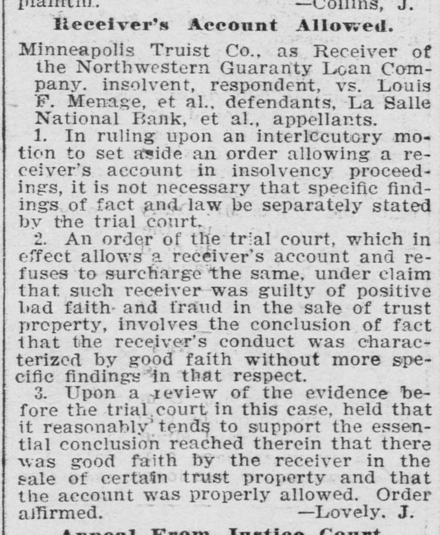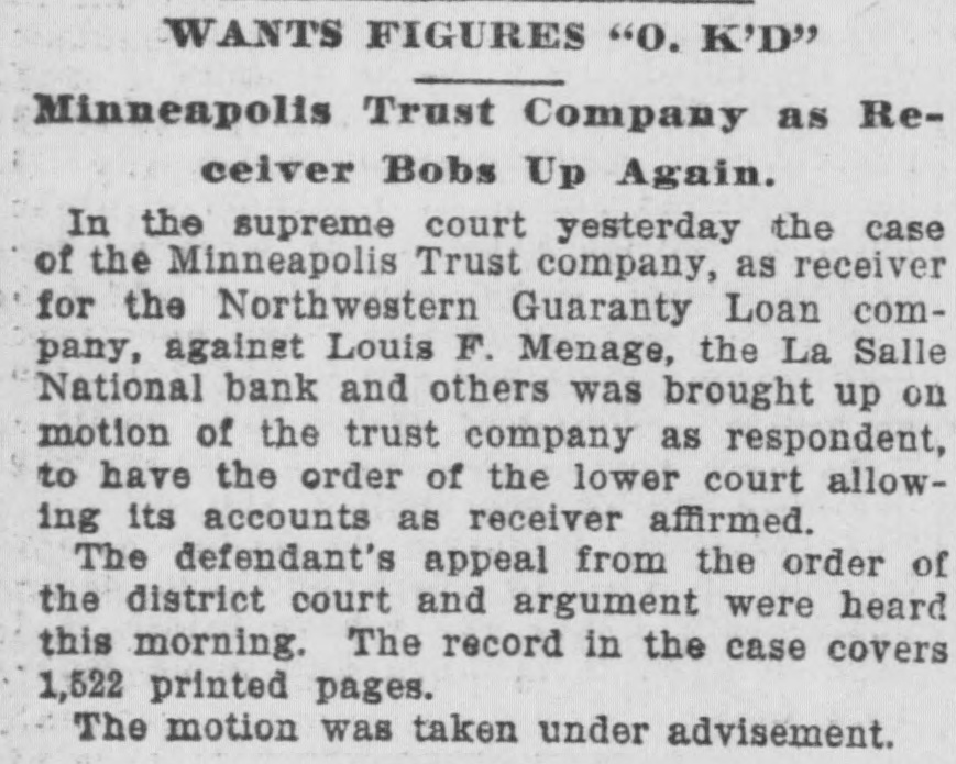 WANTS FIGURES "0. K'D" Minneapolis Trust Company as Receiver Bobs Up Again. In the supreme court yesterday the case of the Minneapolis Trust company, as receiver for the Northwestern Guaranty Loan company, against Louis F. Menage, the La Salle National bank and others was brought up on motion of the trust company as respondent, to have the order of the lower court allowing its accounts as receiver affirmed. The defendant's appeal from the order of the district court and argument were heard this morning. The record in the case covers 1,522 printed pages. The motion was taken under advisement.
