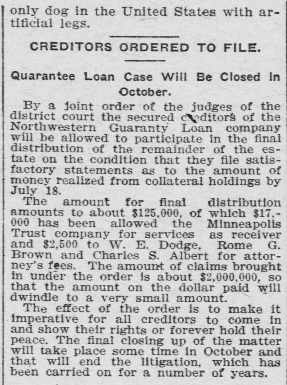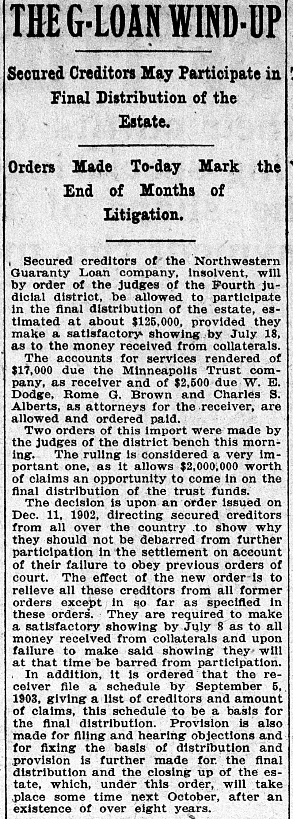 THE G-LOAN WIND-UP Secured Creditors May Participate in Final Distribution of the Estate. Orders Made To-day Mark the End of Months of Litigation. Secured creditors of the Northwestern Guaranty Loan company, insolvent, will by order of the judges of the Fourth judicial district, be allowed to participate in the final distribution of the estate, estimated at about $125,000, provided they make a satisfactory showing by July 18, as to the money received from collaterals. The accounts for services rendered of $17,000 due the Minneapolis Trust company, as receiver and of $2,500 due W. E. Dodge, Rome G. Brown and Charles S. Alberts, as attorneys for the receiver, are allowed and ordered paid. Two orders of this import were made by the judges of the district bench this morning. The ruling is considered a very important one, as it allows $2,000,000 worth of claims an opportunity to come in on the final distribution of the trust funds. The decision is upon an order issued on Dec. 11, 1902, directing secured creditors from all over the country to show why they should not be debarred from further participation in the settlement on account of their failure to obey previous orders of court. The effect of the new order is to relieve all these creditors from all former orders except in so far as specified in these orders. They are required to make a satisfactory showing by July 8 as to all money received from collaterals and upon failure to make said showing they will at that time be barred from participation. In addition, it is ordered that the receiver file a schedule by September 5, 1903, giving a list of creditors and amount of claims, this schedule to be a basis for the final distribution. Provision is also made for filing and hearing objections and for fixing the basis of distribution and provision is further made for. the final distribution and the closing up of the estate, which, under this order, will take place some time next October, after an existence of over eight years.