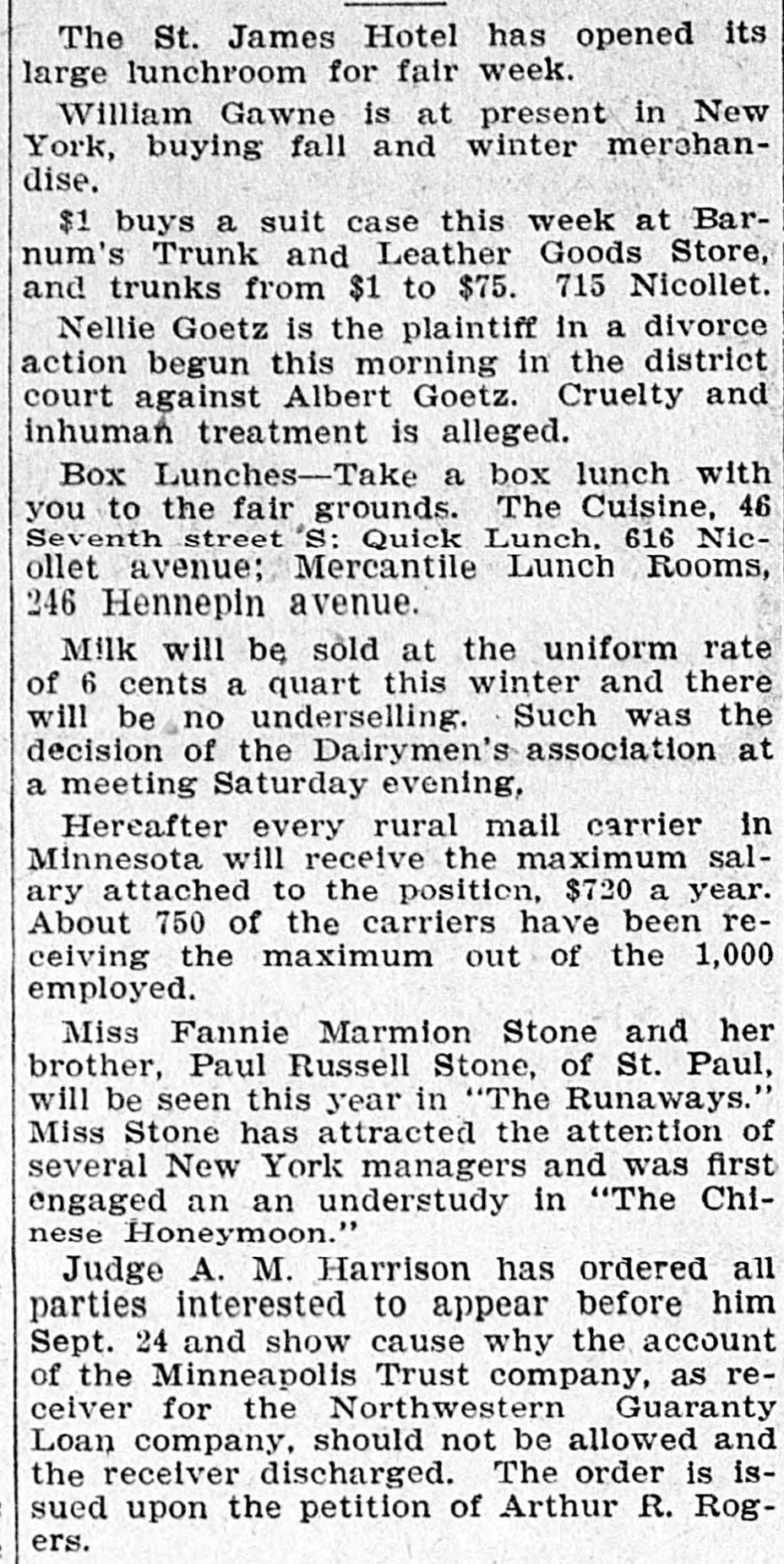 The St. James Hotel has opened its large lunchroom for fair week. William Gawne is at present in New York, buying fall and winter merchandise. $1 buys a suit case this week at Barnum's Trunk and Leather Goods Store, and trunks from $1 to $75. 715 Nicollet. Nellie Goetz is the plaintiff in a divorce action begun this morning in the district court against Albert Goetz. Cruelty and inhuman treatment is alleged. Box Lunches-Take a box lunch with you to the fair grounds. The Cuisine, 46 Seventh street S: Quick Lunch, 616 Nicollet avenue; Mercantile Lunch Rooms, 246 Hennepin avenue. Milk will be sold at the uniform rate of 6 cents a quart this winter and there will be no underselling. Such was the decision of the Dairymen's association at a meeting Saturday evening, Hereafter every rural mail carrier in Minnesota will receive the maximum salary attached to the position, $720 a year. About 750 of the carriers have been receiving the maximum out of the 1,000 employed. Miss Fannie Marmion Stone and her brother, Paul Russell Stone, of St. Paul, will be seen this year in "The Runaways." Miss Stone has attracted the attention of several New York managers and was first engaged an an understudy in "The Chinese Honeymoon." Judge A. M. Harrison has ordered all parties interested to appear before him Sept. 24 and show cause why the account of the Minneapolis Trust company, as receiver for the Northwestern Guaranty Loan company, should not be allowed and the receiver discharged. The order is issued upon the petition of Arthur R. Rogers.