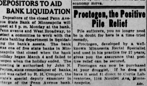 DEPOSITORS TO AID BANK LIQUIDATION Depositors of the closed Penn Avenue State Bank of Minneapolis Pile Relief m. Monday at the bank. Penn avenue and West Broadway. Pile sufferers, no longer need select to work with the in doubt for here a time ing the bank's assets. bank developed by wellwas of five state Rectal Specialist neapolis that closed the bank and used practice for 27 years, holiday began March and failed you the assurance that holiday The relief secured. meeting authorized by John be purchased of your druggist. If he does and called the direct Curtis special deputy oratories, 1108 Nicollet Minne of the Avenue bank Adv.