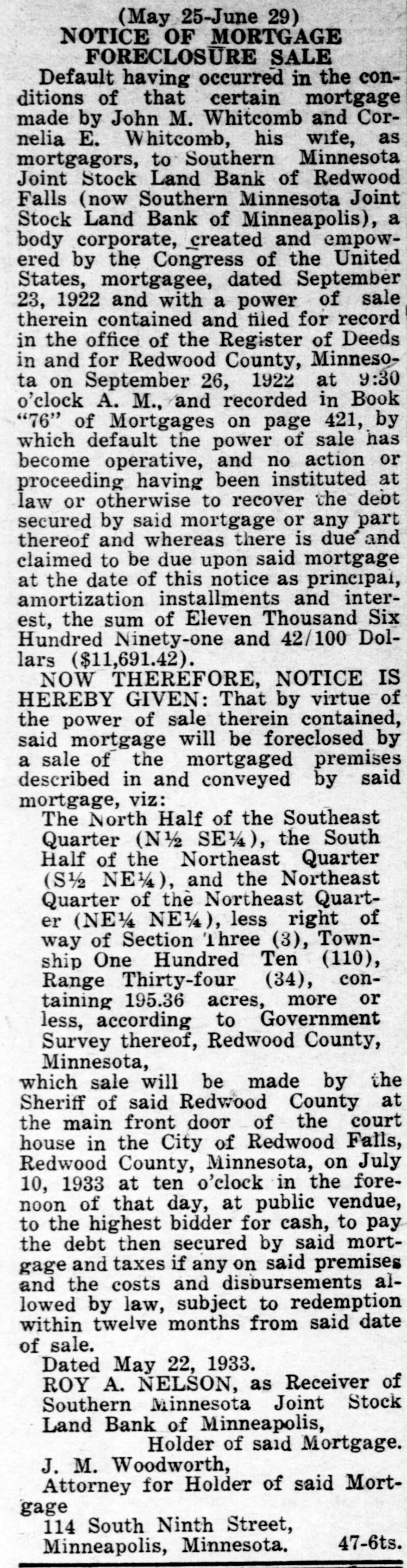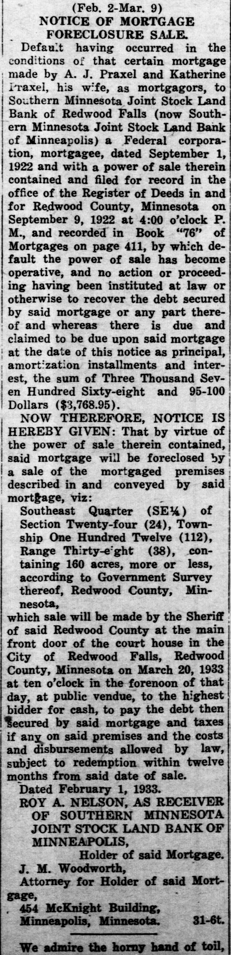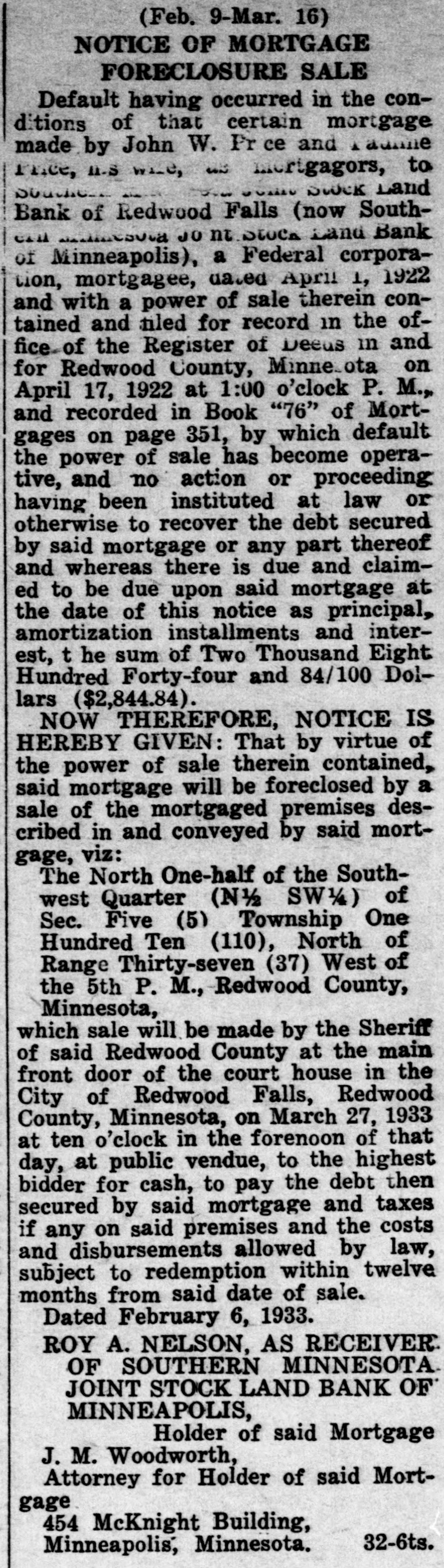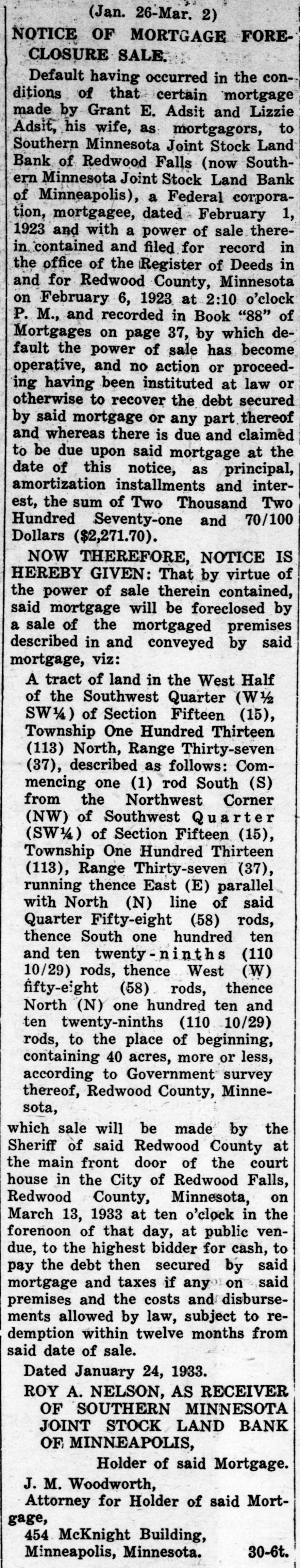(Jan. 26-Mar. 2) NOTICE OF MORTGAGE FORECLOSURE SALE. Default having occurred in the conditions of that certain mortgage made by Grant E. Adsit and Lizzie Adsit, his wife, as mortgagors, to Southern Minnesota Joint Stock Land Bank of Redwood Falls (now Southern Minnesota Joint Stock Land Bank of Minneapolis), a Federal corporation, mortgagee, dated February 1, 1923 and with a power of sale therein contained and filed for record in the office of the Register of Deeds in and for Redwood County, Minnesota on February 6, 1923 at 2:10 o'clock P. M., and recorded in Book "88" of Mortgages on page 37, by which default the power of sale has become operative, and no action or proceeding having been instituted at law or otherwise to recover the debt secured by said mortgage or any part thereof and whereas there is due and claimed to be due upon said mortgage at the date of this notice, as principal, amortization installments and interest, the sum of Two Thousand Two Hundred Seventy-one and 70/100 Dollars ($2,271.70). NOW THEREFORE, NOTICE IS HEREBY GIVEN: That by virtue of the power of sale therein contained, said mortgage will be foreclosed by a sale of the mortgaged premises described in and conveyed by said mortgage, viz: A tract of land in the West Half of the Southwest Quarter (W½ SW1/4) of Section Fifteen (15), Township One Hundred Thirteen (113) North, Range Thirty-seven (37), described as follows: Commencing one (1) rod South (S) from the Northwest Corner (NW) of Southwest Quarter (SW1/4) of Section Fifteen (15), Township One Hundred Thirteen (113), Range Thirty-seven (37), running thence East (E) parallel with North (N) line of said Quarter Fifty-eight (58) rods, thence South one hundred ten and ten twenty-ninths (110 10/29) rods, thence West (W) fifty-eight (58) rods, thence North (N) one hundred ten and ten twenty-ninths (110 10/29) rods, to the place of beginning, containing 40 acres, more or less, according to Government survey thereof, Redwood County, Minnesota, which sale will be made by the Sheriff of said Redwood County at the main front door of the court house in the City of Redwood Falls, Redwood County, Minnesota, on March 13, 1933 at ten o'clock in the forenoon of that day, at public vendue, to the highest bidder for cash, to pay the debt then secured by said mortgage and taxes if any on said premises and the costs and disbursements allowed by law, subject to redemption within twelve months from said date of sale. Dated January 24, 1933. ROY A. NELSON, AS RECEIVER OF SOUTHERN MINNESOTA JOINT STOCK LAND BANK OF MINNEAPOLIS, Holder of said Mortgage. J. M. Woodworth, Attorney for Holder of said Mortgage, 454 McKnight Building, 30-6t. Minneapolis, Minnesota.