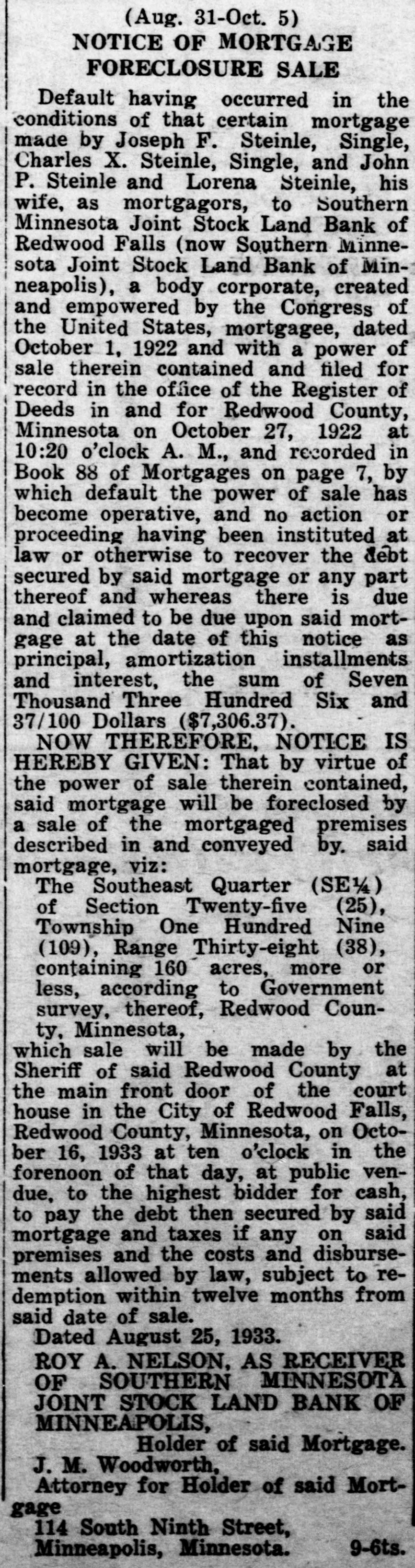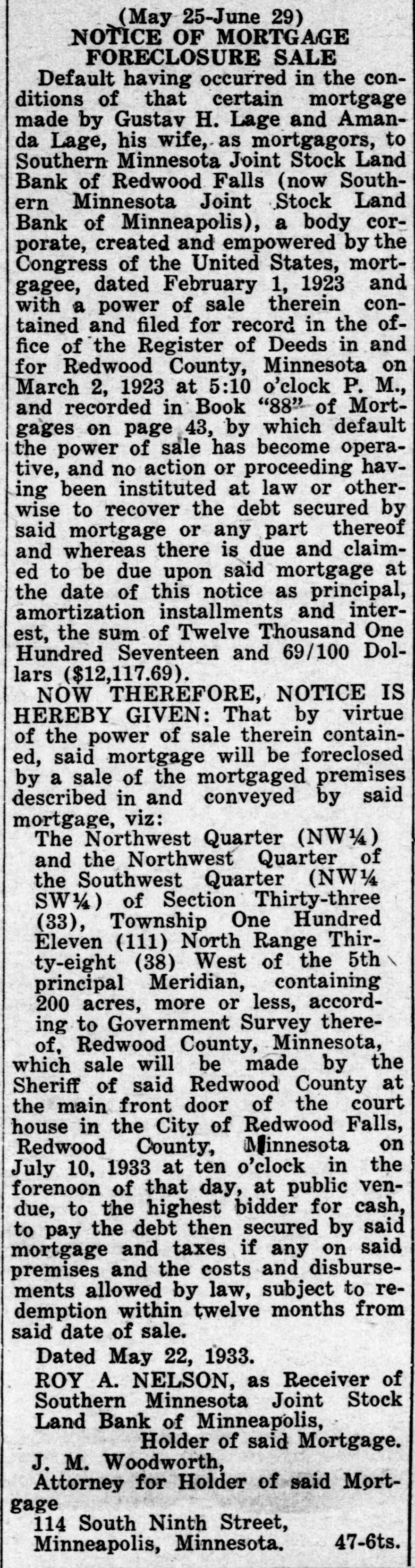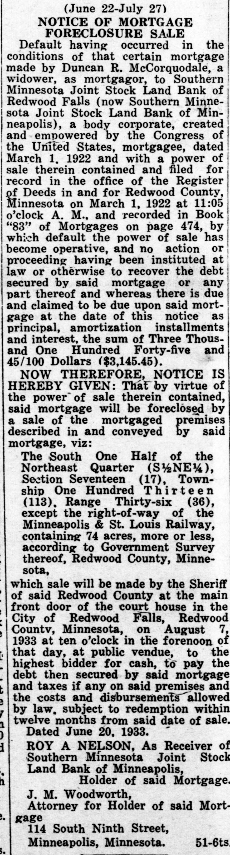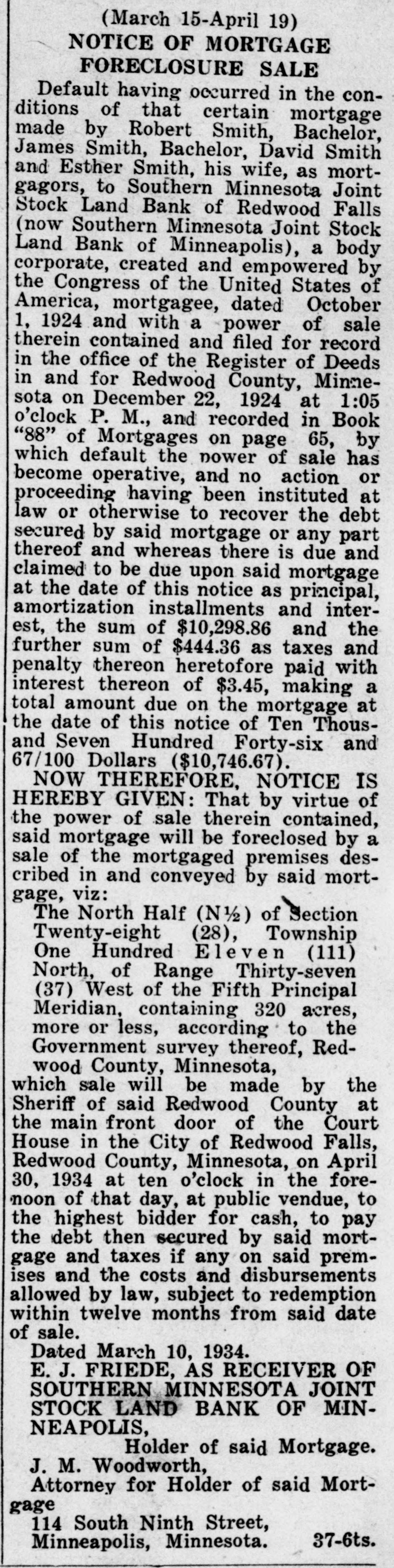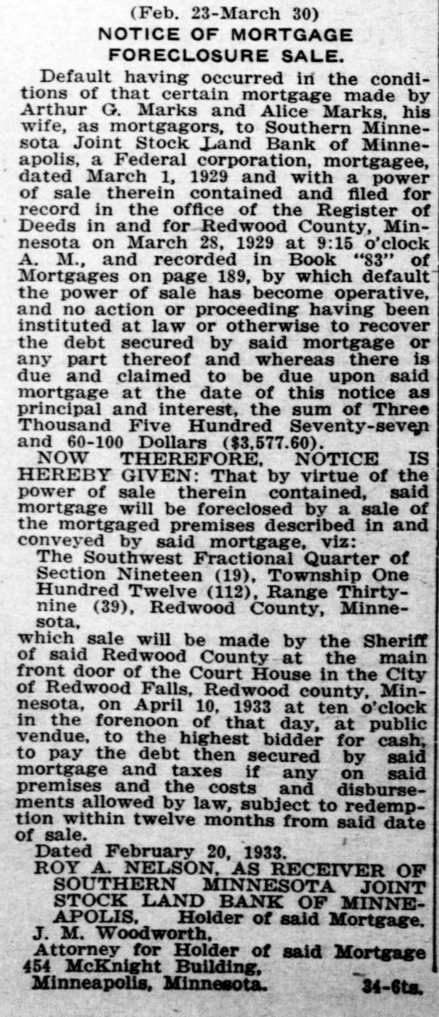 (Jan. 26-Mar. 2) NOTICE OF MORTGAGE FORECLOSURE SALE. Default having occurred in the conditions of that certain mortgage made by Grant E. Adsit and Lizzie Adsit, his wife, as mortgagors, to Southern Minnesota Joint Stock Land Bank of Redwood Falls (now Southern Minnesota Joint Stock Land Bank of Minneapolis), a Federal corporation, mortgagee, dated February 1, 1923 and with a power of sale therein contained and filed for record in the office of the Register of Deeds in and for Redwood County, Minnesota on February 6, 1923 at 2:10 o'clock P. M., and recorded in Book "88" of Mortgages on page 37, by which default the power of sale has become operative, and no action or proceeding having been instituted at law or otherwise to recover the debt secured by said mortgage or any part thereof and whereas there is due and claimed to be due upon said mortgage at the date of this notice, as principal, amortization installments and interest, the sum of Two Thousand Two Hundred Seventy-one and 70/100 Dollars ($2,271.70). NOW THEREFORE, NOTICE IS HEREBY GIVEN: That by virtue of the power of sale therein contained, said mortgage will be foreclosed by a sale of the mortgaged premises described in and conveyed by said mortgage, viz: A tract of land in the West Half of the Southwest Quarter (W½ SW1/4) of Section Fifteen (15), Township One Hundred Thirteen (113) North, Range Thirty-seven (37), described as follows: Commencing one (1) rod South (S) from the Northwest Corner (NW) of Southwest Quarter (SW1/4) of Section Fifteen (15), Township One Hundred Thirteen (113), Range Thirty-seven (37), running thence East (E) parallel with North (N) line of said Quarter Fifty-eight (58) rods, thence South one hundred ten and ten twenty-ninths (110 10/29) rods, thence West (W) fifty-eight (58) rods, thence North (N) one hundred ten and ten twenty-ninths (110 10/29) rods, to the place of beginning, containing 40 acres, more or less, according to Government survey thereof, Redwood County, Minnesota, which sale will be made by the Sheriff of said Redwood County at the main front door of the court house in the City of Redwood Falls, Redwood County, Minnesota, on March 13, 1933 at ten o'clock in the forenoon of that day, at public vendue, to the highest bidder for cash, to pay the debt then secured by said mortgage and taxes if any on said premises and the costs and disbursements allowed by law, subject to redemption within twelve months from said date of sale. Dated January 24, 1933. ROY A. NELSON, AS RECEIVER OF SOUTHERN MINNESOTA JOINT STOCK LAND BANK OF MINNEAPOLIS, Holder of said Mortgage. J. M. Woodworth, Attorney for Holder of said Mortgage, 454 McKnight Building, 30-6t. Minneapolis, Minnesota.