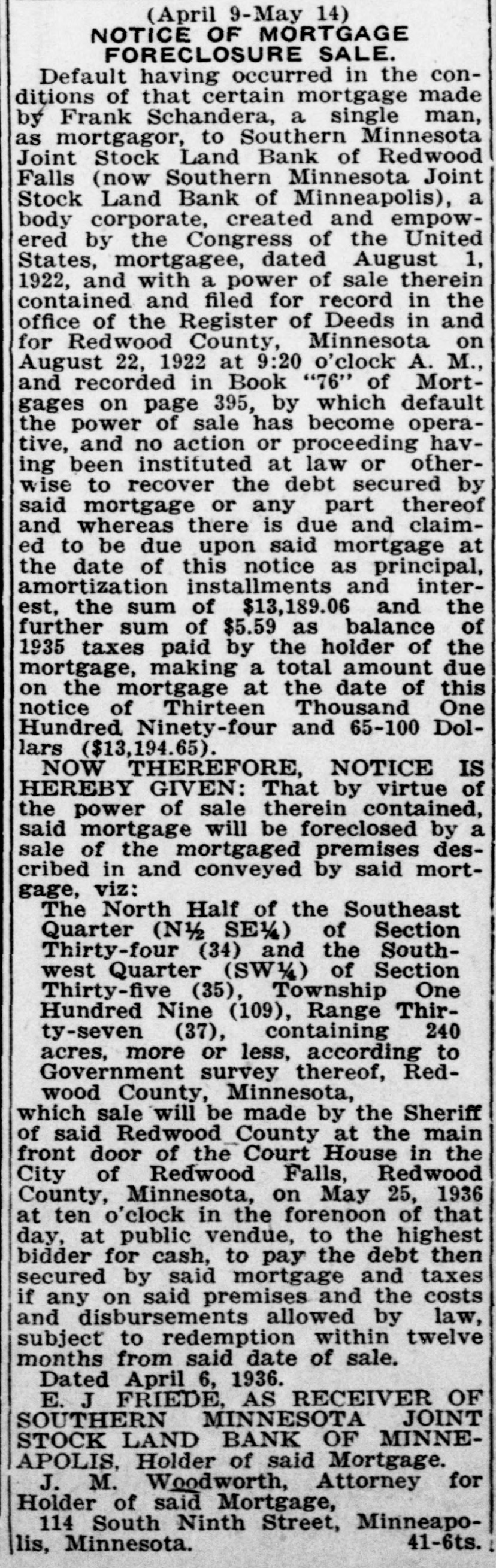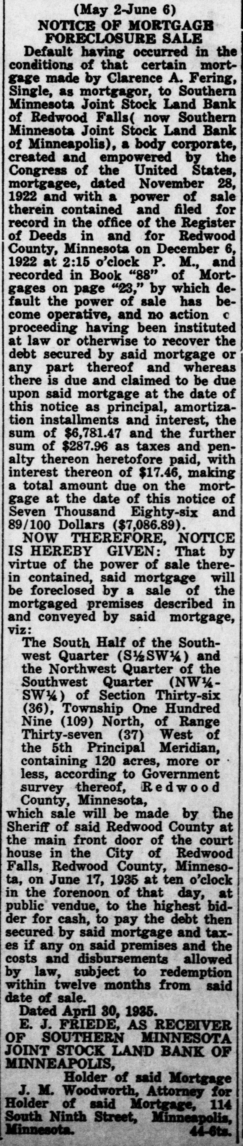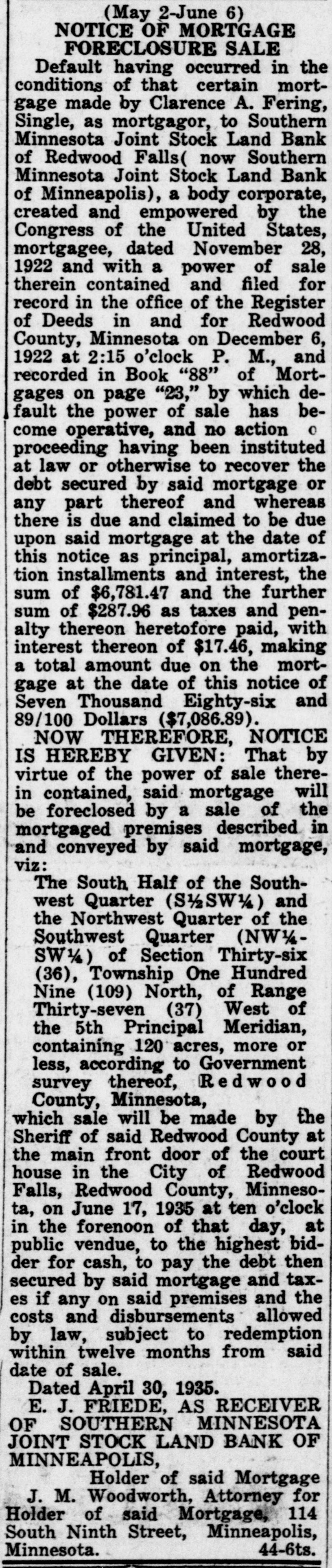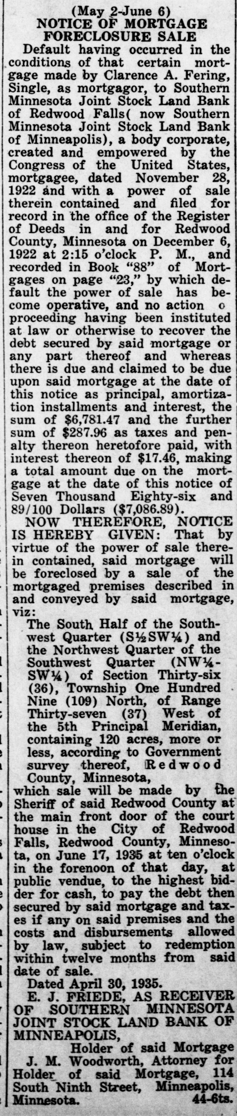 (May 2-June 6) NOTICE OF MORTGAGE FORECLOSURE SALE Default having occurred in the conditions of that certain mortgage made by Clarence A. Fering, Single, as mortgagor, to Southern Minnesota Joint Stock Land Bank of Redwood Falls( now Southern Minnesota Joint Stock Land Bank of Minneapolis), a body corporate, created and empowered by the Congress of the United States, mortgagee, dated November 28, 1922 and with a power of sale therein contained and filed for record in the office of the Register of Deeds in and for Redwood County, Minnesota on December 6, 1922 at 2:15 o'clock P. M., and recorded in Book "88" of Mortgages on page "23," by which default the power of sale has become operative, and no action 0 proceeding having been instituted at law or otherwise to recover the debt secured by said mortgage or any part thereof and whereas there is due and claimed to be due upon said mortgage at the date of this notice as principal, amortization installments and interest, the sum of $6,781.47 and the further sum of $287.96 as taxes and penalty thereon heretofore paid, with interest thereon of $17.46, making a total amount due on the mortgage at the date of this notice of Seven Thousand Eighty-six and 89/100 Dollars ($7,086.89). NOW THEREFORE, NOTICE IS HEREBY GIVEN: That by virtue of the power of sale therein contained, said mortgage will be foreclosed by a sale of the mortgaged premises described in and conveyed by said mortgage, viz: The South Half of the Southwest Quarter (S/SW) and the Northwest Quarter of the Southwest Quarter (NW½SW½) of Section Thirty-six (36), Township One Hundred Nine (109) North, of Range Thirty-seven (37) West of the 5th Principal Meridian, containing 120 acres, more or less, according to Government survey thereof, Redwood County, Minnesota, which sale will be made by the Sheriff of said Redwood County at the main front door of the court house in the City of Redwood Falls, Redwood County, Minnesota, on June 17, 1935 at ten o'clock in the forenoon of that day, at public vendue, to the highest bidder for cash, to pay the debt then secured by said mortgage and taxes if any on said premises and the costs and disbursements allowed by law, subject to redemption within twelve months from said date of sale. Dated April 30, 1935. E. J. FRIEDE, AS RECEIVER OF SOUTHERN MINNESOTA JOINT STOCK LAND BANK OF MINNEAPOLIS, Holder of said Mortgage J. M. Woodworth, Attorney for Holder of said Mortgage, 114 South Ninth Street, Minneapolis, Minnesota. 44-6ts.
