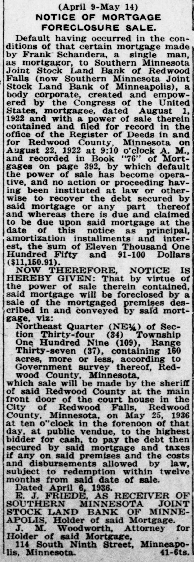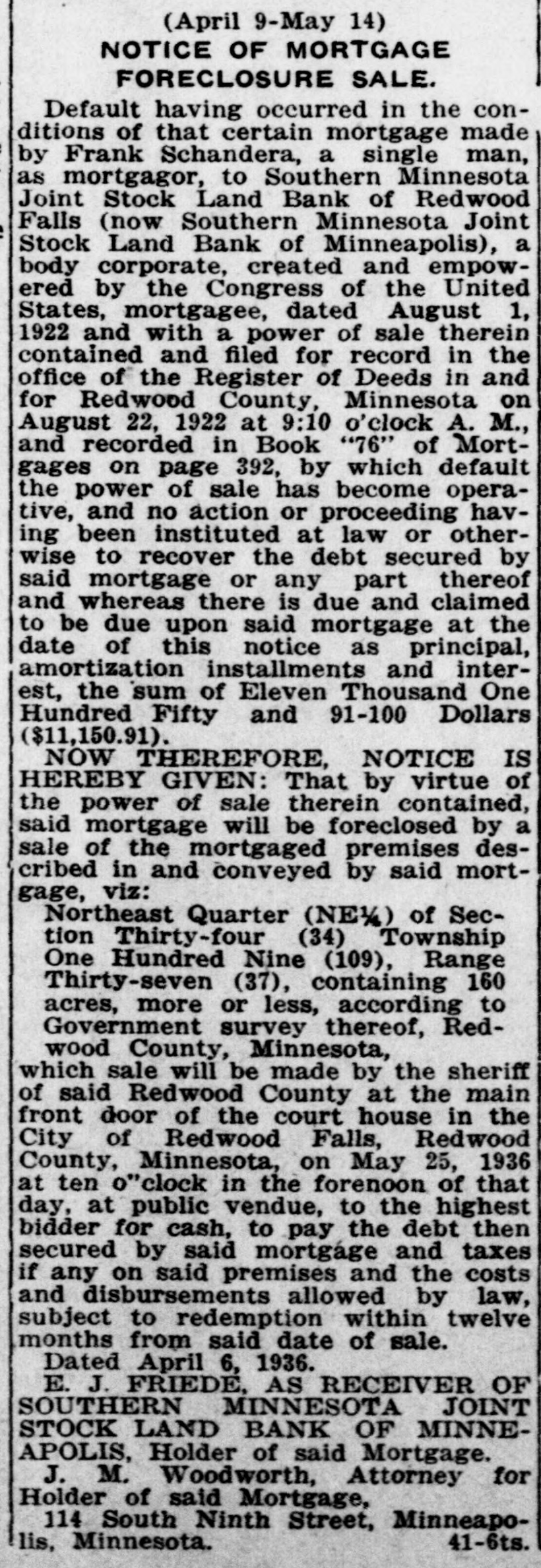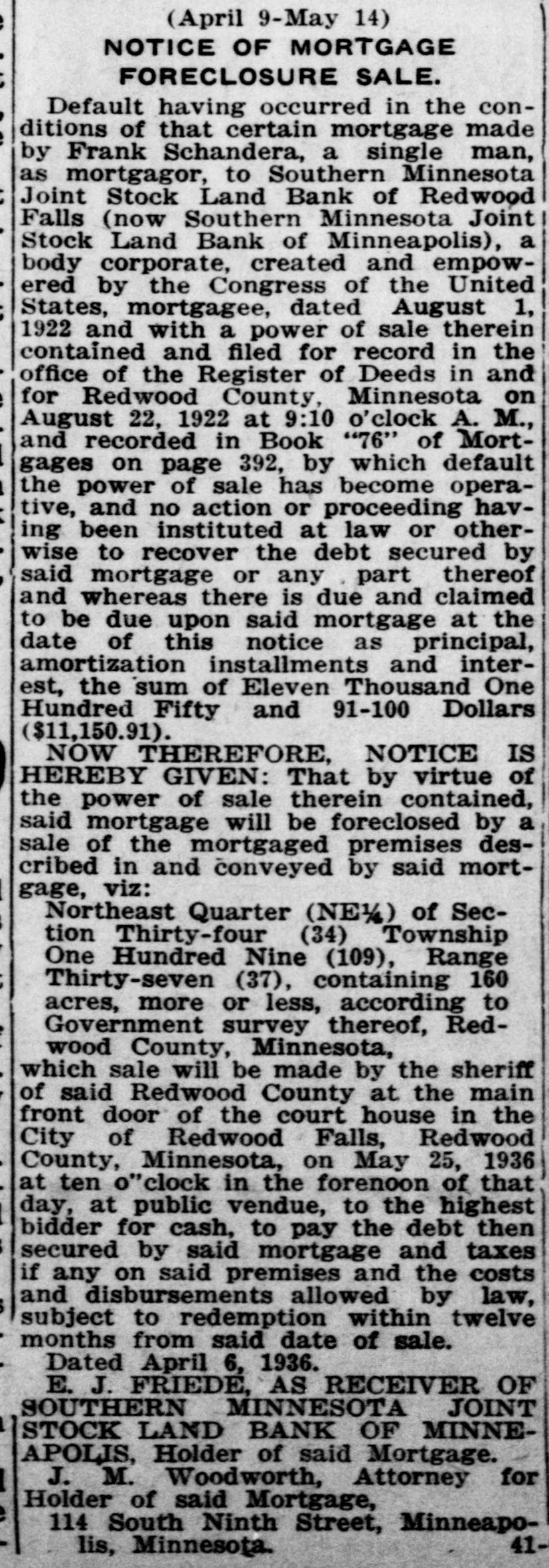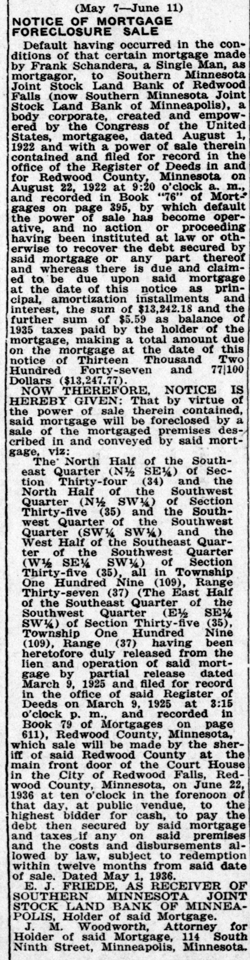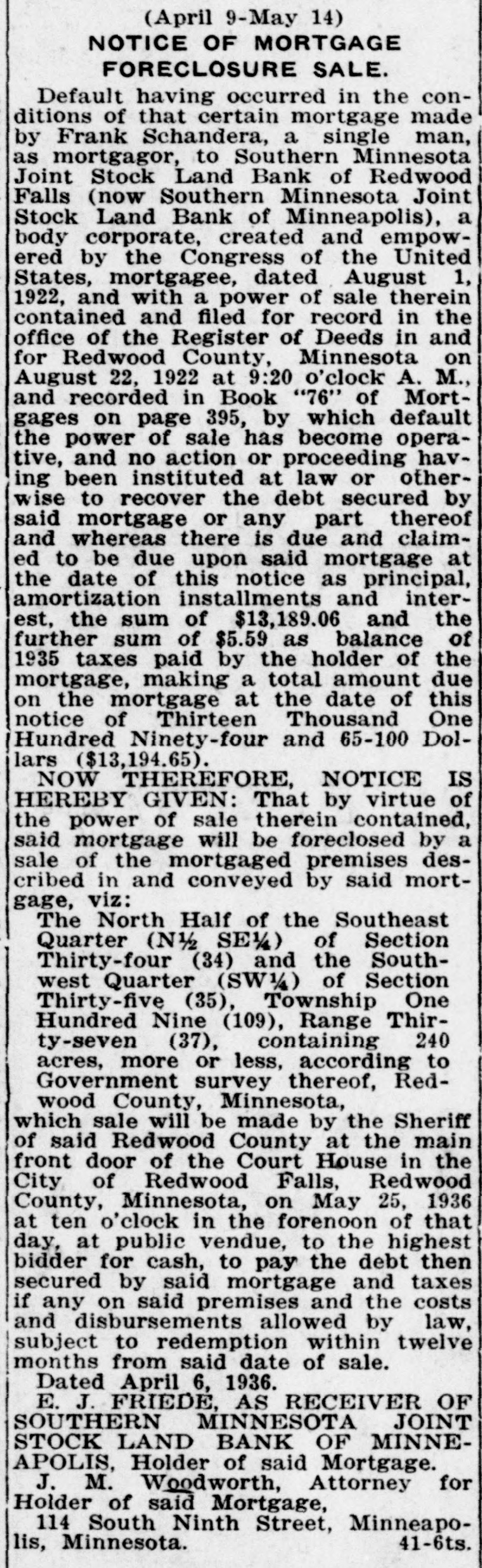 (May 2-June 6) NOTICE OF MORTGAGE FORECLOSURE SALE Default having occurred in the conditions of that certain mortgage made by Clarence A. Fering, Single, as mortgagor, to Southern Minnesota Joint Stock Land Bank of Redwood Falls( now Southern Minnesota Joint Stock Land Bank of Minneapolis), a body corporate, created and empowered by the Congress of the United States, mortgagee, dated November 28, 1922 and with a power of sale therein contained and filed for record in the office of the Register of Deeds in and for Redwood County, Minnesota on December 6, 1922 at 2:15 o'clock P. M., and recorded in Book "88" of Mortgages on page "23," by which default the power of sale has become operative, and no action 0 proceeding having been instituted at law or otherwise to recover the debt secured by said mortgage or any part thereof and whereas there is due and claimed to be due upon said mortgage at the date of this notice as principal, amortization installments and interest, the sum of $6,781.47 and the further sum of $287.96 as taxes and penalty thereon heretofore paid, with interest thereon of $17.46, making a total amount due on the mortgage at the date of this notice of Seven Thousand Eighty-six and 89/100 Dollars ($7,086.89). NOW THEREFORE, NOTICE IS HEREBY GIVEN: That by virtue of the power of sale therein contained, said mortgage will be foreclosed by a sale of the mortgaged premises described in and conveyed by said mortgage, viz: The South Half of the Southwest Quarter (S/SW) and the Northwest Quarter of the Southwest Quarter (NW½SW½) of Section Thirty-six (36), Township One Hundred Nine (109) North, of Range Thirty-seven (37) West of the 5th Principal Meridian, containing 120 acres, more or less, according to Government survey thereof, Redwood County, Minnesota, which sale will be made by the Sheriff of said Redwood County at the main front door of the court house in the City of Redwood Falls, Redwood County, Minnesota, on June 17, 1935 at ten o'clock in the forenoon of that day, at public vendue, to the highest bidder for cash, to pay the debt then secured by said mortgage and taxes if any on said premises and the costs and disbursements allowed by law, subject to redemption within twelve months from said date of sale. Dated April 30, 1935. E. J. FRIEDE, AS RECEIVER OF SOUTHERN MINNESOTA JOINT STOCK LAND BANK OF MINNEAPOLIS, Holder of said Mortgage J. M. Woodworth, Attorney for Holder of said Mortgage, 114 South Ninth Street, Minneapolis, Minnesota. 44-6ts.