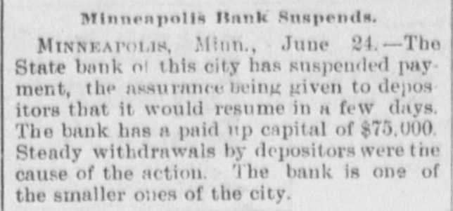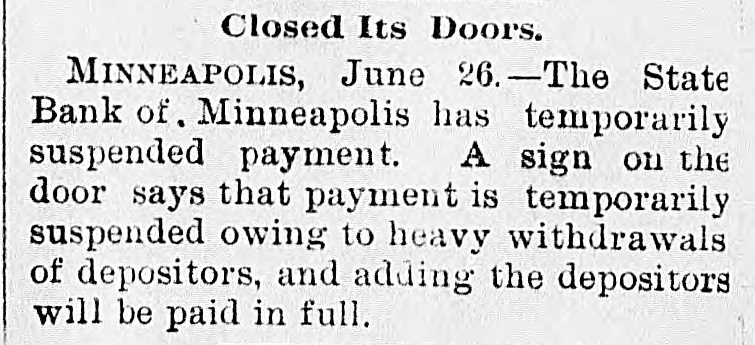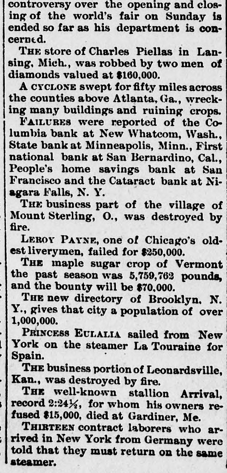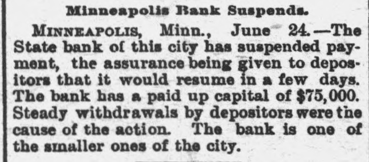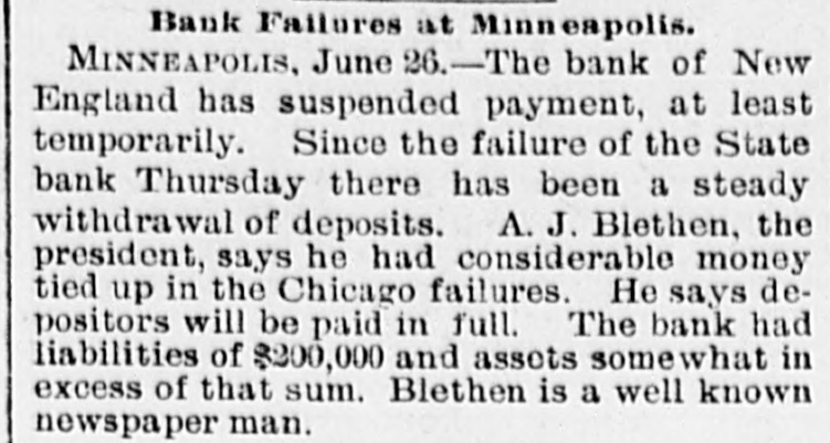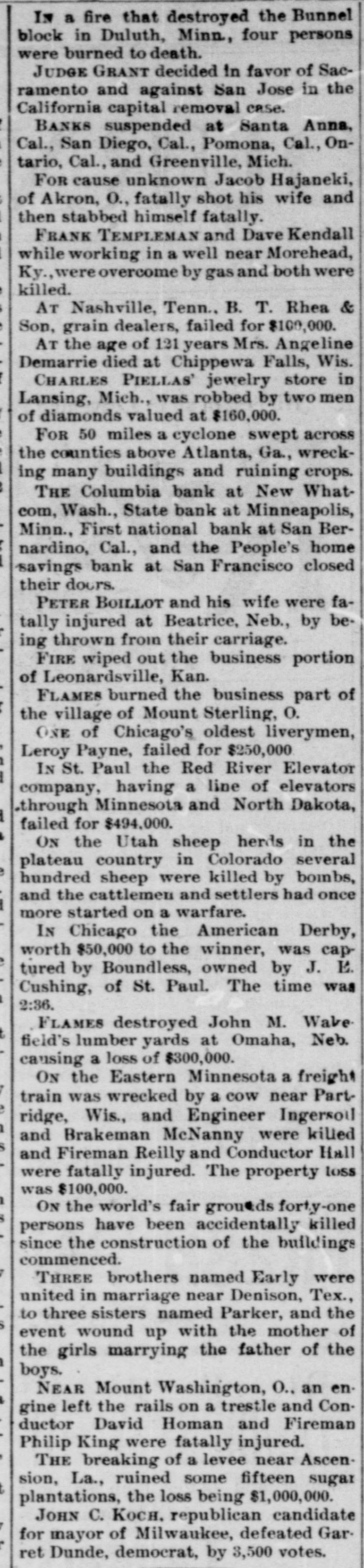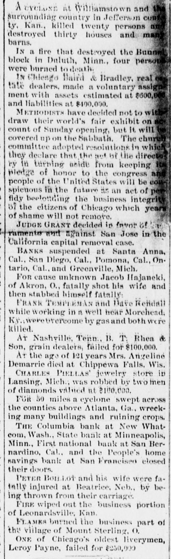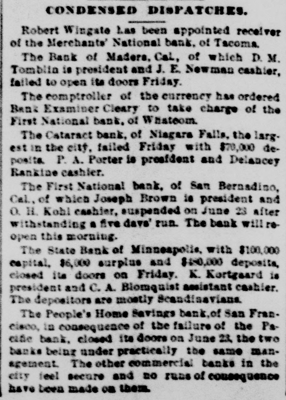 THE DAILY LIST. Banks and Business Houses Forced to Suspend-New York Troubles. NEW YORK, June 23.-Sheridan and Byrne, builders, are financially embarrassed. Their liabilities exceed $225,000. Abraham Steers, one of the largest lumber merchants and planing mill men in the city is temporarily embarrassed. being unable to get further accommodations. His creditors today granted an extension. His liabilities are $380,000, assets $475,000. Its Doors Still Closed. SAN FRANCISCO, June 23.-The Pacific National bank did not reopen its doors today. The deposits amount to about $1,500,000. Its loans and discounts are said to be $2,500,000. The embarrassment appears to be entirely due to the recent monetary troubles, and it is expected the depositors will lose nothing. The officers of the bank say they will resume in a short time. It may be that the closing down of the Pacific bank will result in the suspension of the People's Home Savings bank, a collateral institution, under practically the same management. Its total deposits are about $1,700,000. There is no apprehension as to runs on other banks. Cataract Bank Fails. NIAGARA FALLS, June 23.-The Cataract bank of this city the largest bank in Niagara county, closed its doors at noon. There is great excitement among the business men in consequence as over $700,000 of their money was on deposit there. Resources More Than the Liabilities. SAN FRANCISCO, Cal., June 23.-The People's Home Savings bank closed its doors this morning. It affiliated with the Pacific bank which closed its doors yesterday. The resources are said to exceed the liabilities. Depositors Forced the Suspension. MINNEAPOLIS, Minn., June 23.-The state bank of this city suspended payment this morning. Assurance is given that it will resume in a few days. The bank has a paid up capital of $75,000. Steady withdrawals by depositors were the cause of the action. A Week's Disasters. NEW YORK, June 23.-Bradstreet's reports 360 failures in the United States this week, against 159 for the week a year ago. Stood the Run for Five Days. SAN BERNARDO, Cal., June 23.-The First National Bank closed its doors today, after undergoing a run for the past five days. ) Banks Reported as Failed. WASHINGTON, June 23.-Controller Eckels has been officially informed of the failure yesterday of the following national banks: The First national bank of Kendallville, Ind.: the First national bank of Santal Ana, Cal., and the First national bank of Whatcom, Wash.