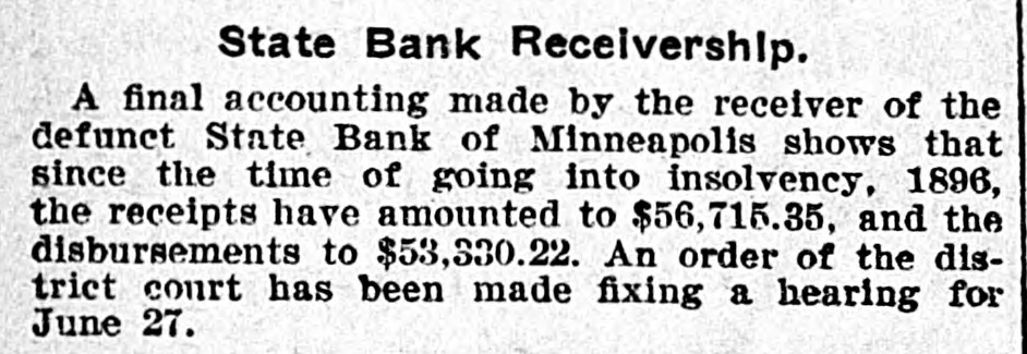 State Bank Receivership. A final accounting made by the receiver of the defunct State Bank of Minneapolis shows that since the time of going into insolvency, 1896, the receipts have amounted to $56,715.35, and the disbursements to $53,330.22. An order of the district court has been made fixing a hearing for June 27.
