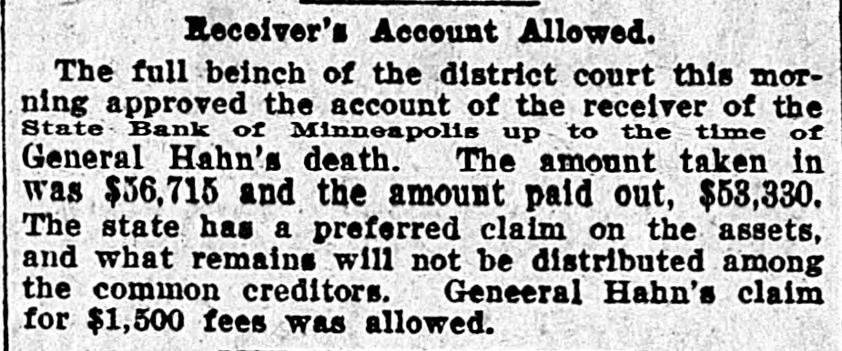 Receiver's Account Allowed. The full beinch of the district court this morning approved the account of the receiver of the State Bank of Minneapolis up to the time of General Hahn's death. The amount taken in was $36,715 and the amount paid out, $53,330. The state has a preferred claim on the assets, and what remains will not be distributed among the common creditors. Geneeral Hahn's claim for $1,500 fees was allowed.