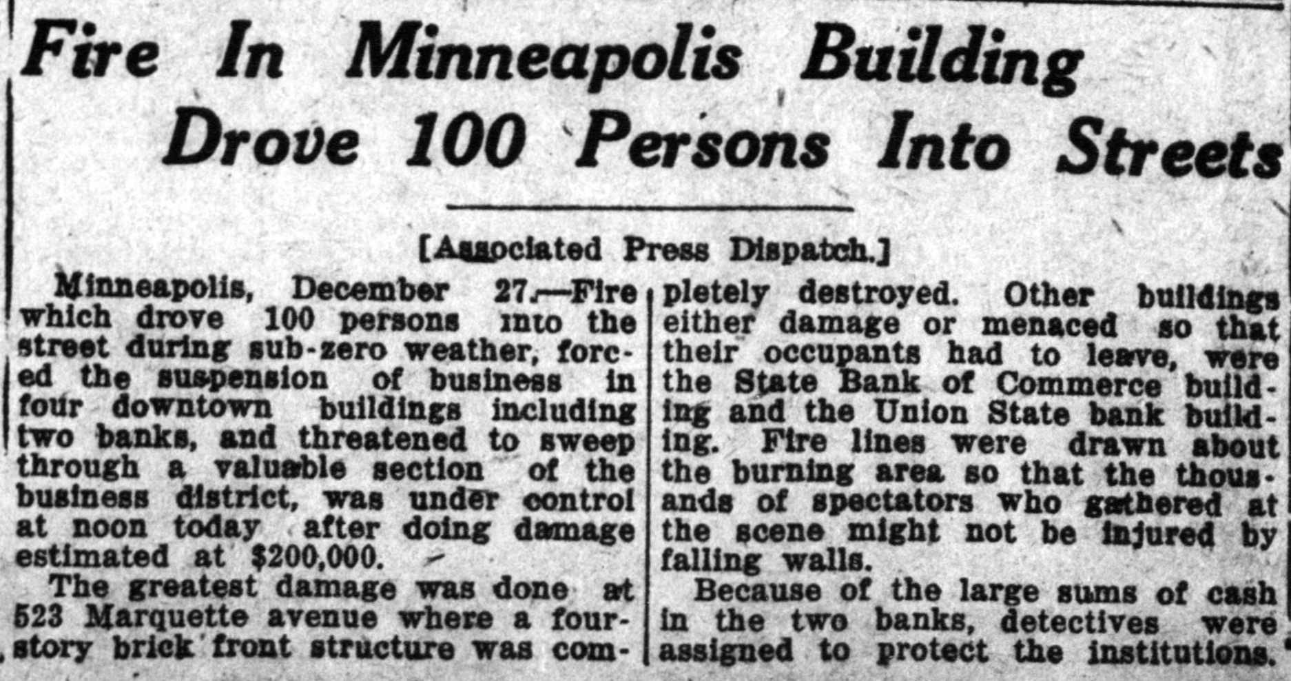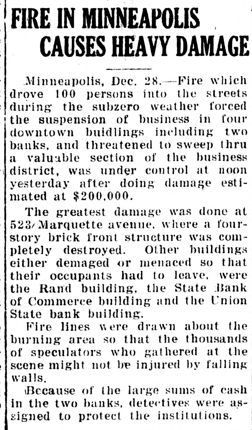 FIRE IN MINNEAPOLIS CAUSES HEAVY DAMAGE Minneapolis, Dec. 28. Fire which drove 100 persons into the streets during the subzero weather forced the suspension of business in four downtown buidlings including two banks, and threatened to sweep thru a valuable section of the business district, was under control at noon yesterday after doing damage estimated at $200,000. The greatest damage was done at 523/ Marquette avenue. where a fourstory brick front structure was completely destroyed. Other buildings either demaged or menaced SO that their occupants had to leave, were the Rand building. the State Bank of Commerce building and the Union State bank building. Fire lines were drawn about the burning area SO that the thousands of speculators who gathered at the scene might not be injured by falling walls. Because of the large sums of cash in the two banks, detectives were assigned to protect the institutions.