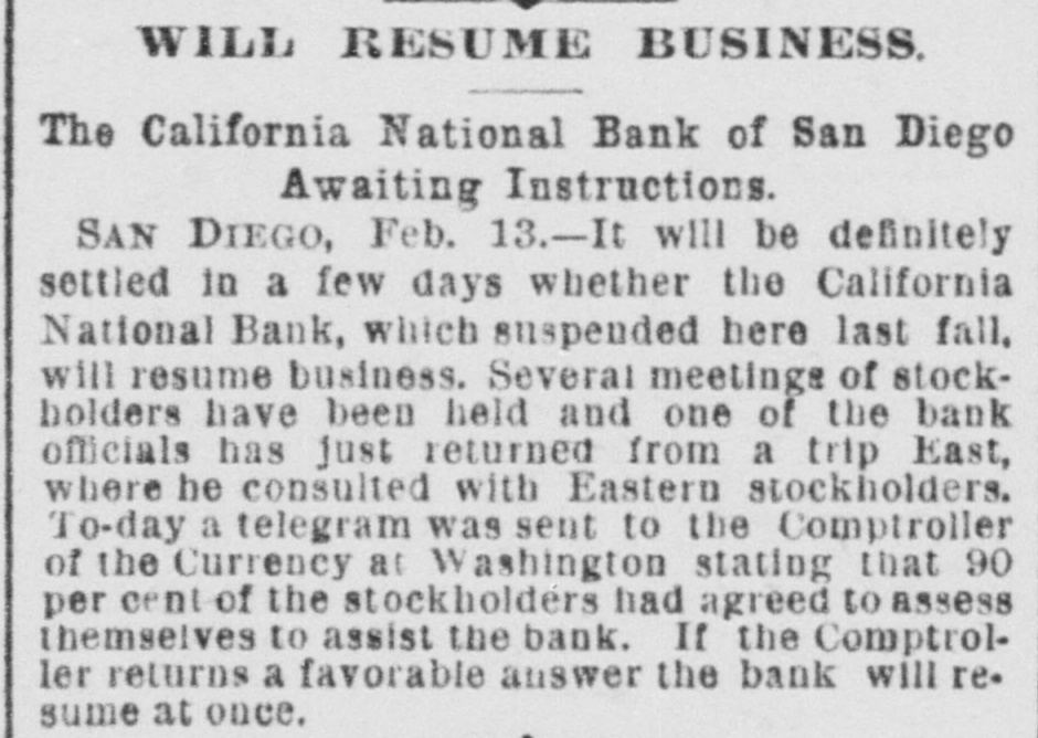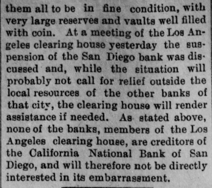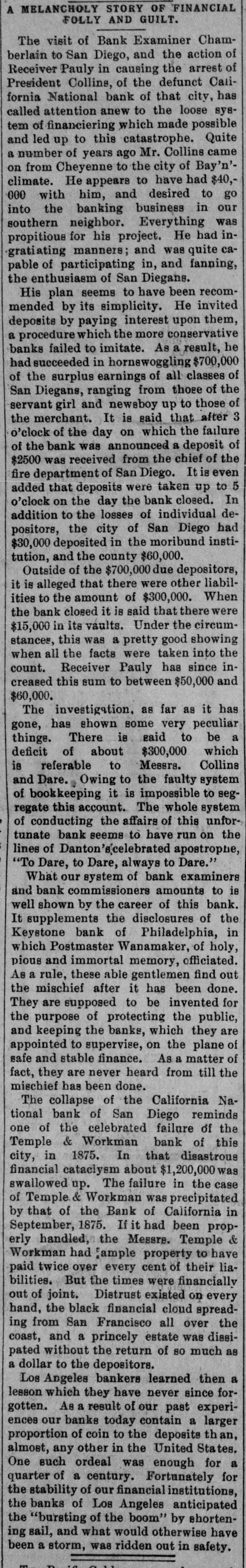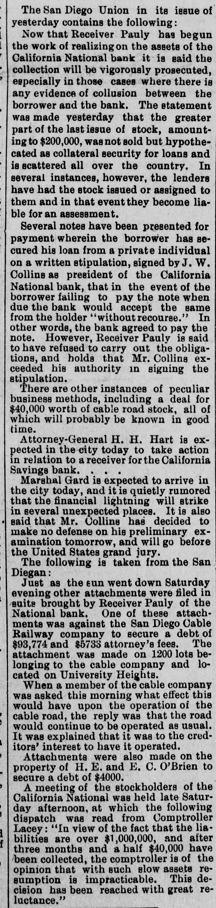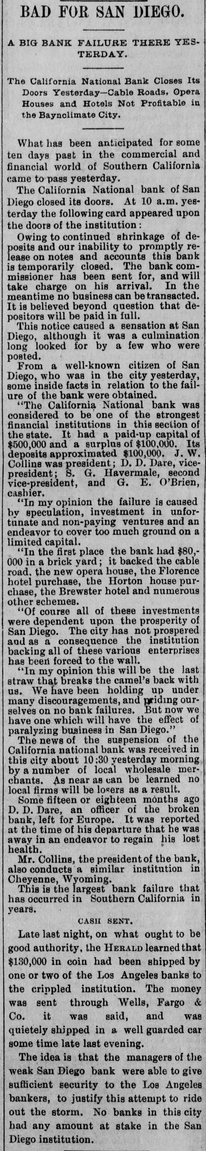BAD FOR SAN DIEGO. A BIG BANK FAILURE THERE YESTERDAY. The California National Bank Closes Its Doors Yesterday-Cable Roads, Opera Houses and Hotels Not Profitable in the Baynclimate City. What has been anticipated for some ten days past in the commercial and financial world of Southern California came to pass yesterday. The California National bank of San Diego closed its doors. At 10 a.m. yesterday the following card appeared upon the doors of the institution Owing to continued shrinkage of deposits and our inability to promptly release on notes and accounts this bank is temporarily closed. The bank commissioner has been sent for, and will take charge on his arrival. In the meantime no business can be transacted. It is believed beyond question that depositors will be paid in full. This notice caused a sensation at San Diego, although it was a culmination long looked for by a few who were posted. From a well-known citizen of San Diego, who was in the city yesterday, some inside facts in relation to the failure of the bank were obtained. "The California National bank was considered to be one of the strongest financial institutions in this section of the state. It had a paid-up capital of $500,000 and a surplus of $100,000. Its deposits approximated $100,000. J. W. Collins was president; D. D. Dare, vicepresident; S. G. Havermale, second vice-president, and G. E. O'Brien, cashier. "In my opinion the failure is caused by speculation, investment in unfortunate and non-paying ventures and an endeavor to cover too much ground on a limited capital. "In the first place the bank had $80,000 in a brick yard; it backed the cable road, the new opera house, the Florence hotel purchase, the Horton house purchase, the Brewster hotel and numerous other schemes. "Of course all of these investments were dependent upon the prosperity of San Diego. The city has not prospered and as a consequence the institution backing all of these various enterprises has been forced to the wall. "In my opinion this will be the last straw that breaks the camel's back with us. We have been holding up under many discouragements, and priding ourselves on no bank failures. But now we have one which will have the effect of paralyzing business in San Diego." The news of the suspension of the California national bank was received in this city about 10 :30 yesterday morning by a number of local wholesale merchants. As near as can be learned no local firms will be losers as a result. Some fifteen or eighteen months ago D. D. Dare, an officer of the broken bank, left for Europe. It was reported at the time of his departure that he was away in an endeavor to regain his lost health. Mr. Collins, the president of the bank, also conducts a similar institution in Cheyenne, Wyoming. This is the largest bank failure that has occurred in Southern California in years. CASH SENT. Late last night, on what ought to be good authority, the HERALD learned that $130,000 in coin had been shipped by one or two of the Los Angeles banks to the crippled institution. The money was sent through Wells, Fargo & Co. it was said, and was quietely shipped in a well guarded car some time late last evening. The idea is that the managers of the weak San Diego bank were able to give sufficient security to the Los Angeles bankers, to justify this attempt to ride out the storm. No banks in this city had any amount at stake in the San Diego institution.