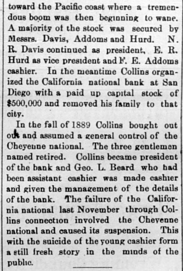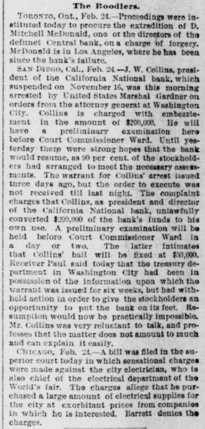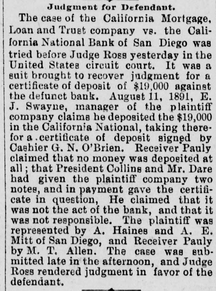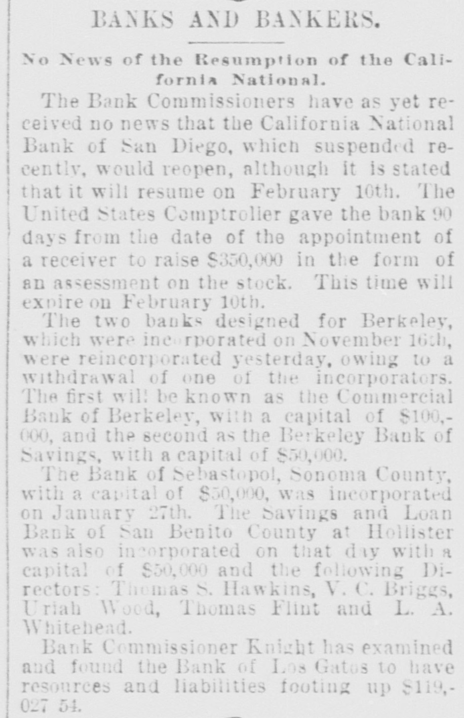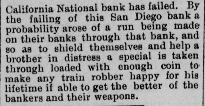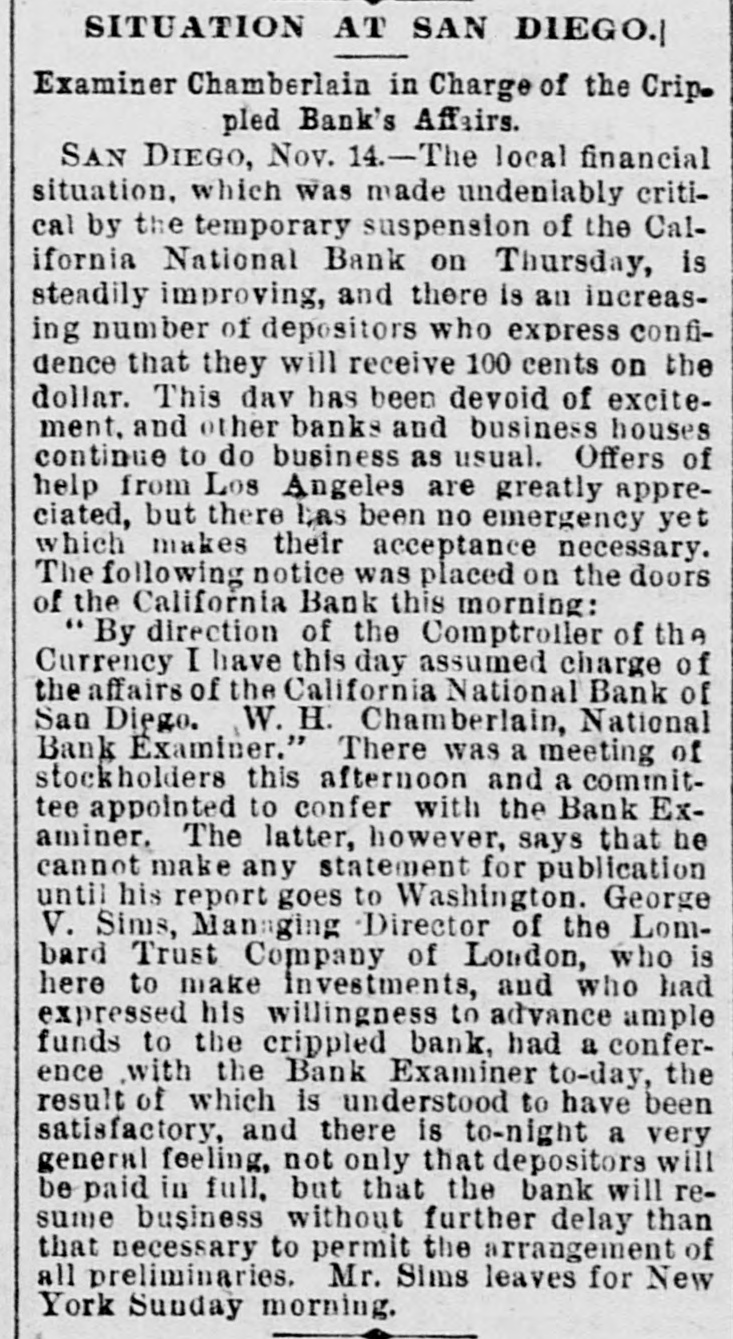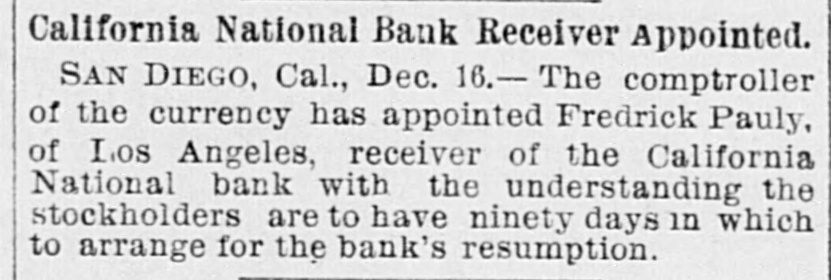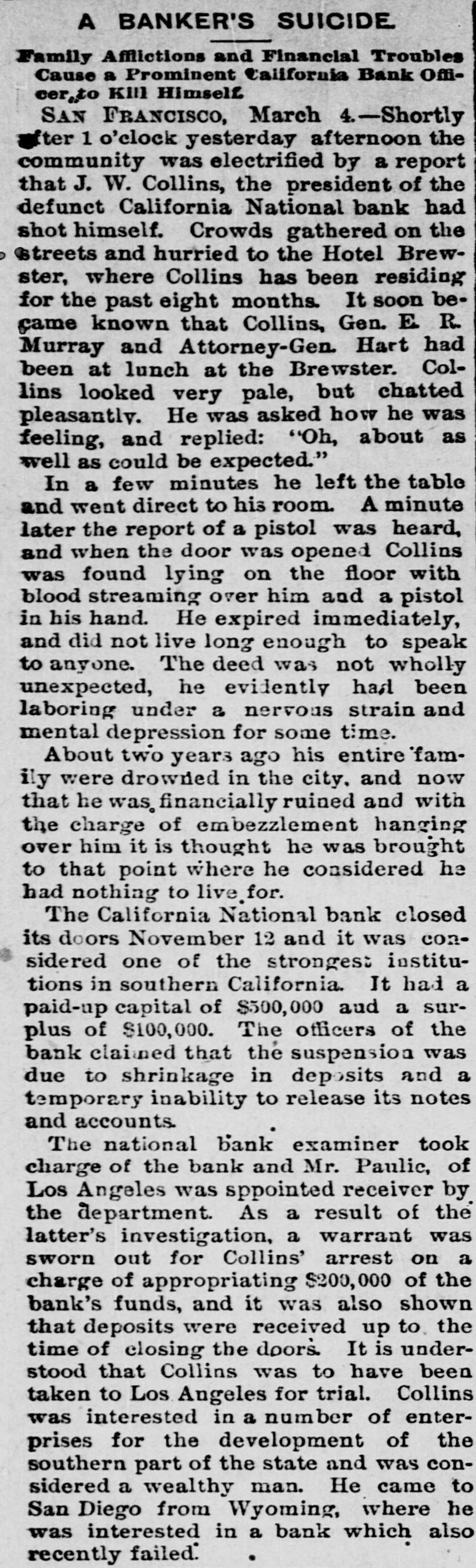 BAD FOR SAN DIEGO. A BIG BANK FAILURE THERE YESTERDAY. The California National Bank Closes Its Doors Yesterday-Cable Roads, Opera Houses and Hotels Not Profitable in the Baynclimate City. What has been anticipated for some ten days past in the commercial and financial world of Southern California came to pass yesterday. The California National bank of San Diego closed its doors. At 10 a.m. yesterday the following card appeared upon the doors of the institution Owing to continued shrinkage of deposits and our inability to promptly release on notes and accounts this bank is temporarily closed. The bank commissioner has been sent for, and will take charge on his arrival. In the meantime no business can be transacted. It is believed beyond question that depositors will be paid in full. This notice caused a sensation at San Diego, although it was a culmination long looked for by a few who were posted. From a well-known citizen of San Diego, who was in the city yesterday, some inside facts in relation to the failure of the bank were obtained. "The California National bank was considered to be one of the strongest financial institutions in this section of the state. It had a paid-up capital of $500,000 and a surplus of $100,000. Its deposits approximated $100,000. J. W. Collins was president; D. D. Dare, vicepresident; S. G. Havermale, second vice-president, and G. E. O'Brien, cashier. "In my opinion the failure is caused by speculation, investment in unfortunate and non-paying ventures and an endeavor to cover too much ground on a limited capital. "In the first place the bank had $80,000 in a brick yard; it backed the cable road, the new opera house, the Florence hotel purchase, the Horton house purchase, the Brewster hotel and numerous other schemes. "Of course all of these investments were dependent upon the prosperity of San Diego. The city has not prospered and as a consequence the institution backing all of these various enterprises has been forced to the wall. "In my opinion this will be the last straw that breaks the camel's back with us. We have been holding up under many discouragements, and priding ourselves on no bank failures. But now we have one which will have the effect of paralyzing business in San Diego." The news of the suspension of the California national bank was received in this city about 10 :30 yesterday morning by a number of local wholesale merchants. As near as can be learned no local firms will be losers as a result. Some fifteen or eighteen months ago D. D. Dare, an officer of the broken bank, left for Europe. It was reported at the time of his departure that he was away in an endeavor to regain his lost health. Mr. Collins, the president of the bank, also conducts a similar institution in Cheyenne, Wyoming. This is the largest bank failure that has occurred in Southern California in years. CASH SENT. Late last night, on what ought to be good authority, the HERALD learned that $130,000 in coin had been shipped by one or two of the Los Angeles banks to the crippled institution. The money was sent through Wells, Fargo & Co. it was said, and was quietely shipped in a well guarded car some time late last evening. The idea is that the managers of the weak San Diego bank were able to give sufficient security to the Los Angeles bankers, to justify this attempt to ride out the storm. No banks in this city had any amount at stake in the San Diego institution.