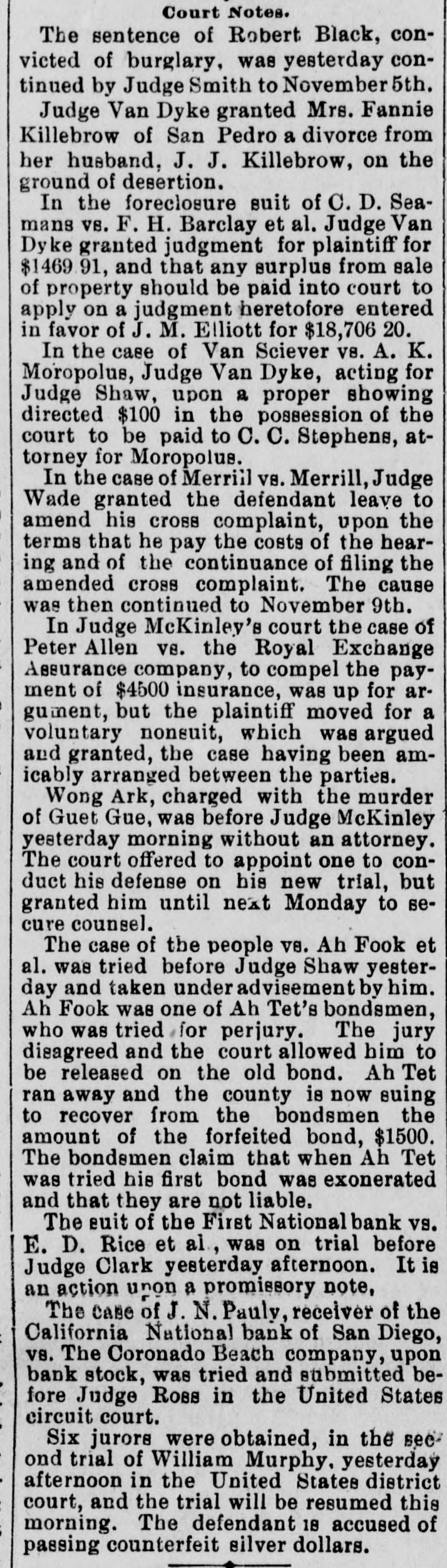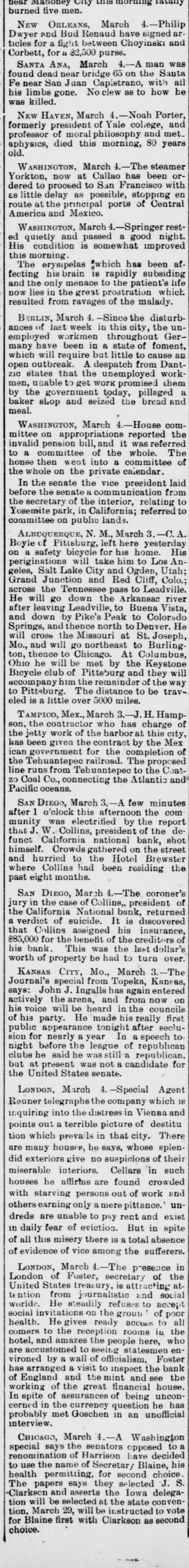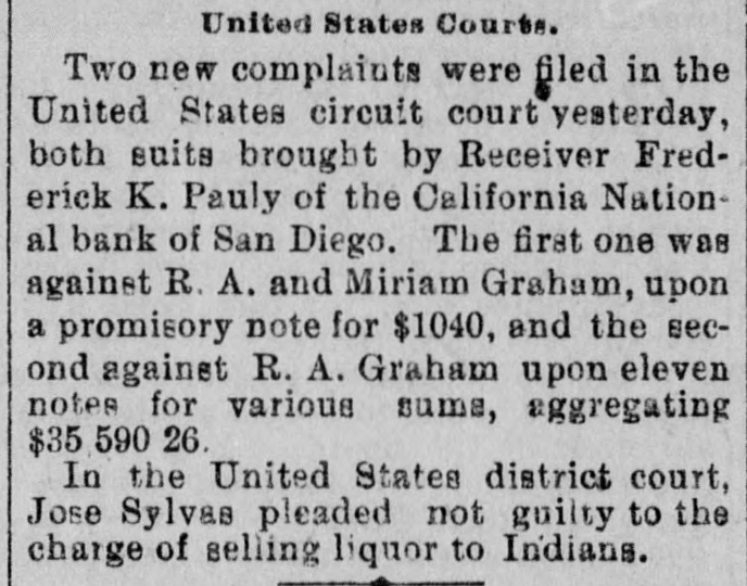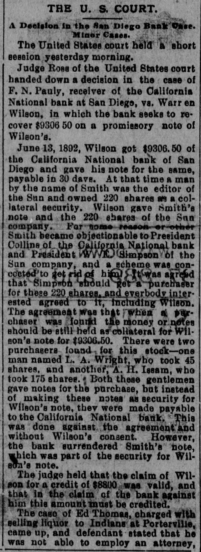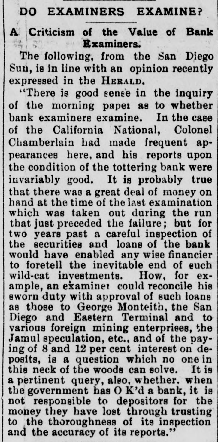 BAD FOR SAN DIEGO. A BIG BANK FAILURE THERE YESTERDAY. The California National Bank Closes Its Doors Yesterday-Cable Roads, Opera Houses and Hotels Not Profitable in the Baynclimate City. What has been anticipated for some ten days past in the commercial and financial world of Southern California came to pass yesterday. The California National bank of San Diego closed its doors. At 10 a.m. yesterday the following card appeared upon the doors of the institution Owing to continued shrinkage of deposits and our inability to promptly release on notes and accounts this bank is temporarily closed. The bank commissioner has been sent for, and will take charge on his arrival. In the meantime no business can be transacted. It is believed beyond question that depositors will be paid in full. This notice caused a sensation at San Diego, although it was a culmination long looked for by a few who were posted. From a well-known citizen of San Diego, who was in the city yesterday, some inside facts in relation to the failure of the bank were obtained. "The California National bank was considered to be one of the strongest financial institutions in this section of the state. It had a paid-up capital of $500,000 and a surplus of $100,000. Its deposits approximated $100,000. J. W. Collins was president; D. D. Dare, vicepresident; S. G. Havermale, second vice-president, and G. E. O'Brien, cashier. "In my opinion the failure is caused by speculation, investment in unfortunate and non-paying ventures and an endeavor to cover too much ground on a limited capital. "In the first place the bank had $80,000 in a brick yard; it backed the cable road, the new opera house, the Florence hotel purchase, the Horton house purchase, the Brewster hotel and numerous other schemes. "Of course all of these investments were dependent upon the prosperity of San Diego. The city has not prospered and as a consequence the institution backing all of these various enterprises has been forced to the wall. "In my opinion this will be the last straw that breaks the camel's back with us. We have been holding up under many discouragements, and priding ourselves on no bank failures. But now we have one which will have the effect of paralyzing business in San Diego." The news of the suspension of the California national bank was received in this city about 10 :30 yesterday morning by a number of local wholesale merchants. As near as can be learned no local firms will be losers as a result. Some fifteen or eighteen months ago D. D. Dare, an officer of the broken bank, left for Europe. It was reported at the time of his departure that he was away in an endeavor to regain his lost health. Mr. Collins, the president of the bank, also conducts a similar institution in Cheyenne, Wyoming. This is the largest bank failure that has occurred in Southern California in years. CASH SENT. Late last night, on what ought to be good authority, the HERALD learned that $130,000 in coin had been shipped by one or two of the Los Angeles banks to the crippled institution. The money was sent through Wells, Fargo & Co. it was said, and was quietely shipped in a well guarded car some time late last evening. The idea is that the managers of the weak San Diego bank were able to give sufficient security to the Los Angeles bankers, to justify this attempt to ride out the storm. No banks in this city had any amount at stake in the San Diego institution.